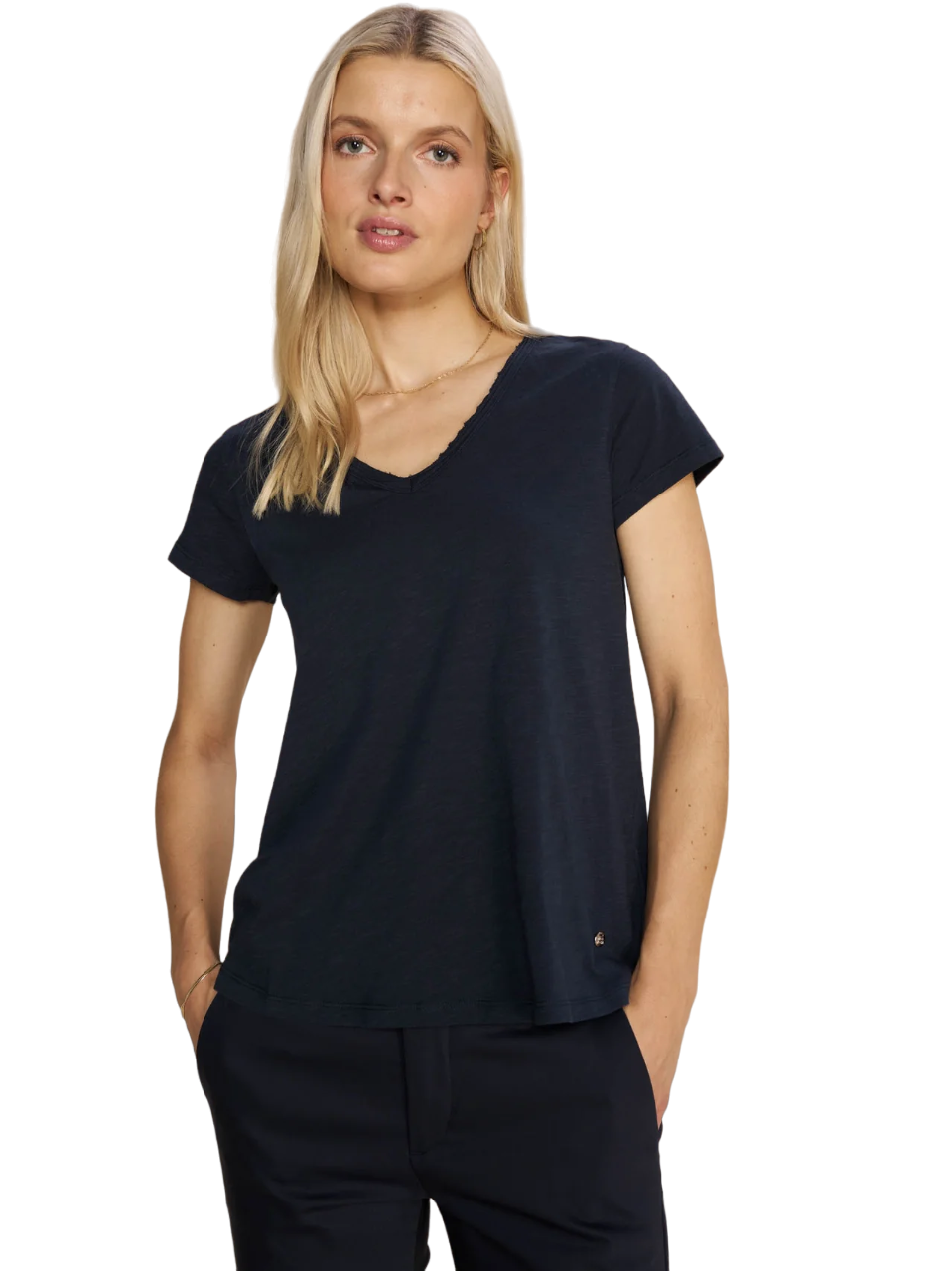 Styckpris / perMörkblå V-ringad T-shirt från Mos Mosh. Avslappnad passform, korta ärmar och logga broderat i nacken.