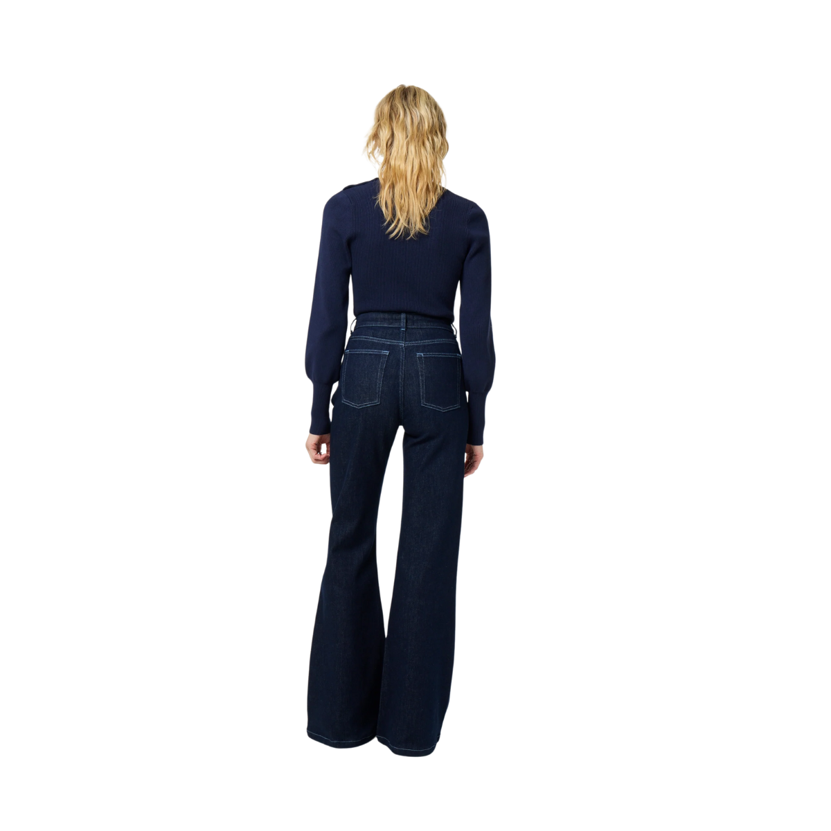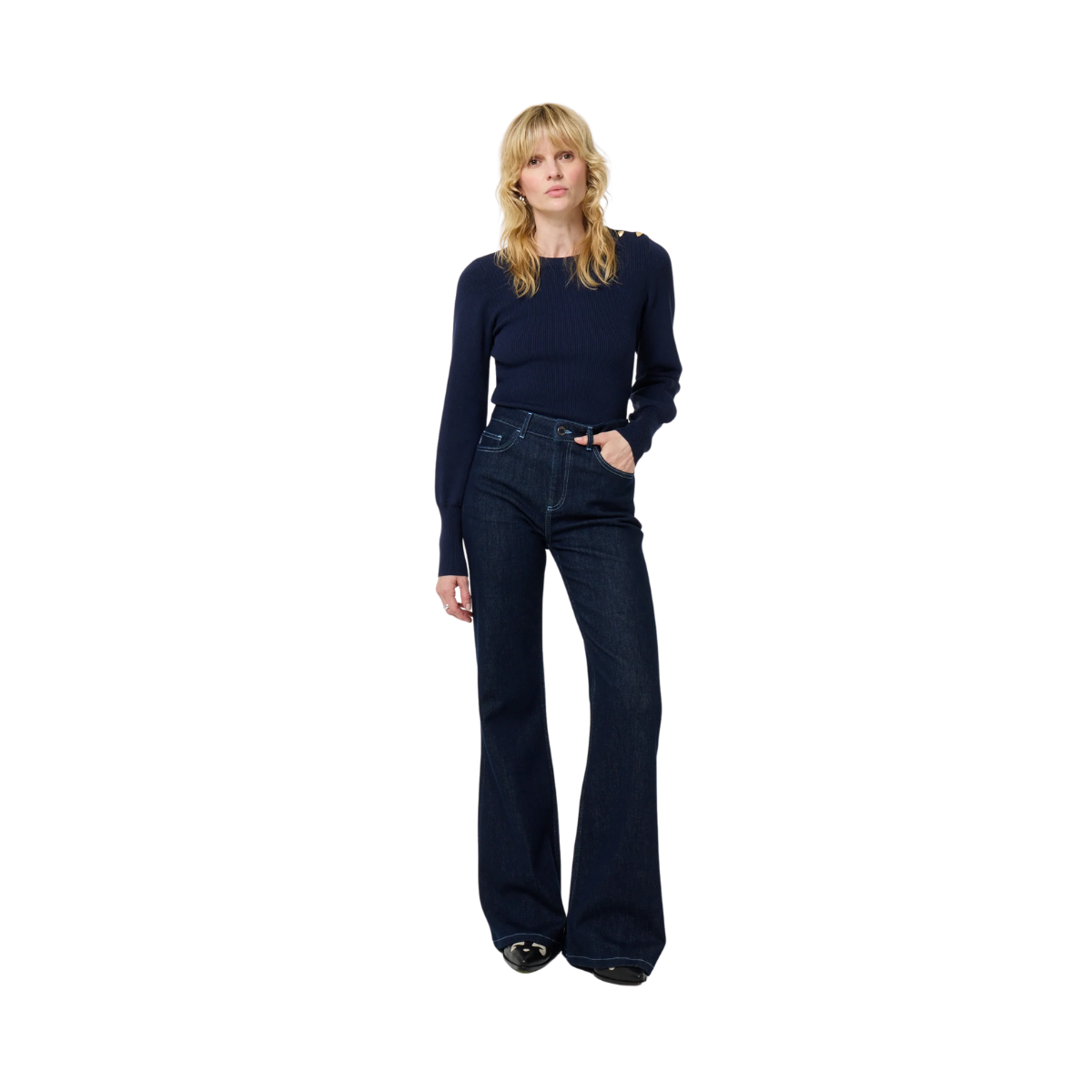 Bootcut-jeans i djup indigoblå med smickrande midja och subtil utsvängning från knät. Tillverkade i slitstark denim med lite stretch för både komfort och form. En tidlös siluett som enkelt matchas med allt från boots till sneakers.
