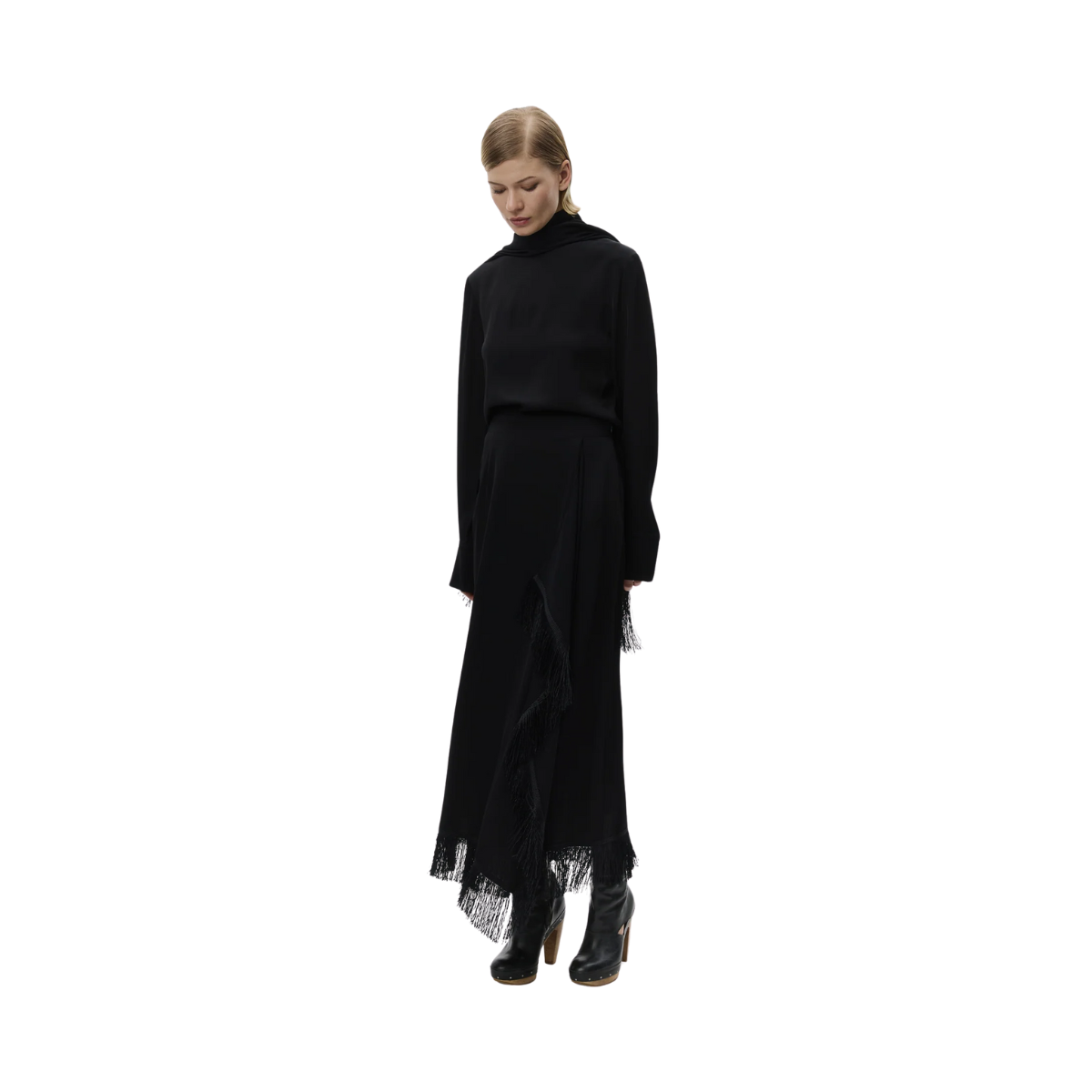 Denna tunikatopp med hög hals har knäppning baktill, stora manschetter och slitsar i sidorna. Den är semi-figursydd och levereras med en avtagbar, fransad scarf som ger en elegant och flexibel styling.