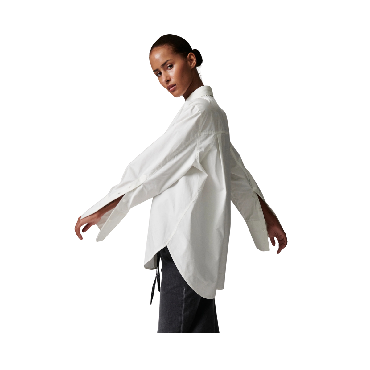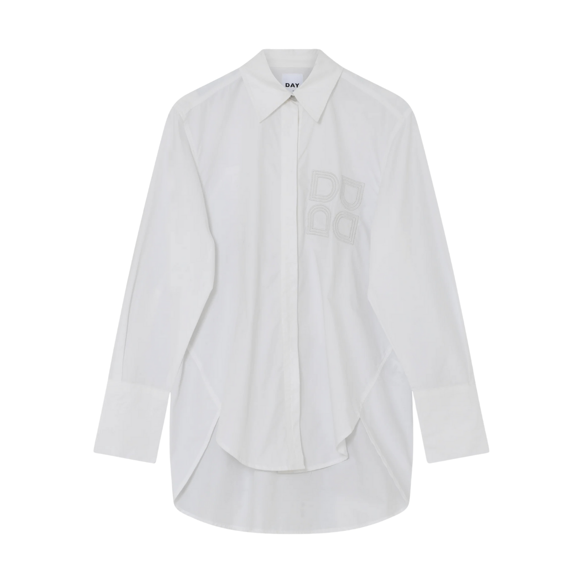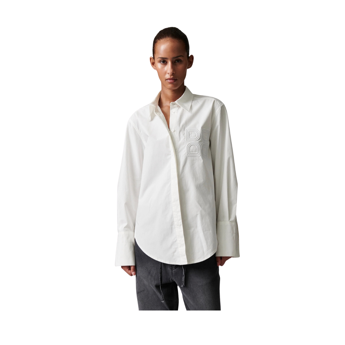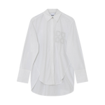 Denna krispiga skjorta med knäppning framtill har en broderad logotyp på bröstet, rundad nederkant och generösa, oversized manschetter. En tidlös och stilren modell som enkelt kan stoppas ned i mörka jeans eller bäras med en A-linjekjol för en klassisk och elegant look.