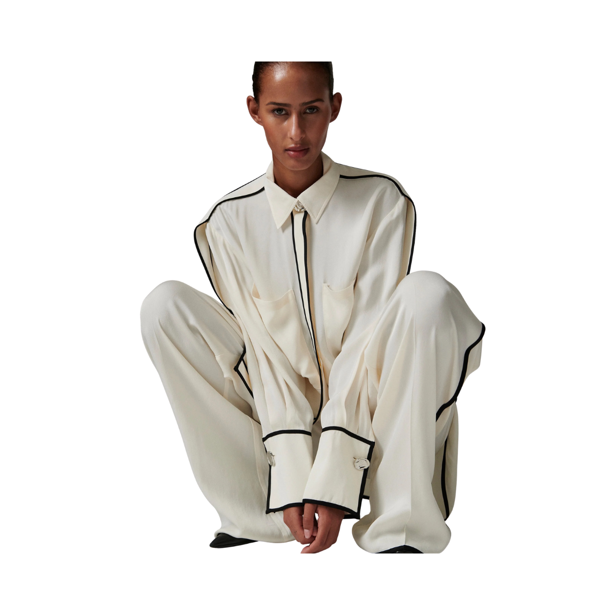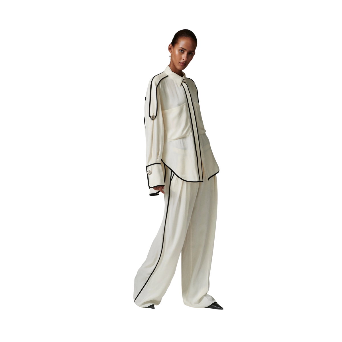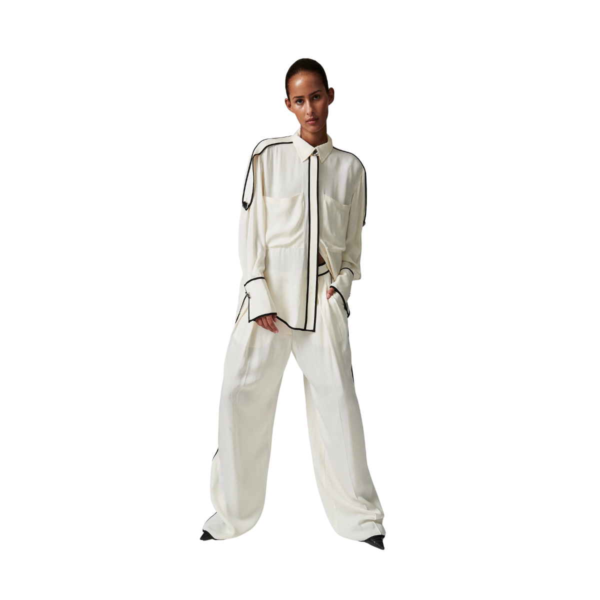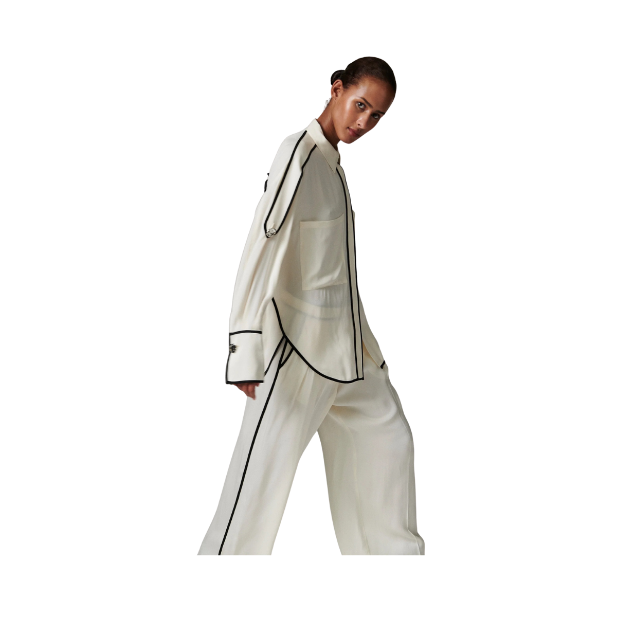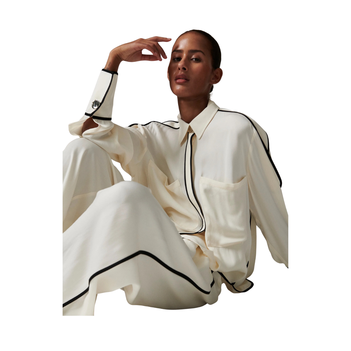 Denna följsamma skjorta med knäppning framtill har kontrasterande passpoaler, epåletter på axlarna och en lätt nedhasad fåll baktill. Två bröstfickor ger en funktionell touch. Tack vare det mjuka materialet och de rena linjerna blir toppen ett elegant och uttrycksfullt tillskott till garderoben.
