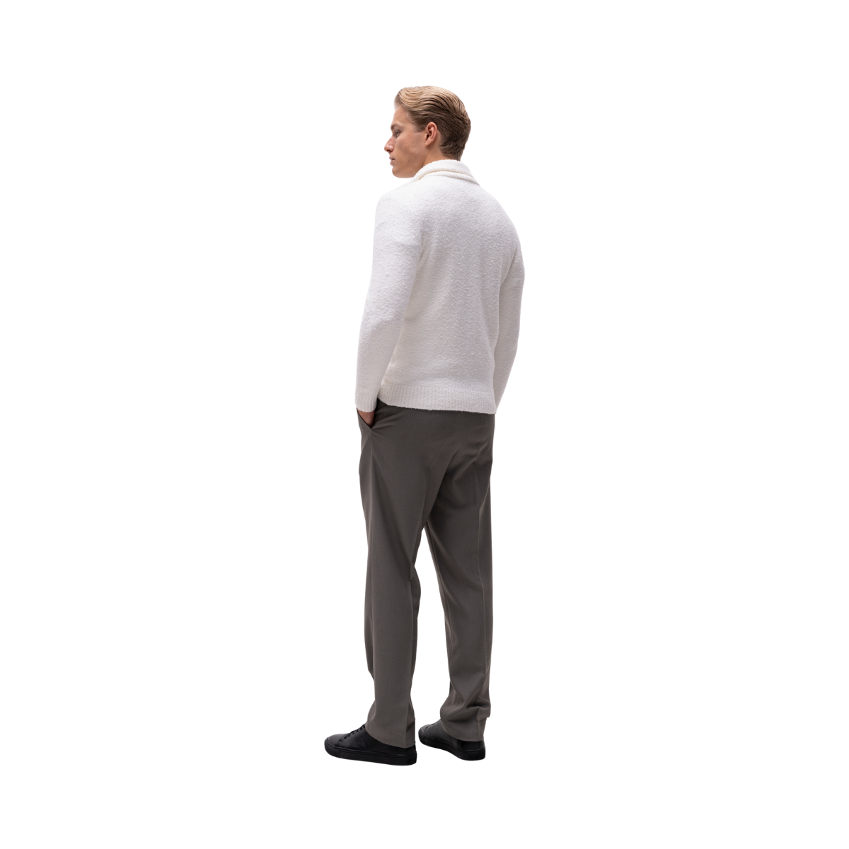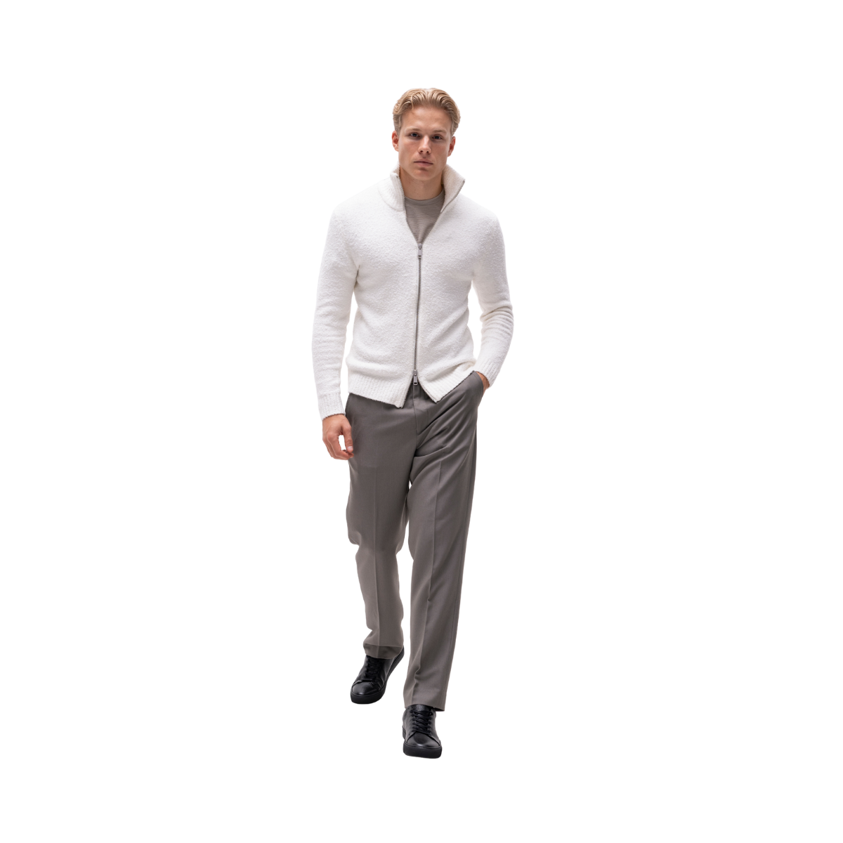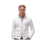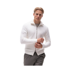 En stickad kofta/överdel med dubbeldragkedja fram, designad för både stil och funktion. Den har hög krage som kan stängas hela vägen, ribbade detaljer vid ärmslut och längs nederkant som ger en strukturerad och sofistikerad siluett. Kan både matchas till jeans eller chinos.