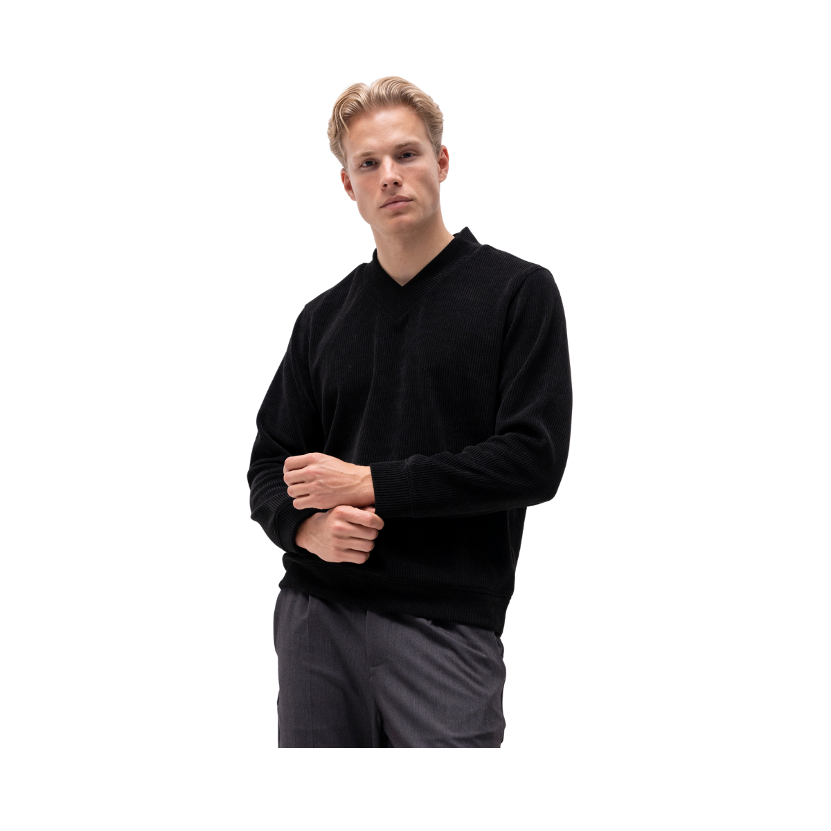 Ribbstickad tröja i mjuk manchester-textur med klassisk V-ringning och markerad krage som ger en stilren och tidlös look. Perfekt för komfort och layering, både till vardags och mer uppklädda tillfällen.