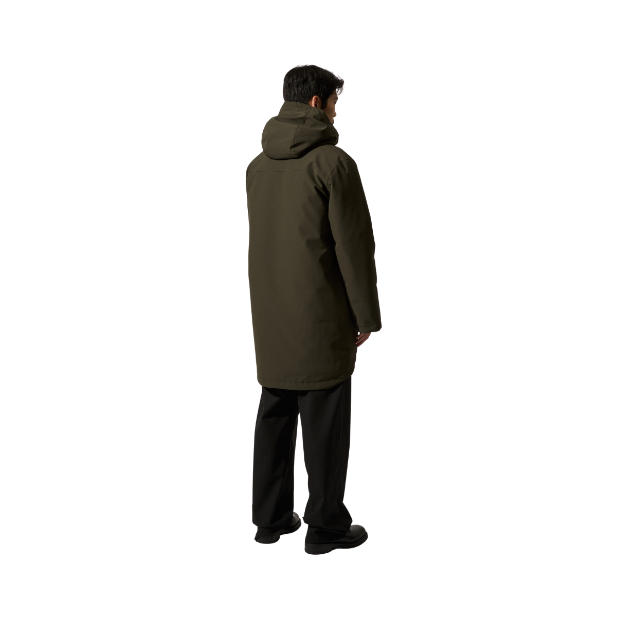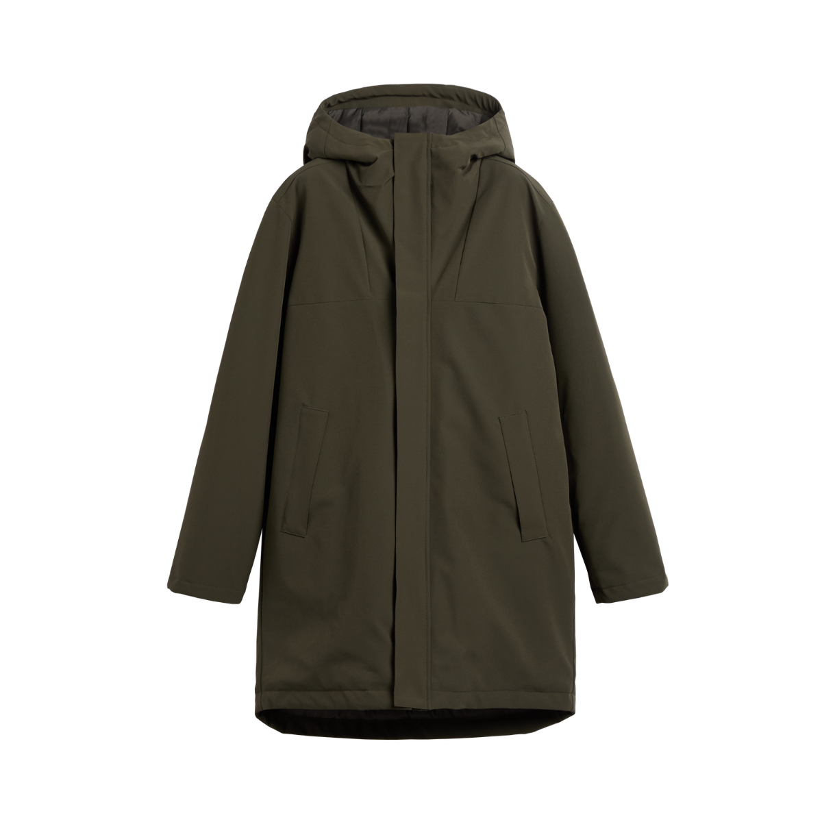 En modern parkas inspirerad av klassisk brittisk workwear. Jackan har dold tvåvägsdragkedja med tryckknappar, vadderad huva med dragsko, sidofickor med dragkedja samt innerfickor. Den raka, något längre passformen ger både stil och skydd mot väder och vind – perfekt för höst och vinter.