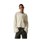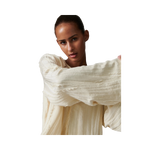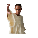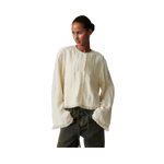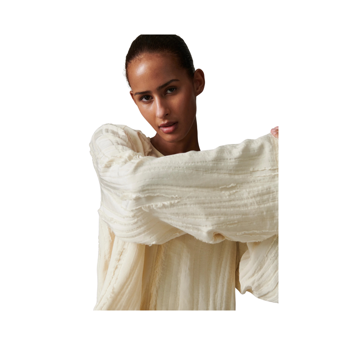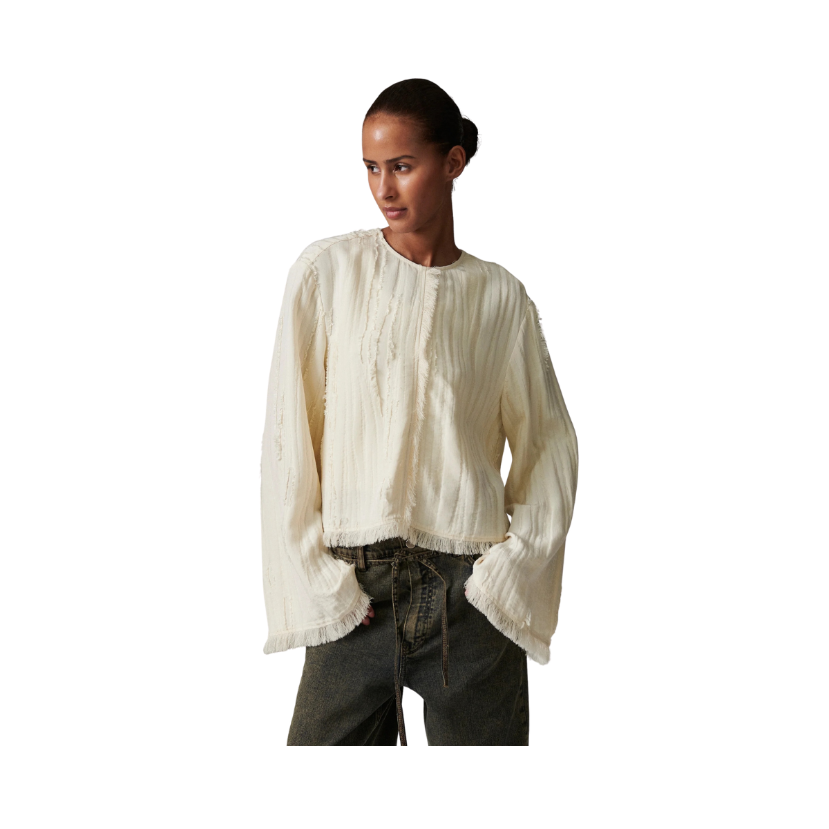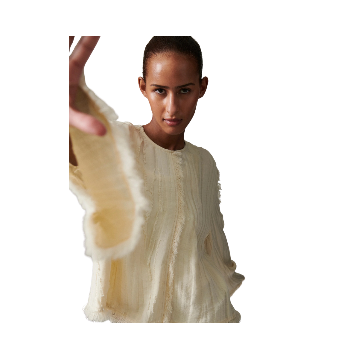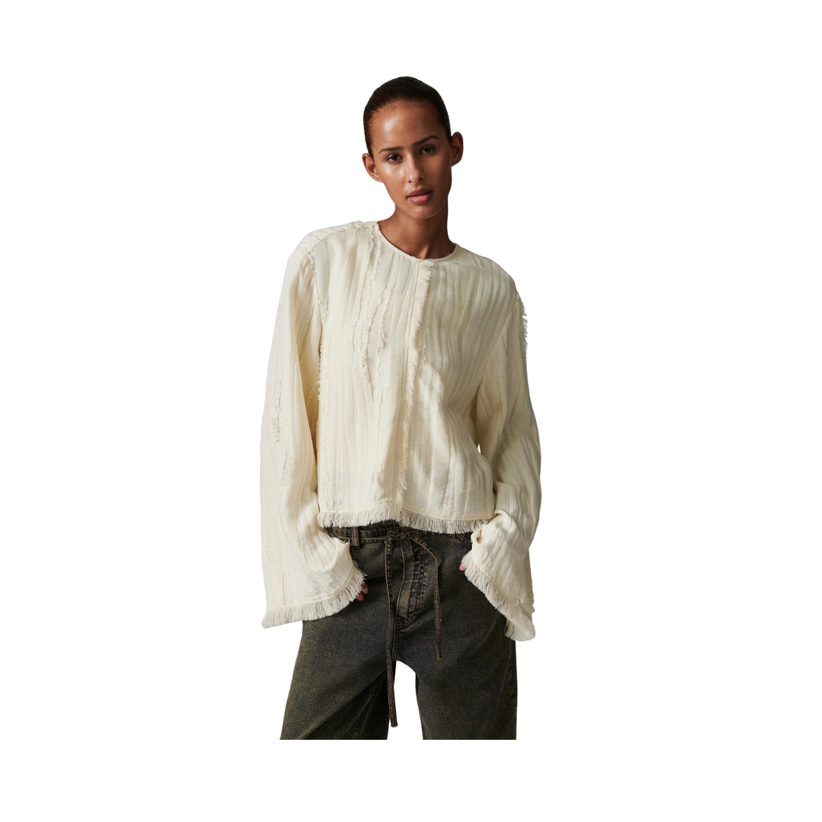 Denna topp har en fransad struktur över hela plagget, nyckelhål med knappstängning i ryggen och sidofickor vid ärmarna. Det finns fransar längs fåll och ärmslut. Toppen har en lös passform.