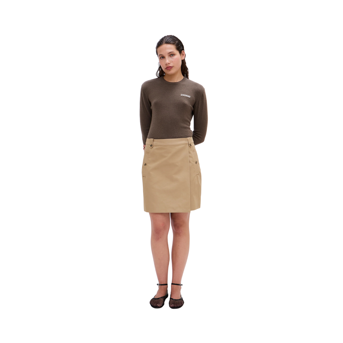 Sierron från 2ndday är en skarp och stilren minikjol med en omlottdesign framtill och en säker hakhylsestängning. Den har två sidofickor med knappar för en funktionell och elegant touch. Kjolen är helt fodrad och har en regular fit som gör den perfekt för både vardag och mer dressade tillfällen.
