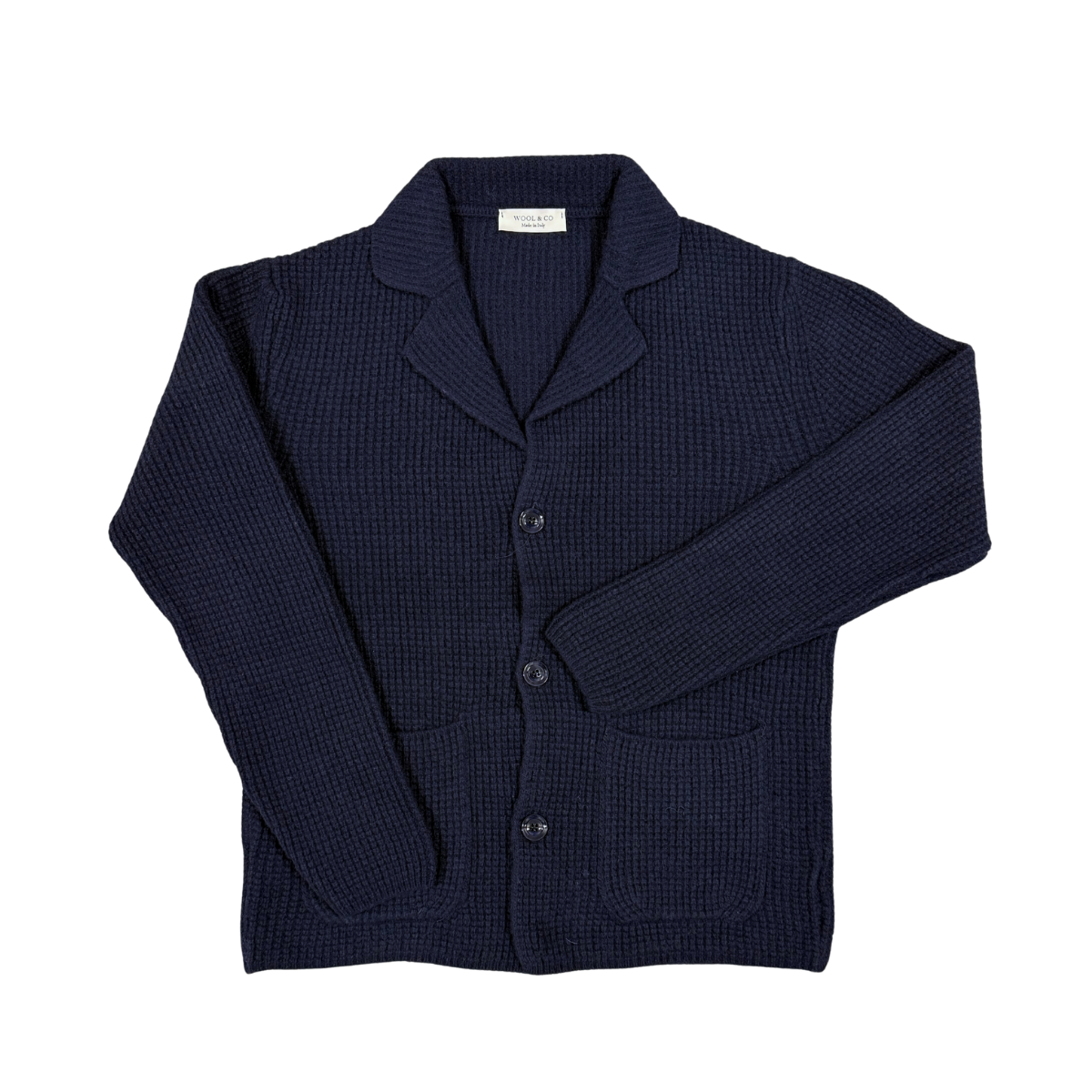 Stickad kofta med v-ringning, krage och klassisk knappstängning framtill. Den har en normal passform, två frontfickor och en stilren våffelstickad struktur som ger karaktär och textur. Ett mångsidigt plagg i tidlös design – perfekt för lager-på-lager.
