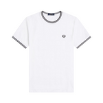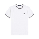 En klassisk t-shirt med dubbla ränder vid krage och ärmslut. Tillverkad i mjuk bomull med klassisk passform. Kortärmad modell med rund halsringning och broderad logotyp på vänster bröst.