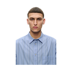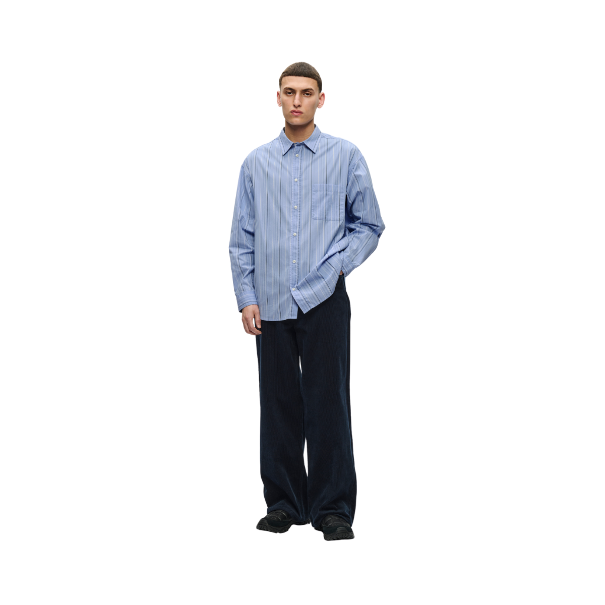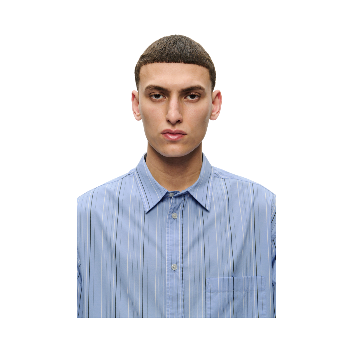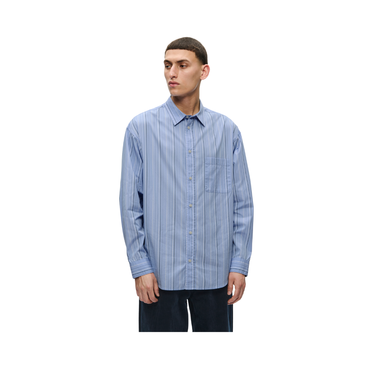 En avslappnad, randig button-down-skjorta i bomull med loose-fit och klassisk Kent-krage. Mönstret i ton‑i‑ton-ränder skapar en modern, men ändå tidlös look, medan bröstficka och knappslå ger praktisk funktion. Perfekt balans mellan avslappnad streetwear och skandinavisk minimalism.
