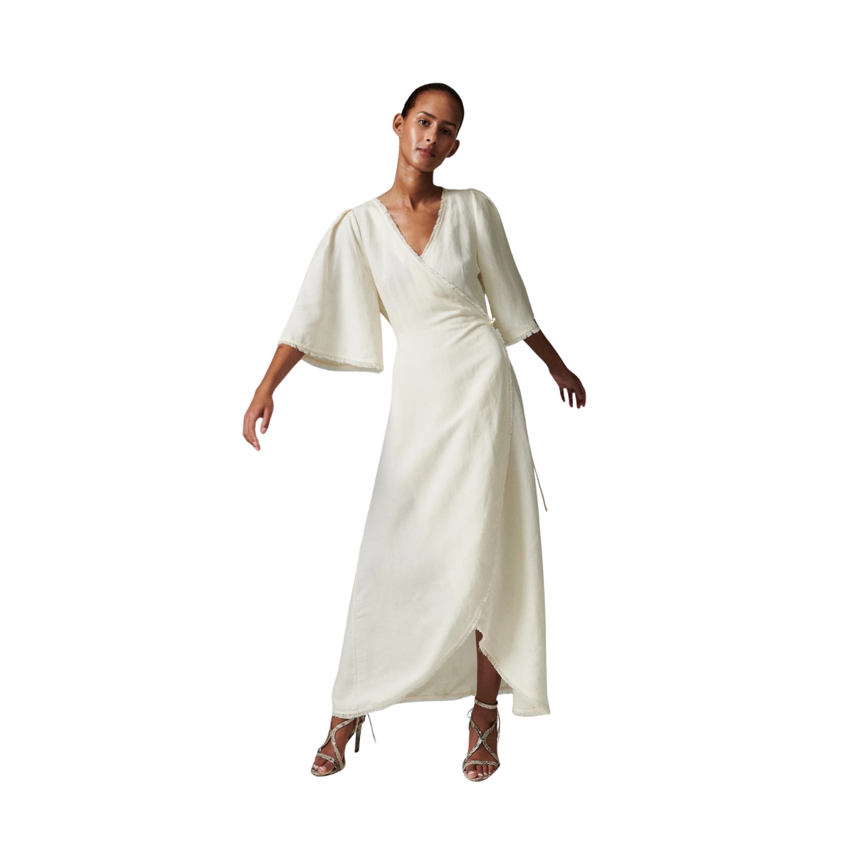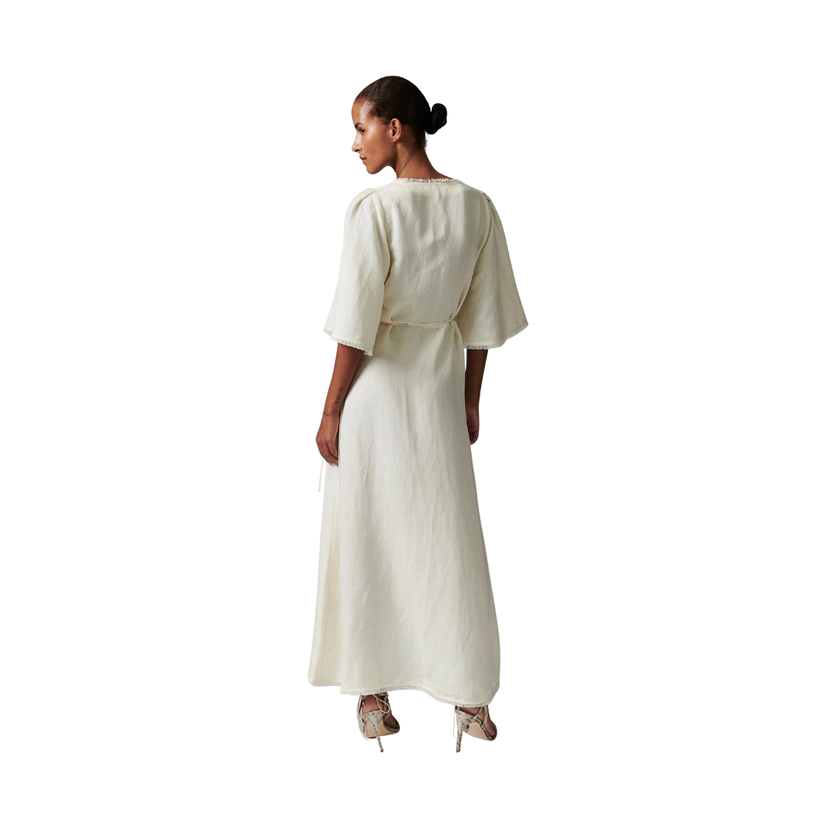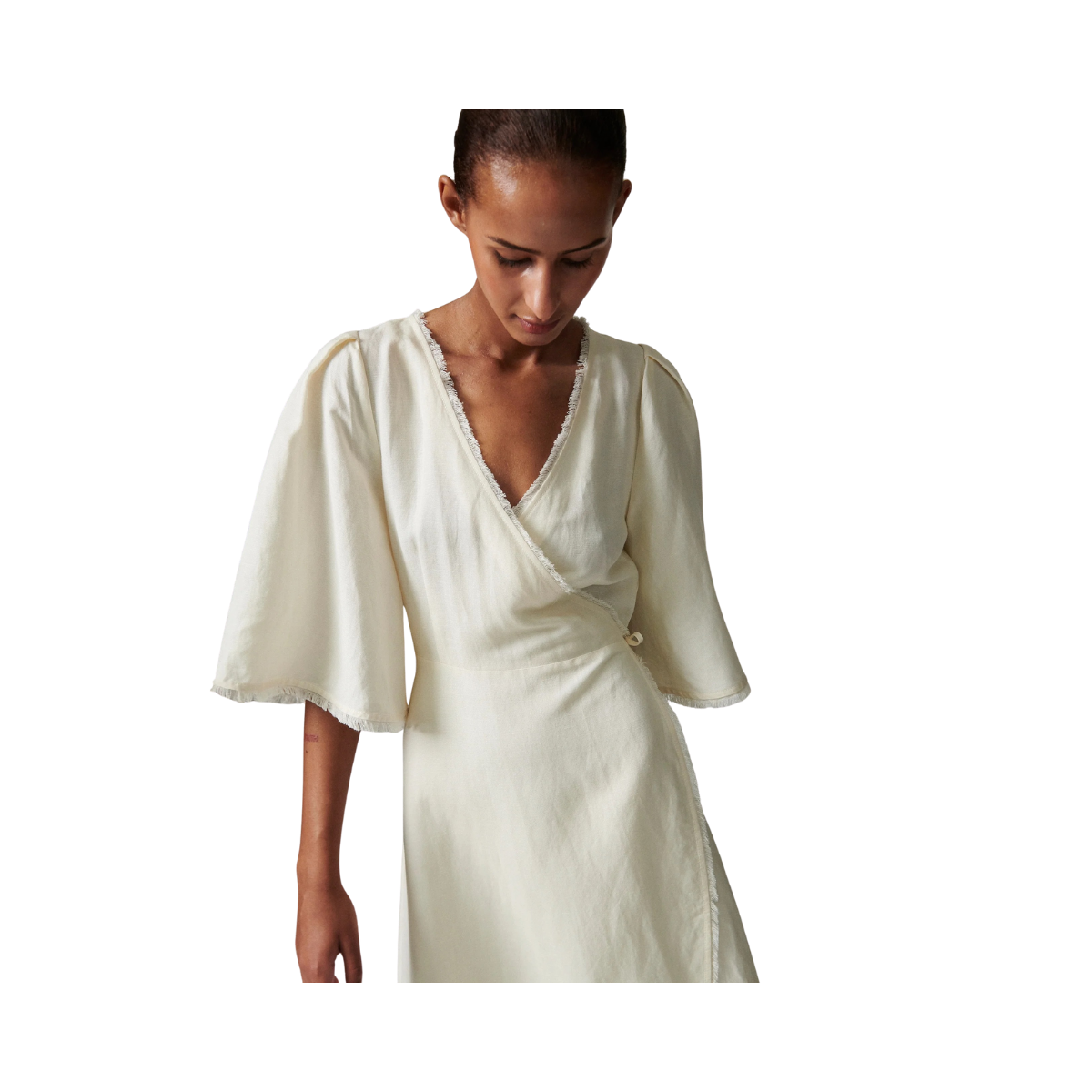 Denna klassiska omlottklänning i linne har ett elegant och tidlöst uttryck. Klänningen är designad med ett tunt knytband som löper genom insidan och knyts i sidan för en smickrande passform. Den djupa V-ringningen ger en feminin silhuett, medan fransdetaljer längs kanterna tillför en subtil, trendig touch. Bär denna mångsidiga garderobsklassiker tillsammans med en grovstickad kofta för en mysig men samtidigt uppklädd look.