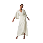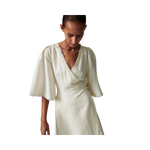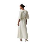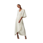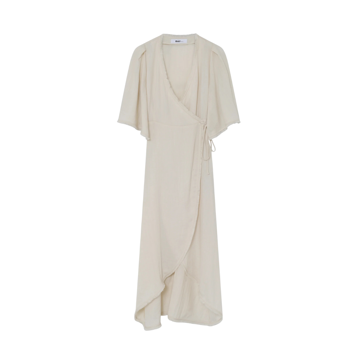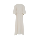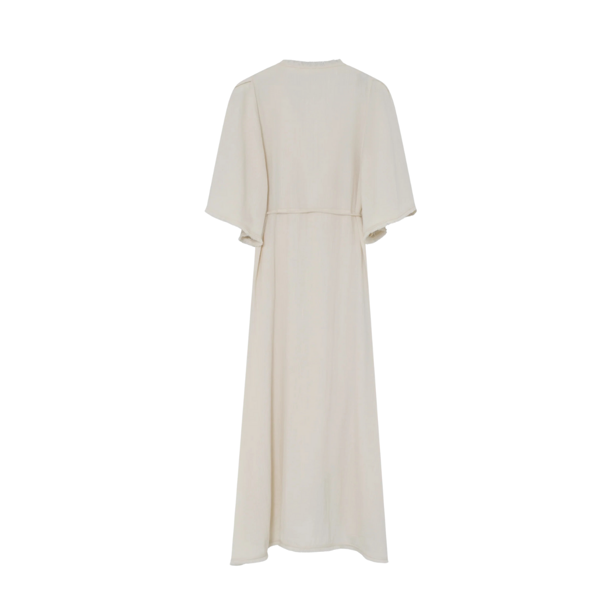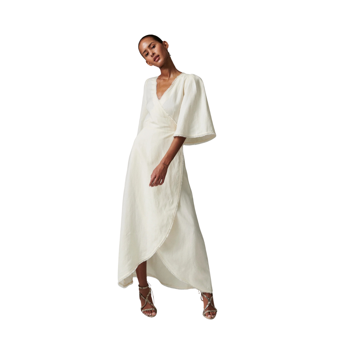Denna klassiska omlottklänning i linne har ett elegant och tidlöst uttryck. Klänningen är designad med ett tunt knytband som löper genom insidan och knyts i sidan för en smickrande passform. Den djupa V-ringningen ger en feminin silhuett, medan fransdetaljer längs kanterna tillför en subtil, trendig touch. Bär denna mångsidiga garderobsklassiker tillsammans med en grovstickad kofta för en mysig men samtidigt uppklädd look.