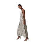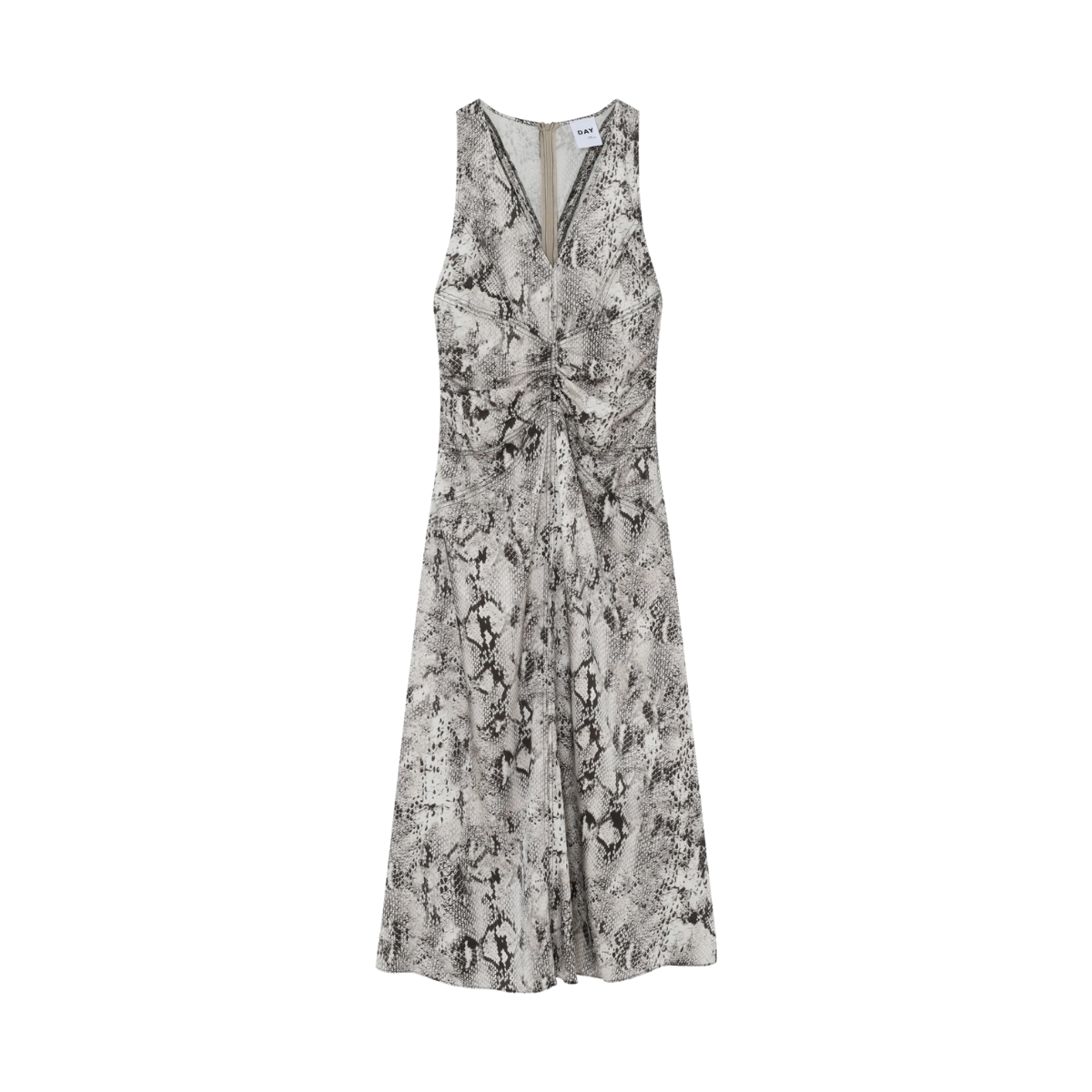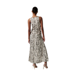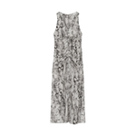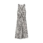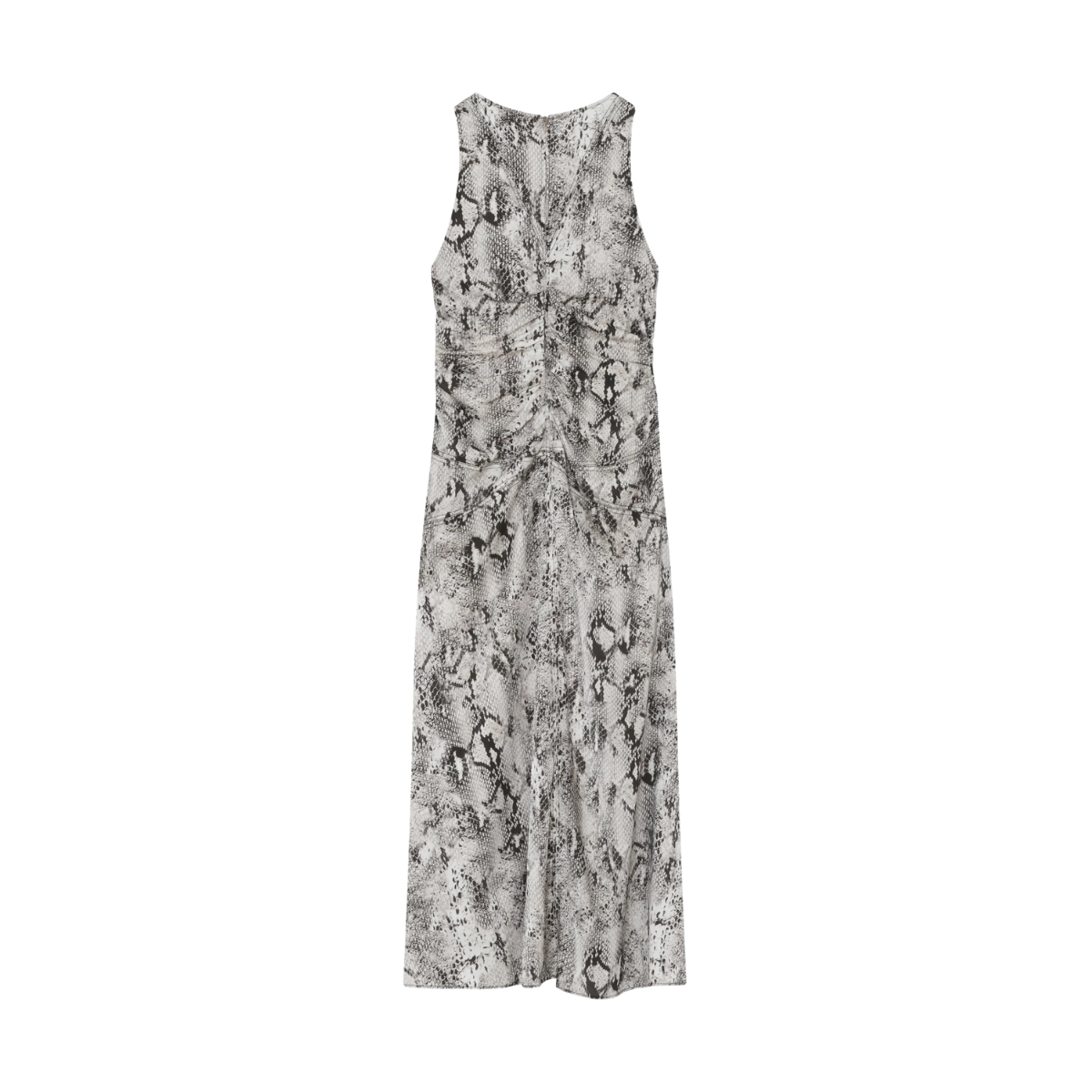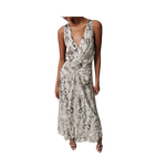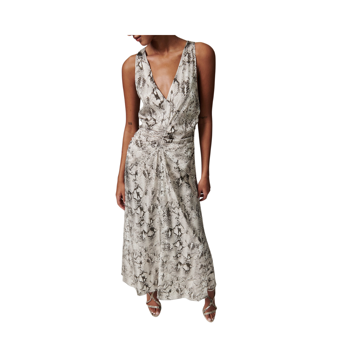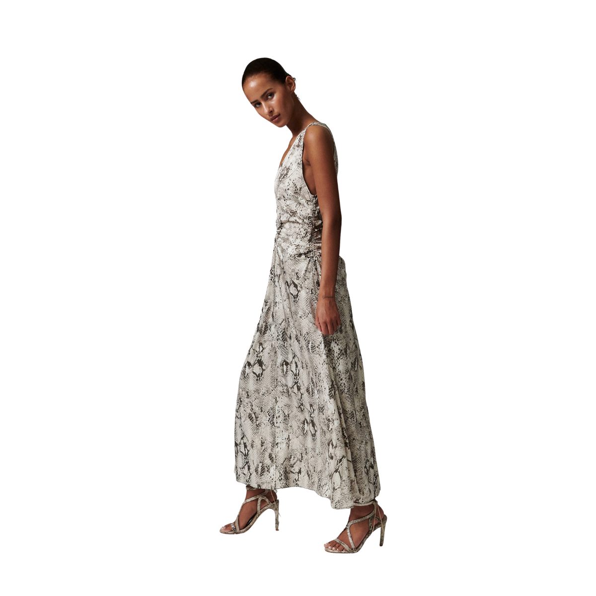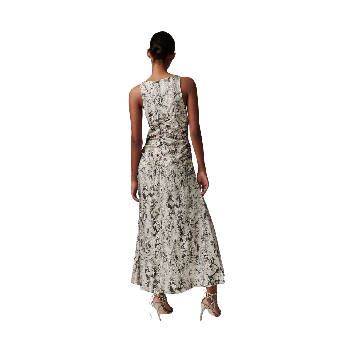Denna ärmlösa klänning till ankeln har en A-linjeformad kjol med diskret veckning, blixtlåsstängning bak och V-ringning. Klänningen har rynkdetaljer i sidorna och mitt på kroppen, samt lätt stretch i tyget som ger både komfort och en smickrande passform. Materialets subtila glans ger en eterisk känsla, och för en mer nedtonad stil kan den kombineras med en blazer och kitten heels.