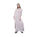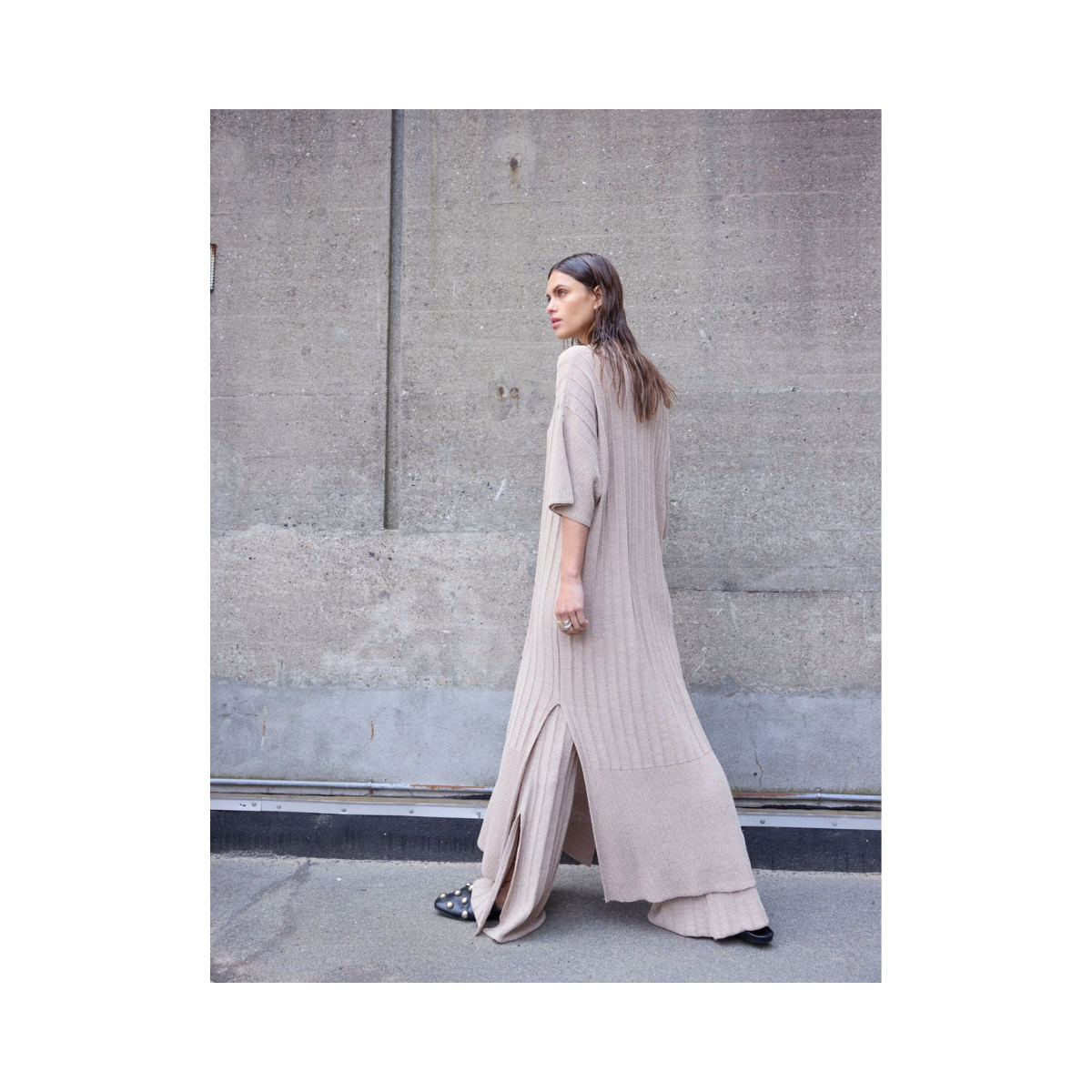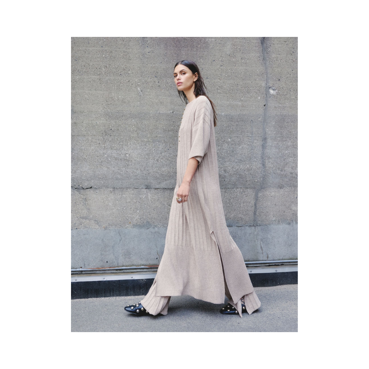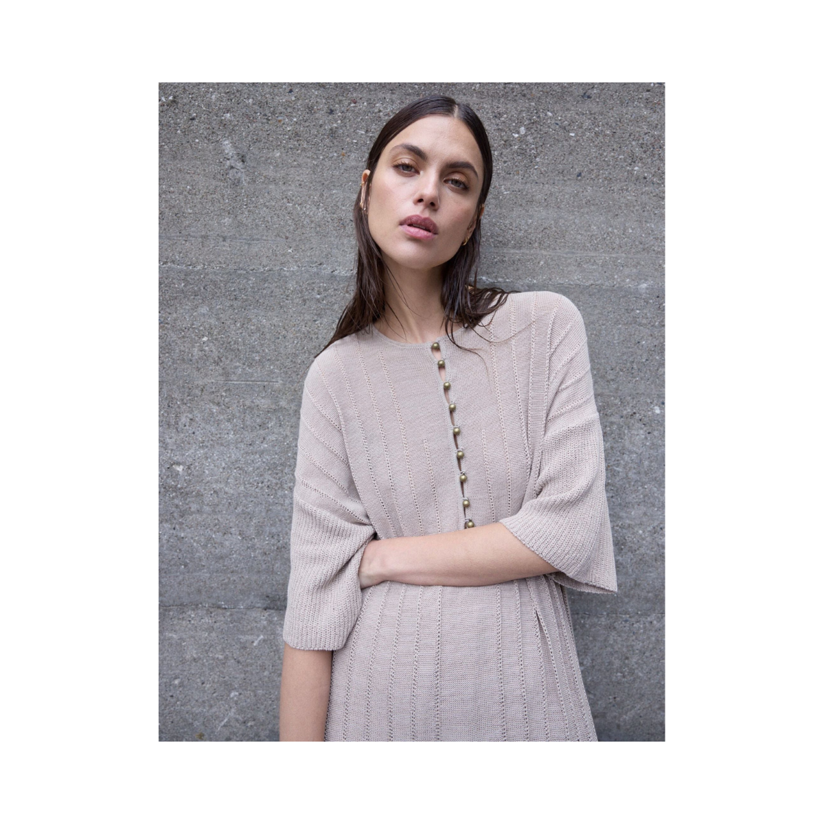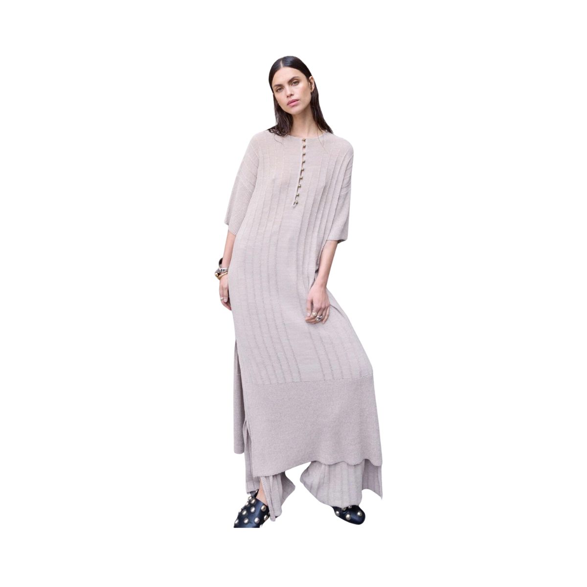 Denna löst sittande, ribbstickade klänning i vadlängd kombinerar komfort med en avslappnat elegant stil. Klänningen har slitsar i sidorna som ger extra rörelse och en luftig känsla, samt knappar framtill vid bysten som skapar en feminin och stilren detalj.