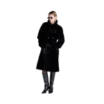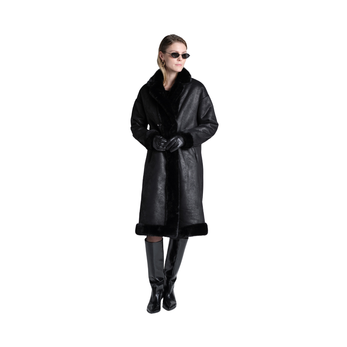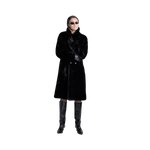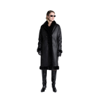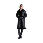 En svart kappa med dubbelknäppning framtill och sidfickor. Den är reversibel – ena sidan heltäckt med mjuk fuskpäls, andra sidan i läderliknande material med fuskpälsdetaljer längs kanterna. Kappan har mellanlång längd och slutar vid knäna, vilket ger både värme och en elegant siluett.