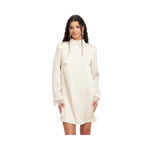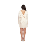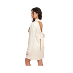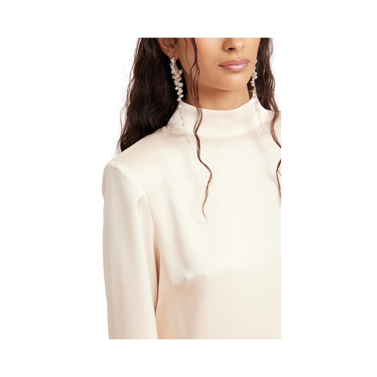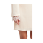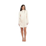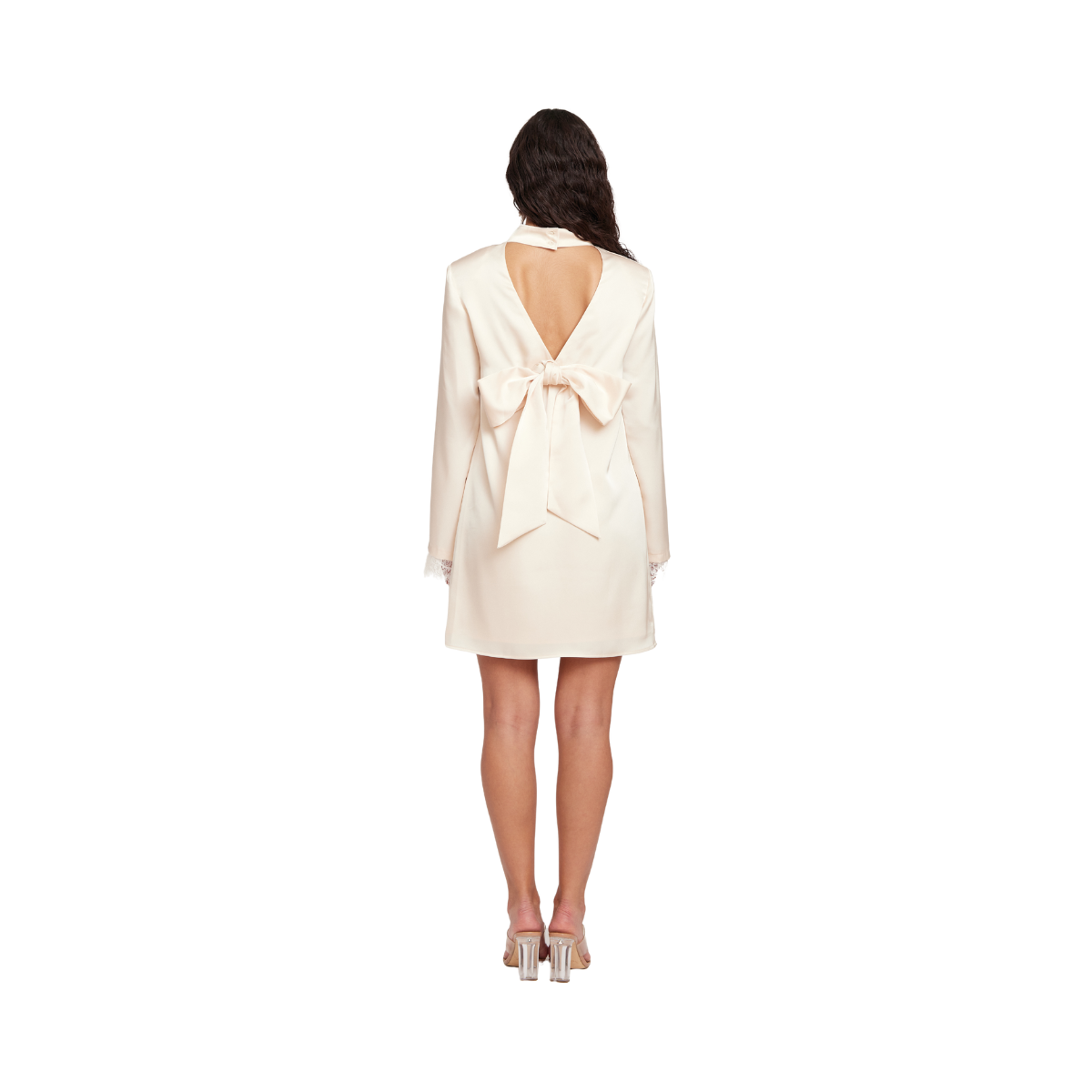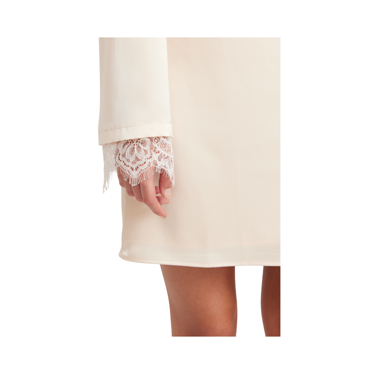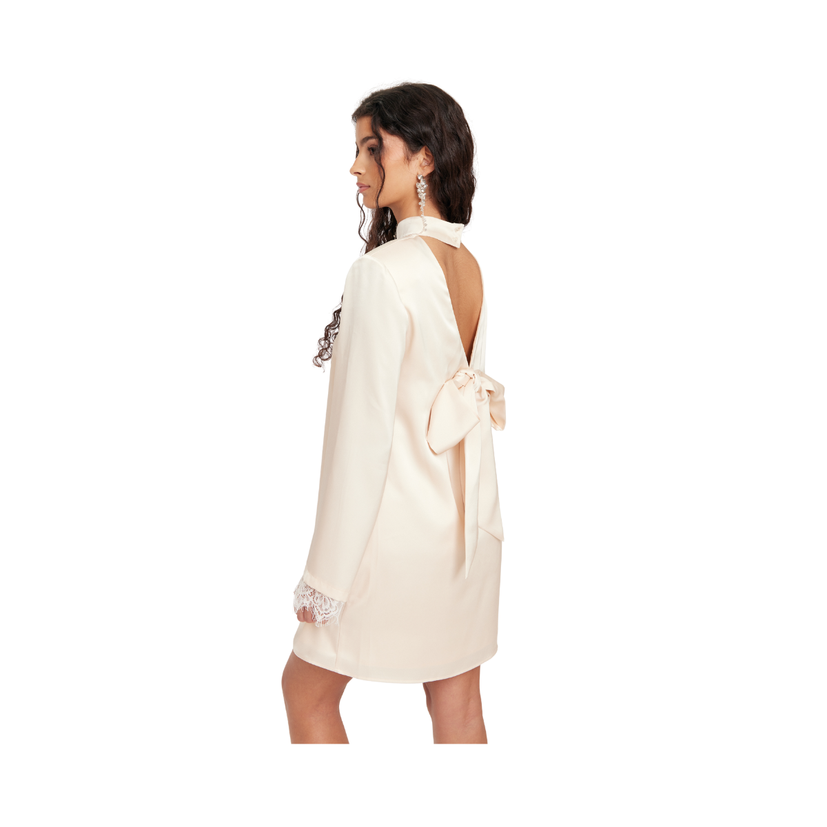 En drömmig, kort klänning i en skimrande champagneton med eleganta detaljer. De långa ärmarna har spetsdetaljer vid ärmsluten, och den höga halsen knäpps baktill med hela 2 knappar – en romantisk detalj som fångar blicken. Ryggen har en djup v-ringning och pryds av en stor rosett som ger klänningen en feminin och exklusiv finish.