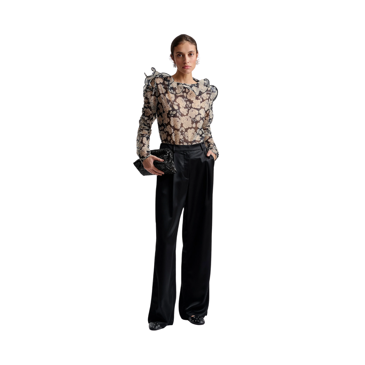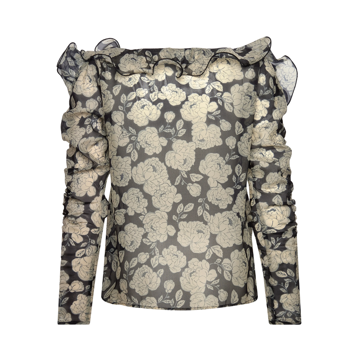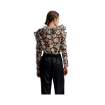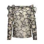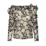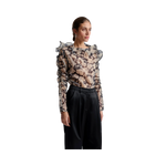 Denna eleganta blus från Malina har ett vackert blommönster och en smickrande båthalsringning. Organzatygget ger en feminin känsla, medan volangerna på axlarna skapar en romantisk touch. Långa ärmar gör den perfekt för lager-på-lager, och den normala passformen ger komfort hela dagen.