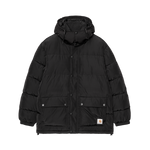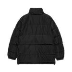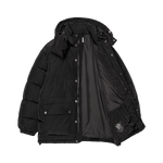 En vadderad jacka i återvunnen nylon med avtagbar huva och hög krage. Jackan har två stora frontfickor med lock och tryckknappar, samt dold dragkedja med knappslå för extra skydd mot vind. Den raka passformen och det mjuka yttertyget gör den både praktisk och bekväm till vardags. Ärmarna avslutas med elastiska muddar och en logopatch sitter framtill.