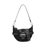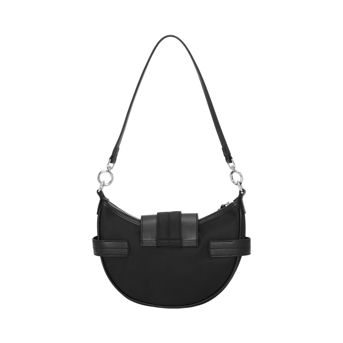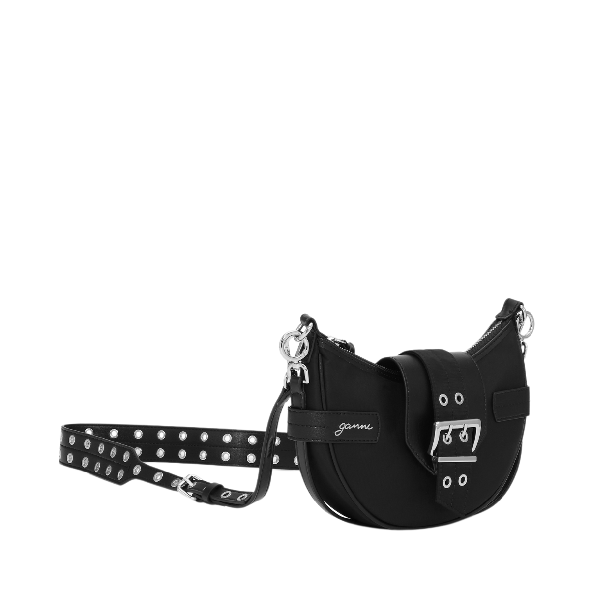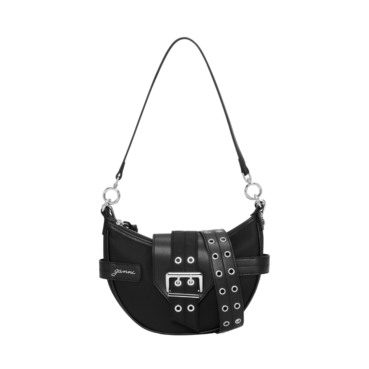 Svart väska från Ganni. Tillverkad i återvunnen nylon. Väskan är liten, har axelband och dragkedja.