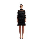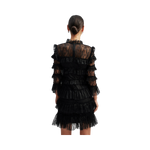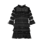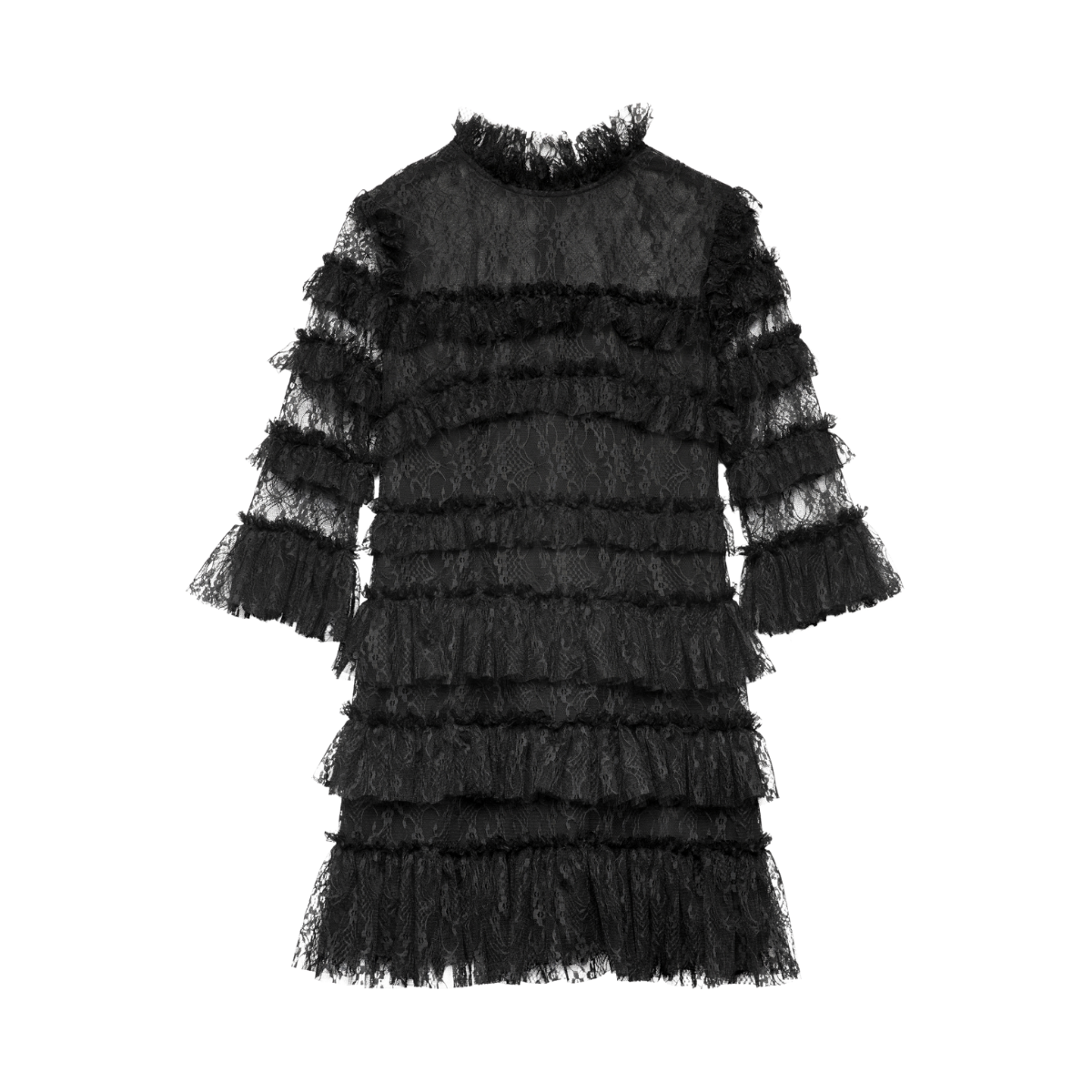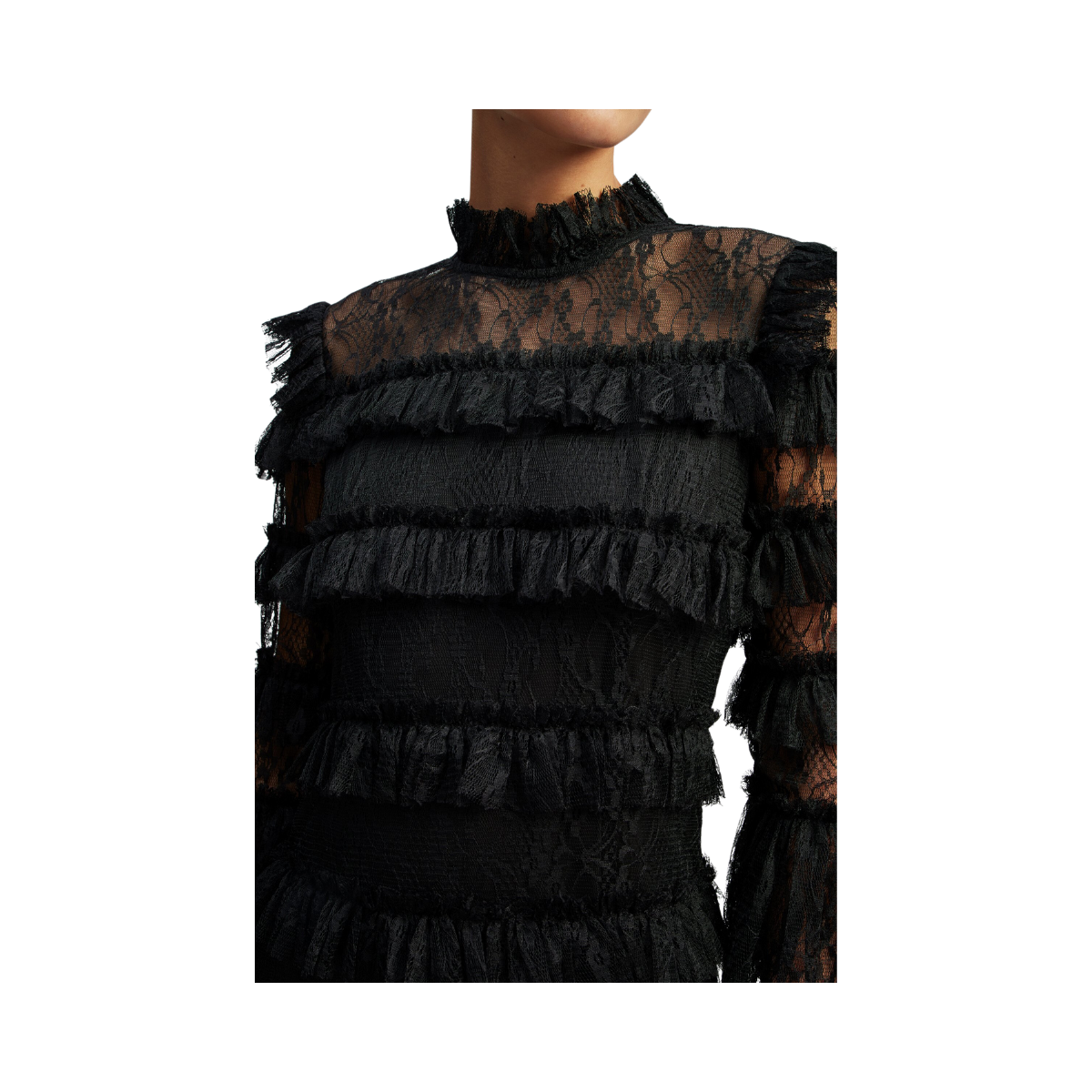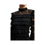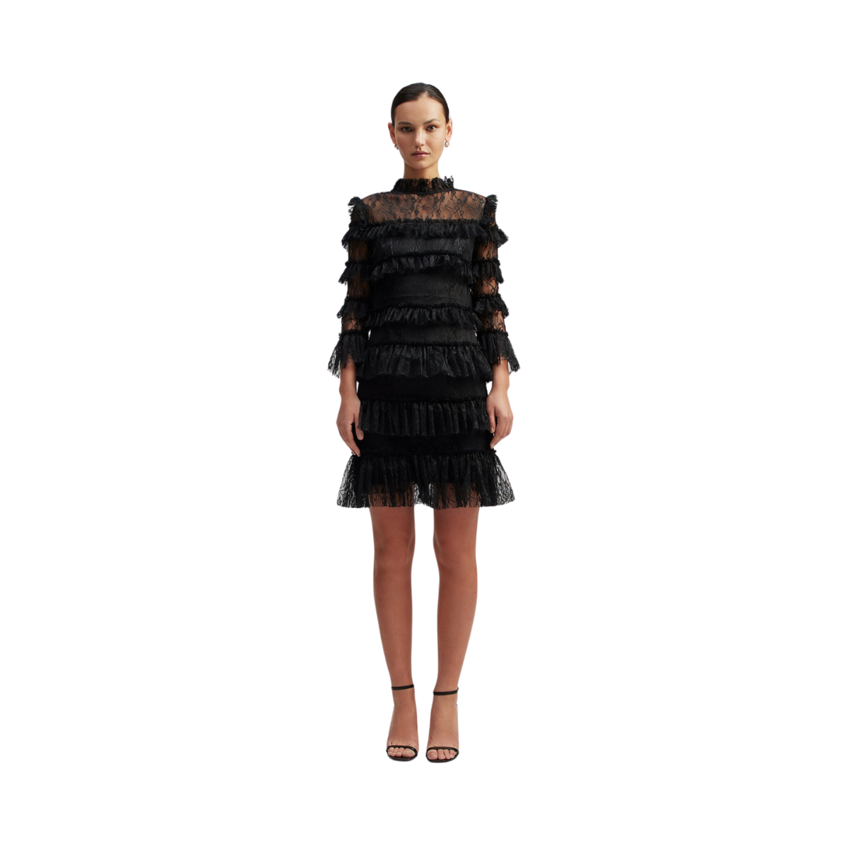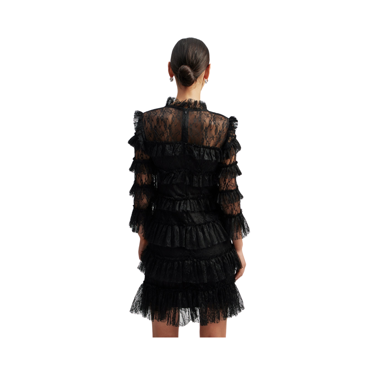 Svart miniklänning från By Malina. Klänningen är designad med spets-volang och en kroppsnära passform. Den har en polokrage i spets samt stängs med dragkedja längs ryggen. Den är normal i passformen och modellen är 178 cm lång och bär storlek S.