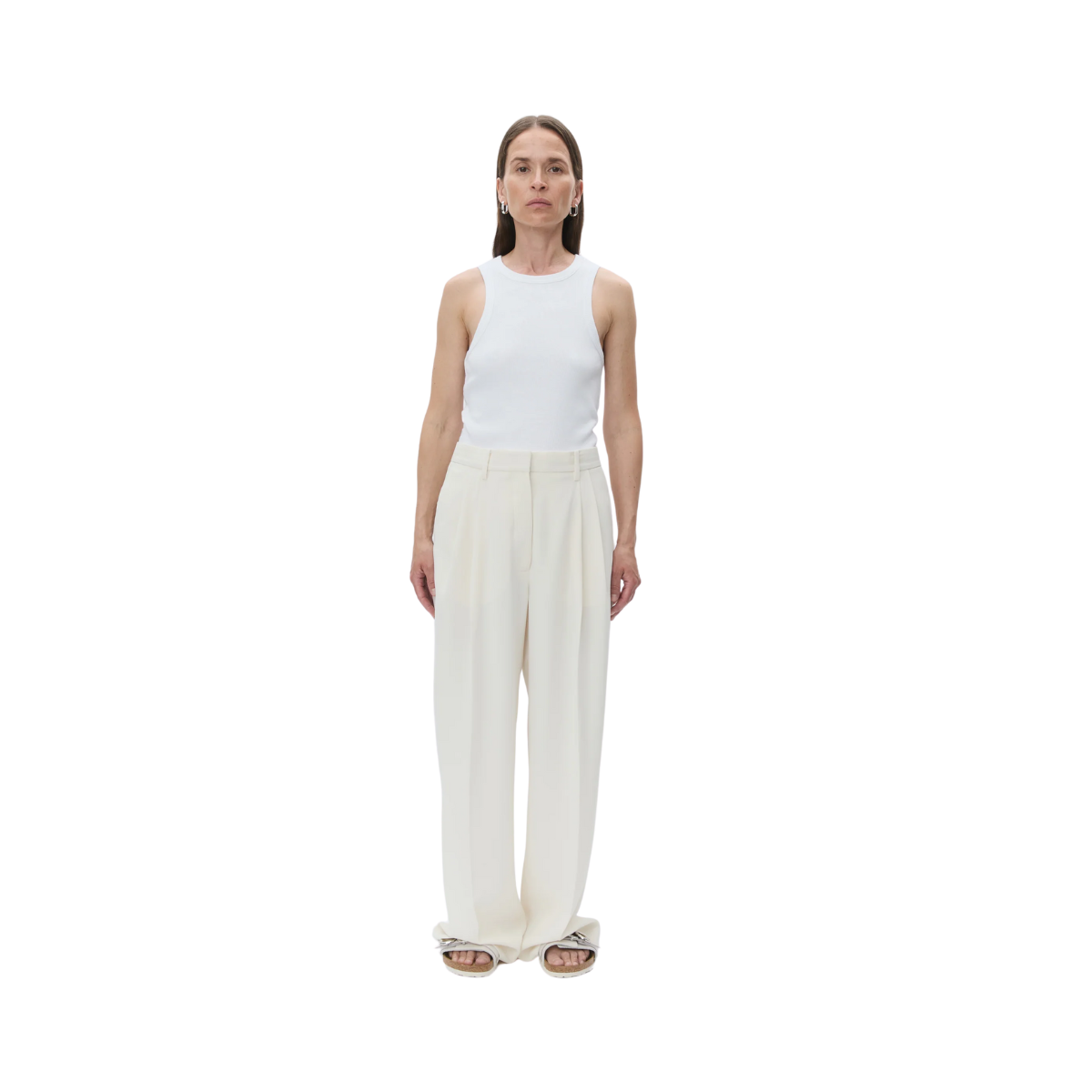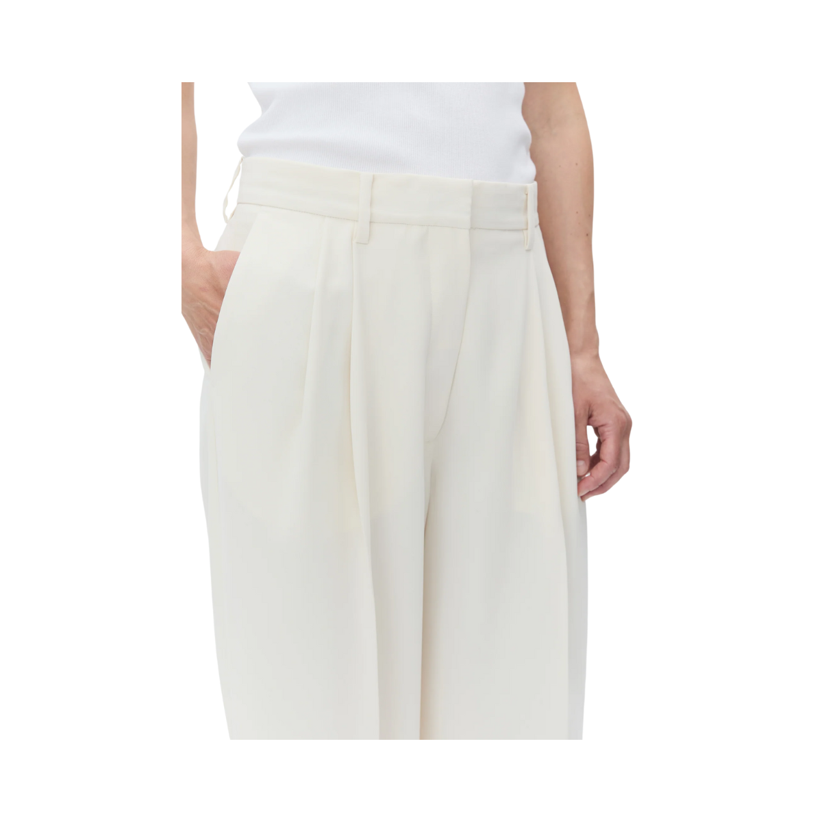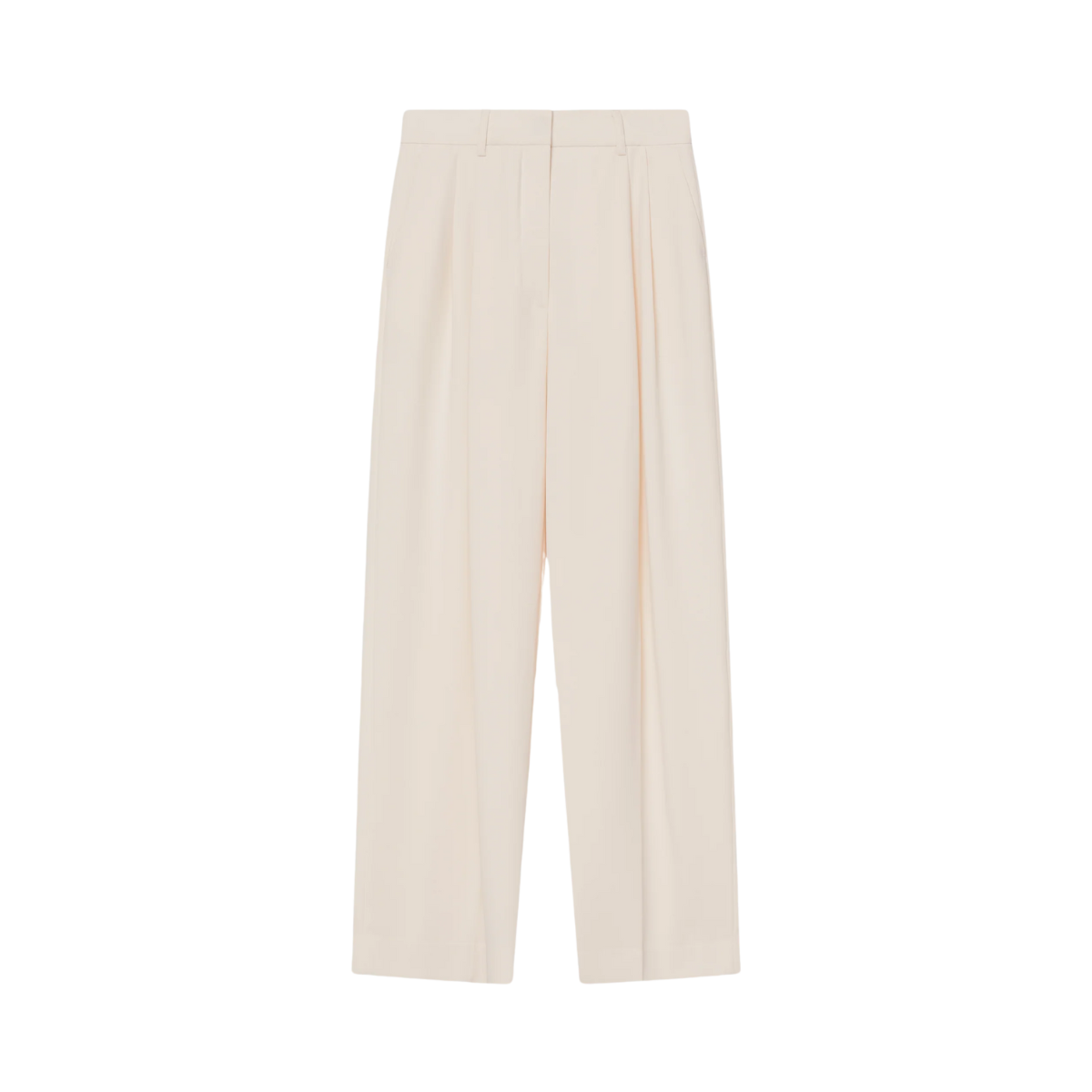 Dessa högmidjade byxor har veck vid midjan, dragkedja med hysklås och sidofickor. En enkel bakficka i patchmodell ger ett stilrent avslut. Byxorna har en regular fit som ger både komfort och elegans.