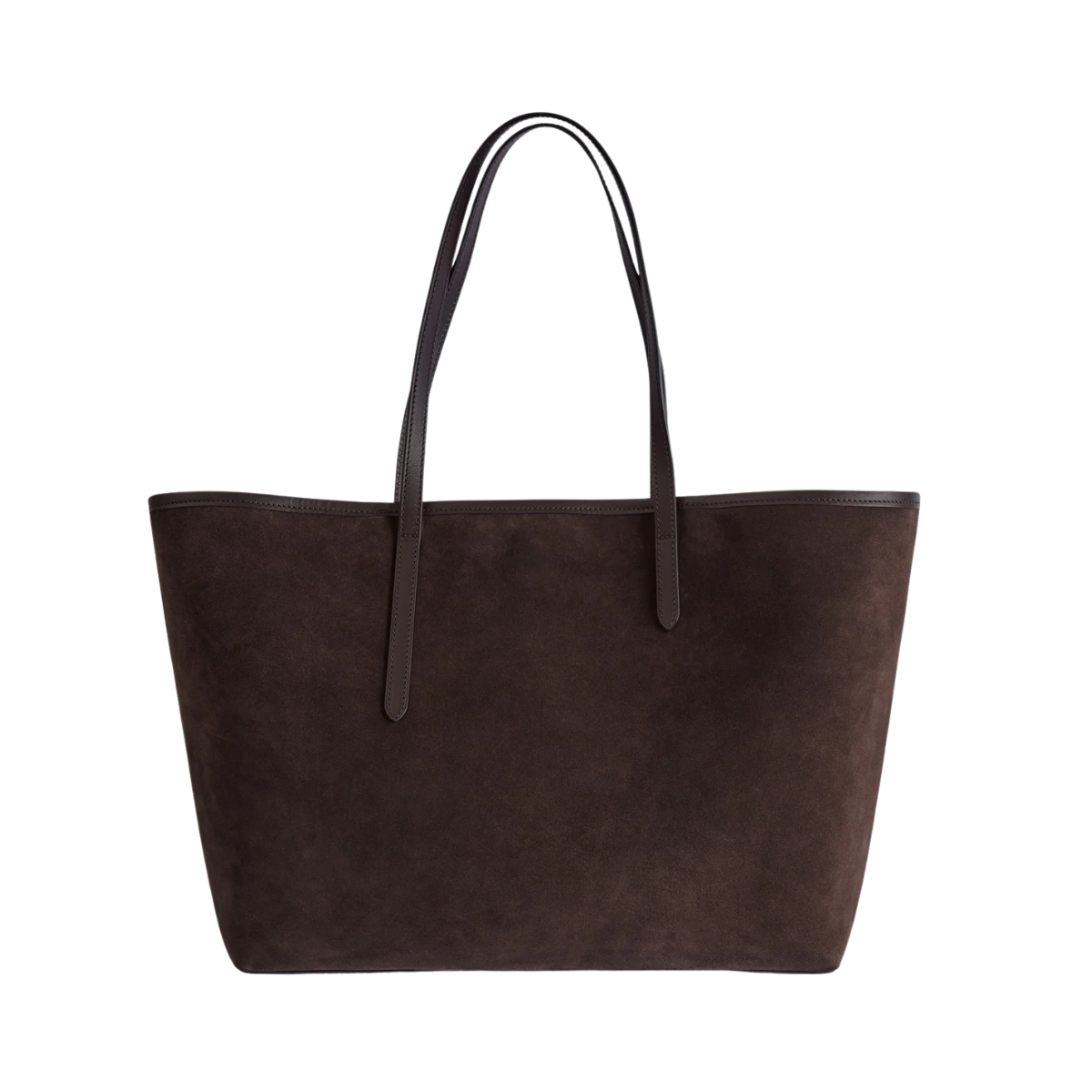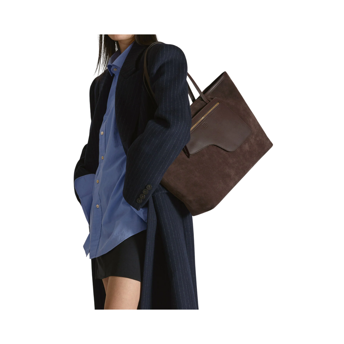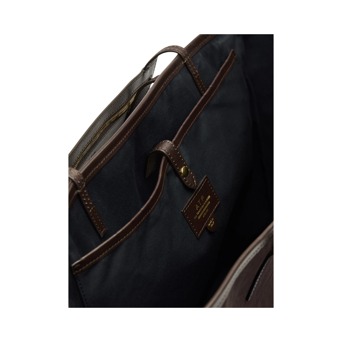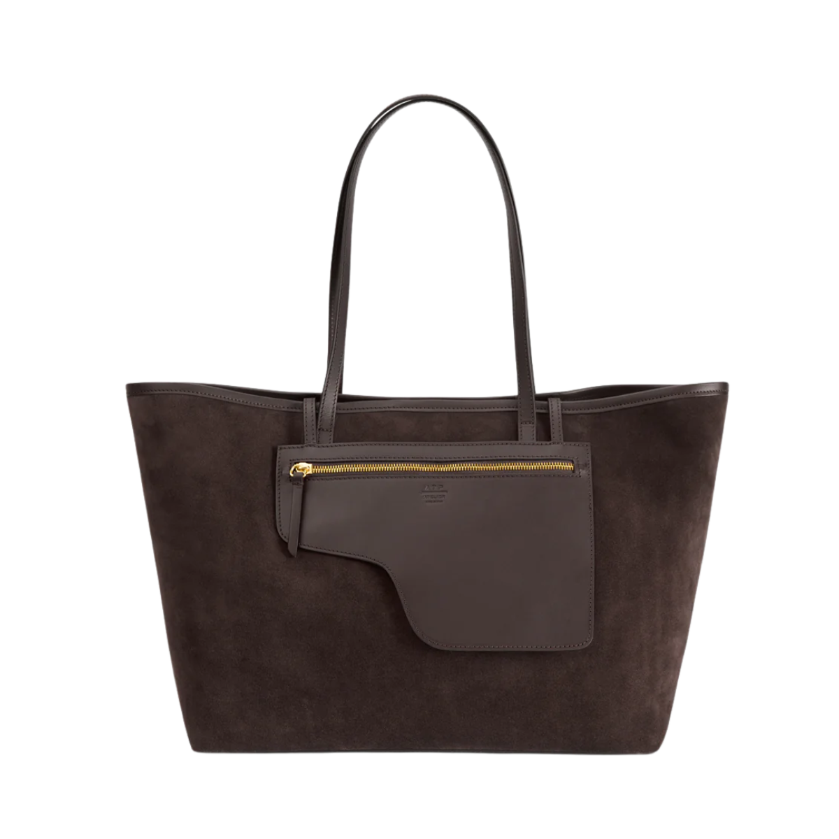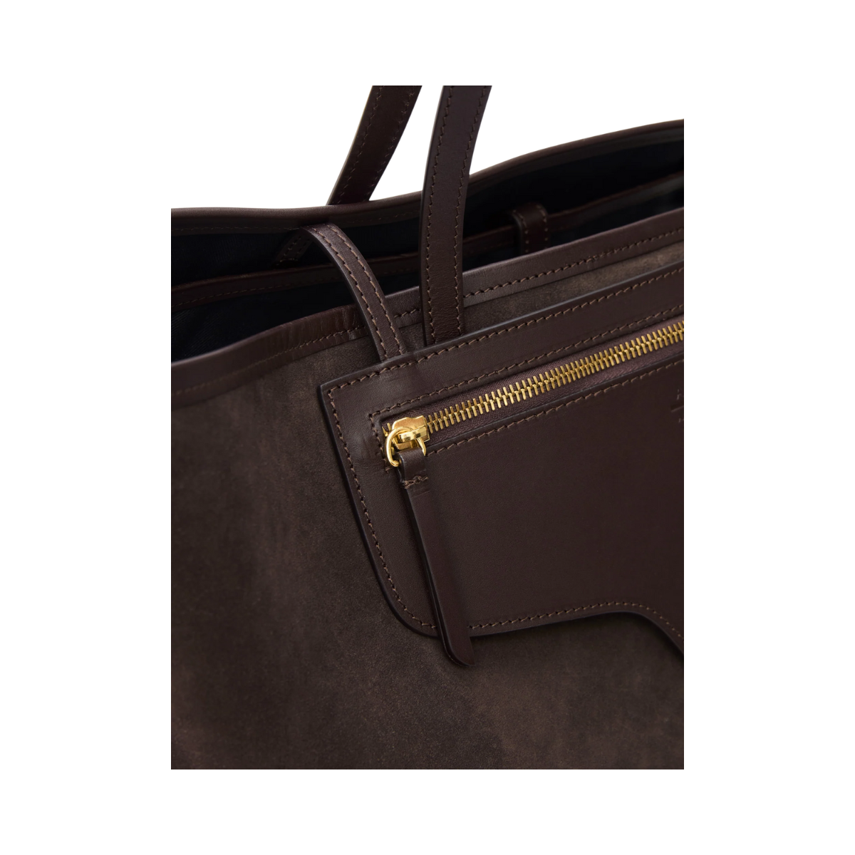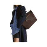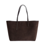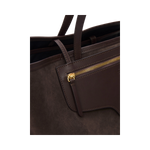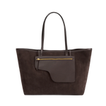 En handgjord stor tote i mjuk toscansk mocka och Vacchetta-läder. Den har en tidlös design med rymlig insida, invändig och utvändig ficka samt en avtagbar pouch för extra funktion. Klassisk mörkbrun färg (Walnut) med guldtonade detaljer gör den till en elegant och praktisk vardagsväska.
