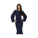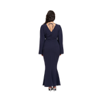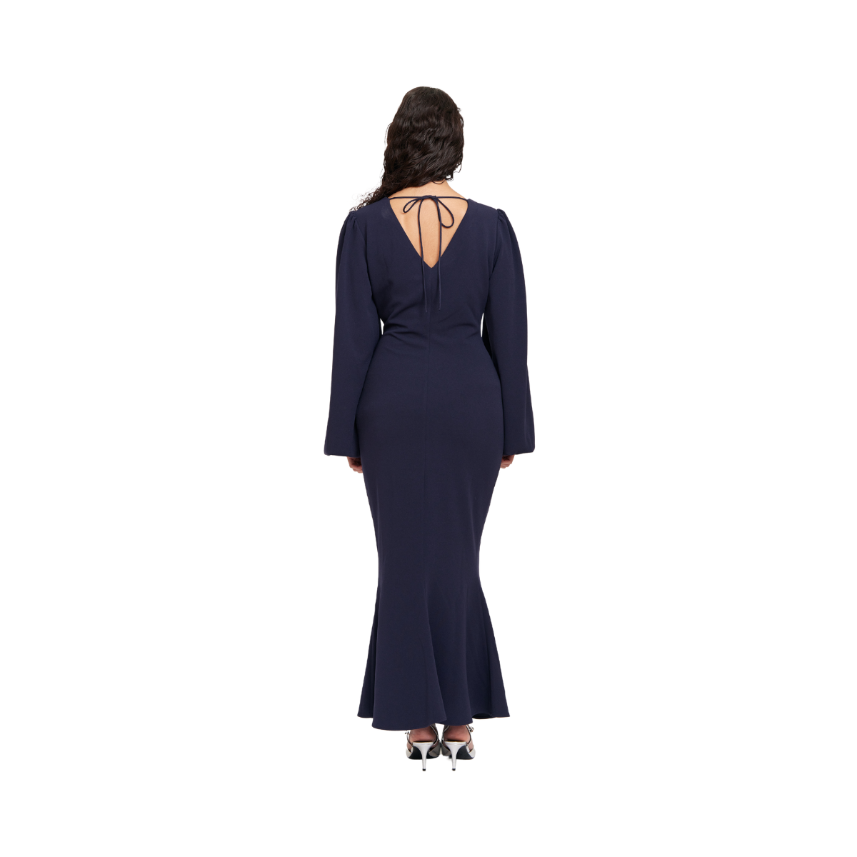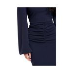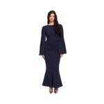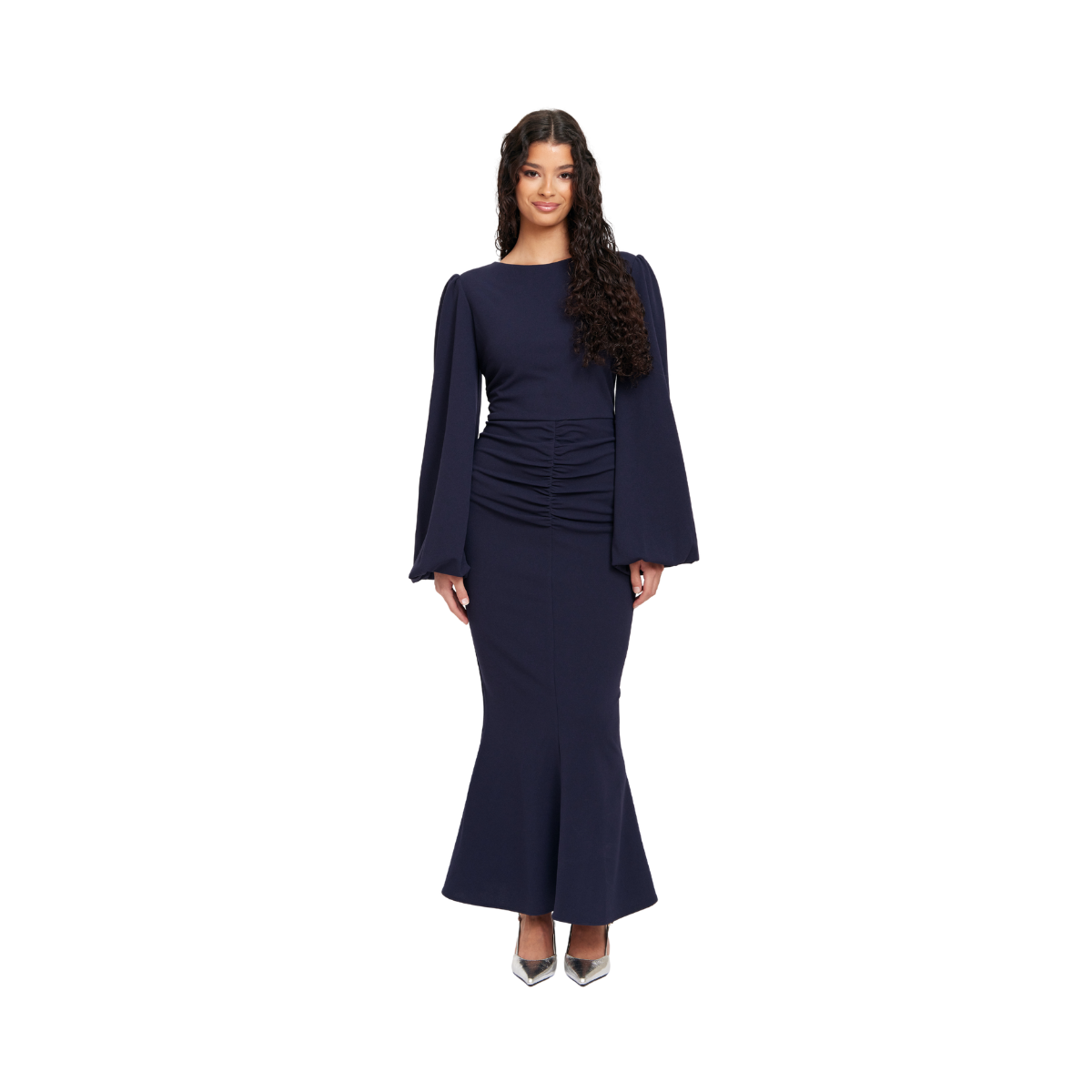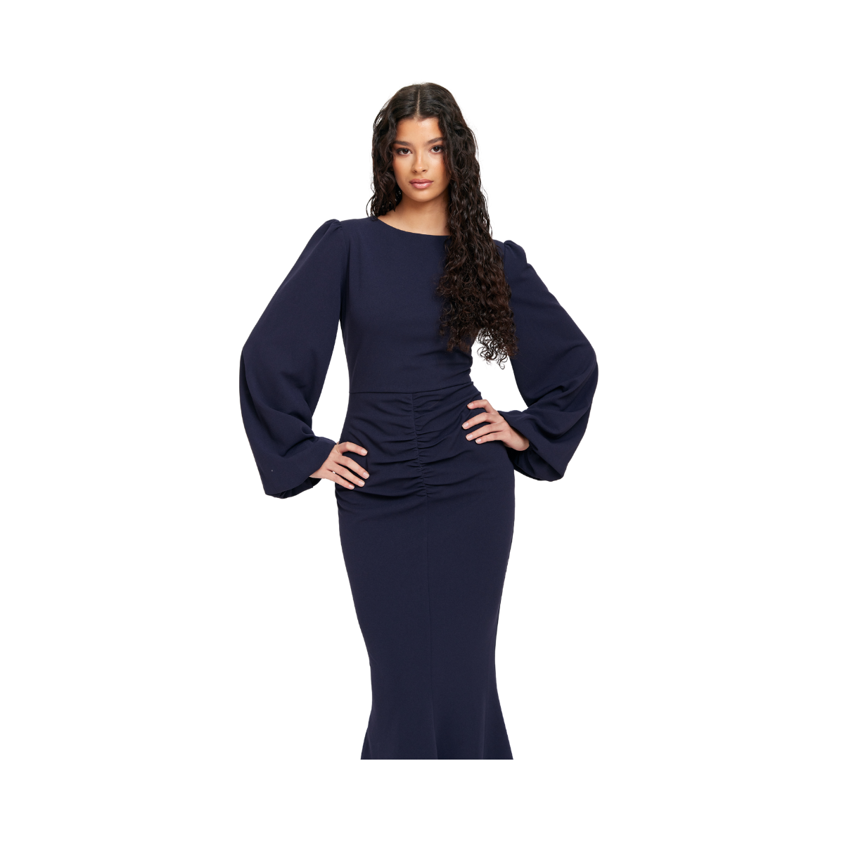 En lång, elegant klänning i djup marinblå ton. Den har långa, lösa ärmar och vacker resårdetalj framtill som markerar midjan och skapar en smickrande silhuett. Perfekt för både vardag och fest med sin luftiga känsla och stilrena design.