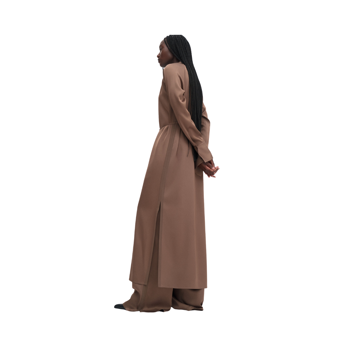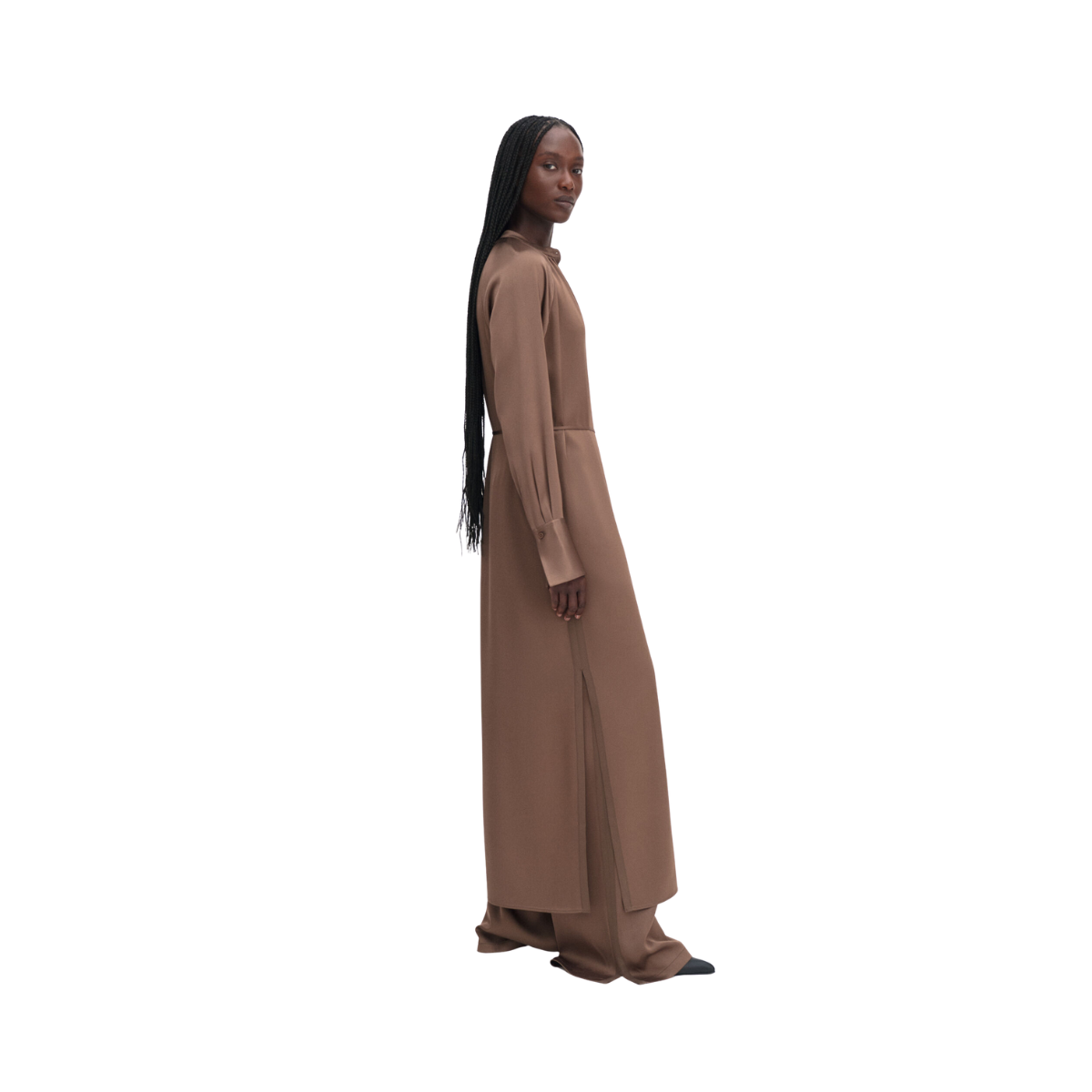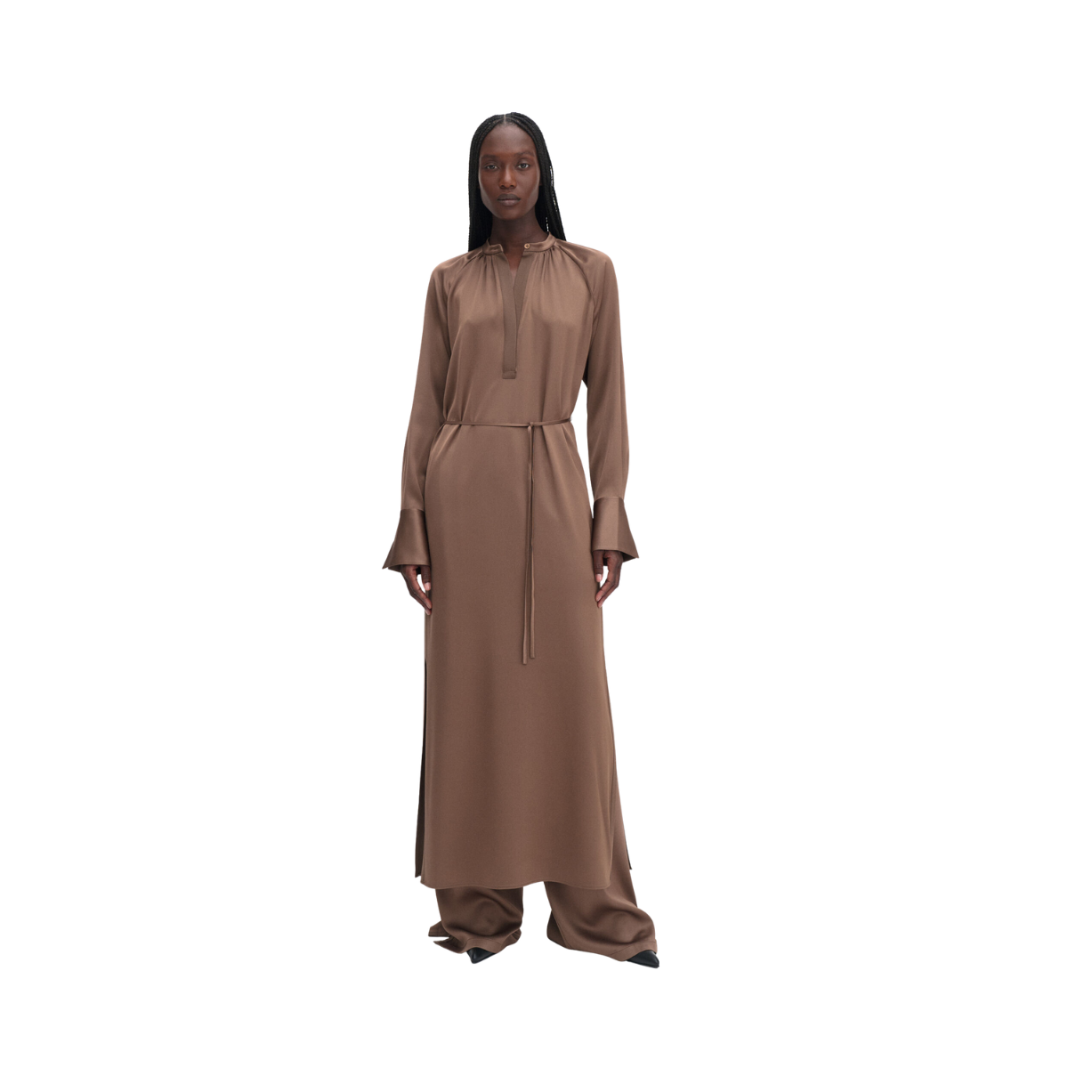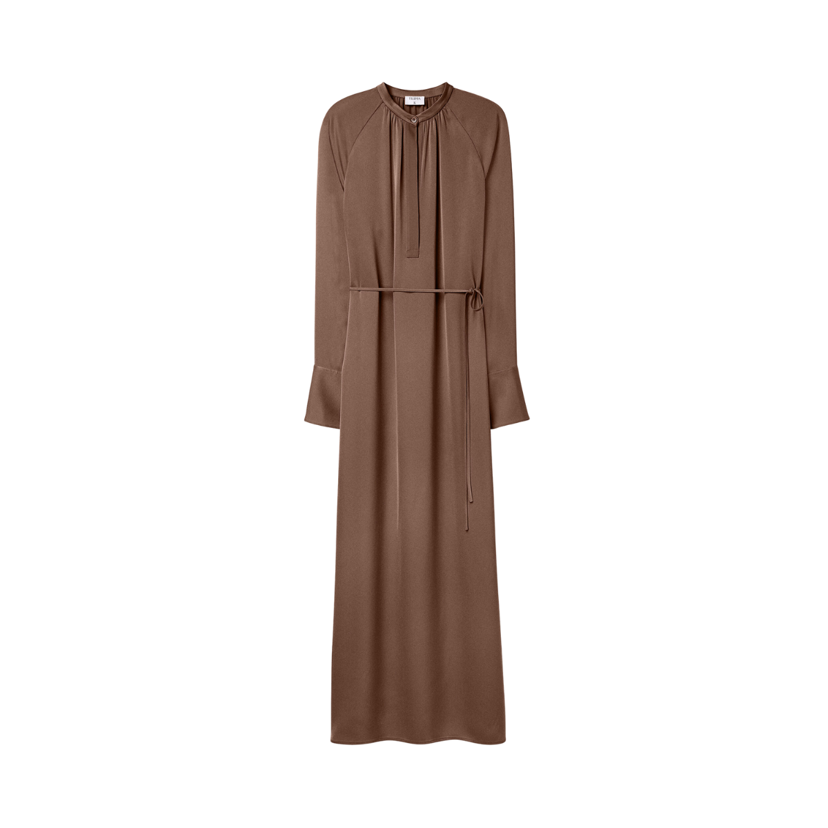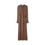 En maxiklänning med avslappnad passform tillverkad av en lätt och glansig draperad Naia™-acetatblandning. Designad med raglanärm, midjebälte och rynk vid ståkragen. Perfekt att bära med läderballerinas eller sandaler för en elegant, avslappnad look.