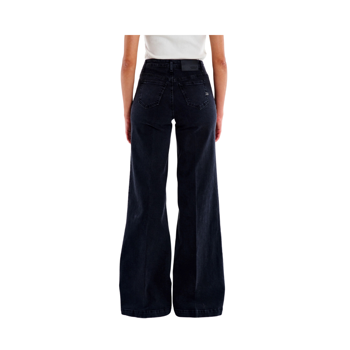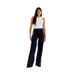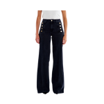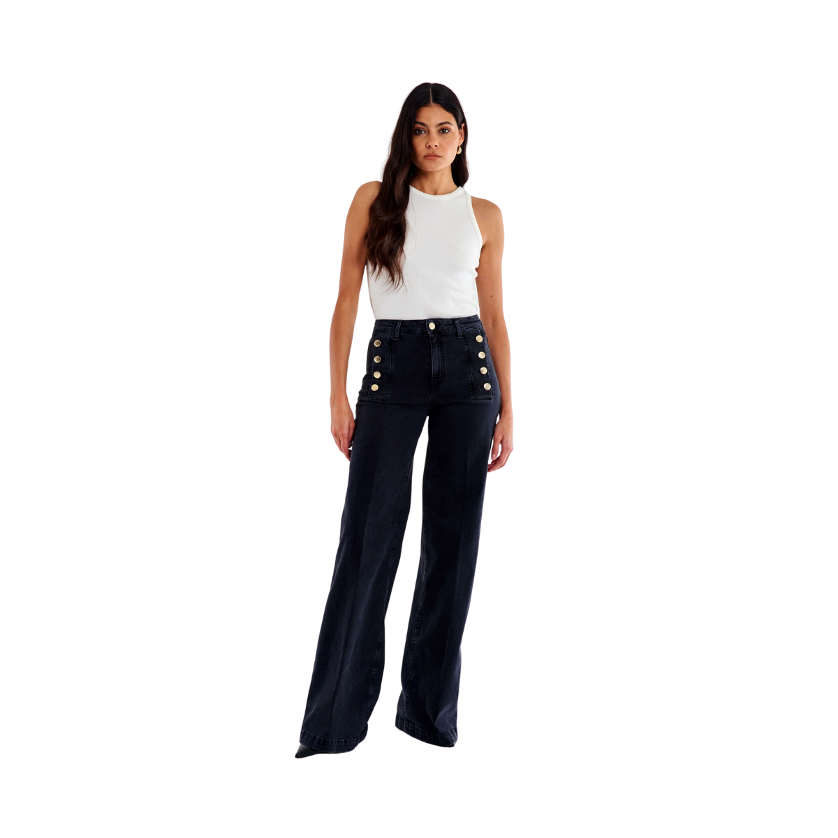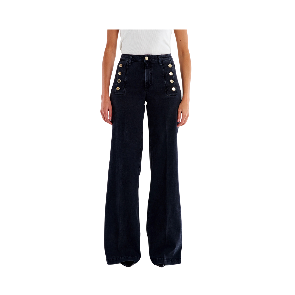 Jeans med hög midja och vida ben för en modern siluett. Framtill pryds de av dekorativa guldknappar som ger en elegant touch, medan gylf med dragkedja och knapp samt bakfickor adderar klassiska denimdetaljer. Ett stilfullt par som kombinerar komfort och sofistikerad design.