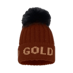 Styckpris / perEn snygg brun ribbstickad mössa från Goldbergh. Mössan har "gold" skrivet över den vikta kanten i guldtråd. Den har fleece fordring på insidan för komfort och extra värme. Toppen av mössan har en fuskpäls pompon.