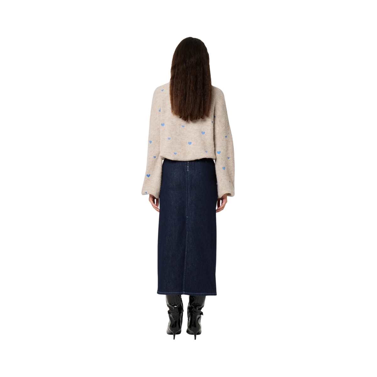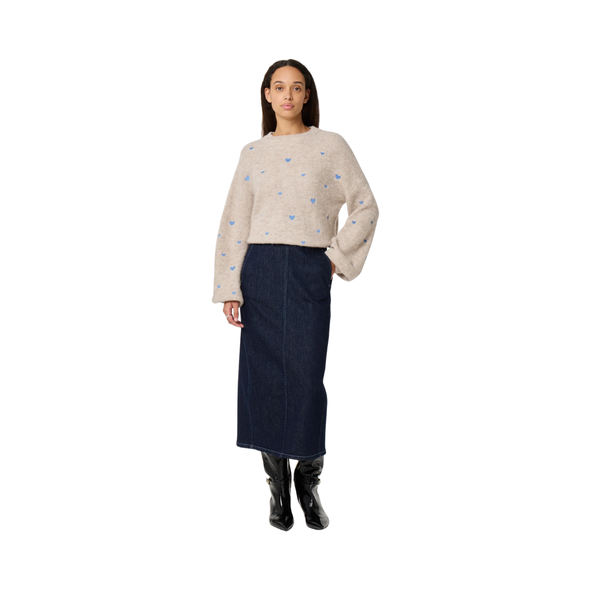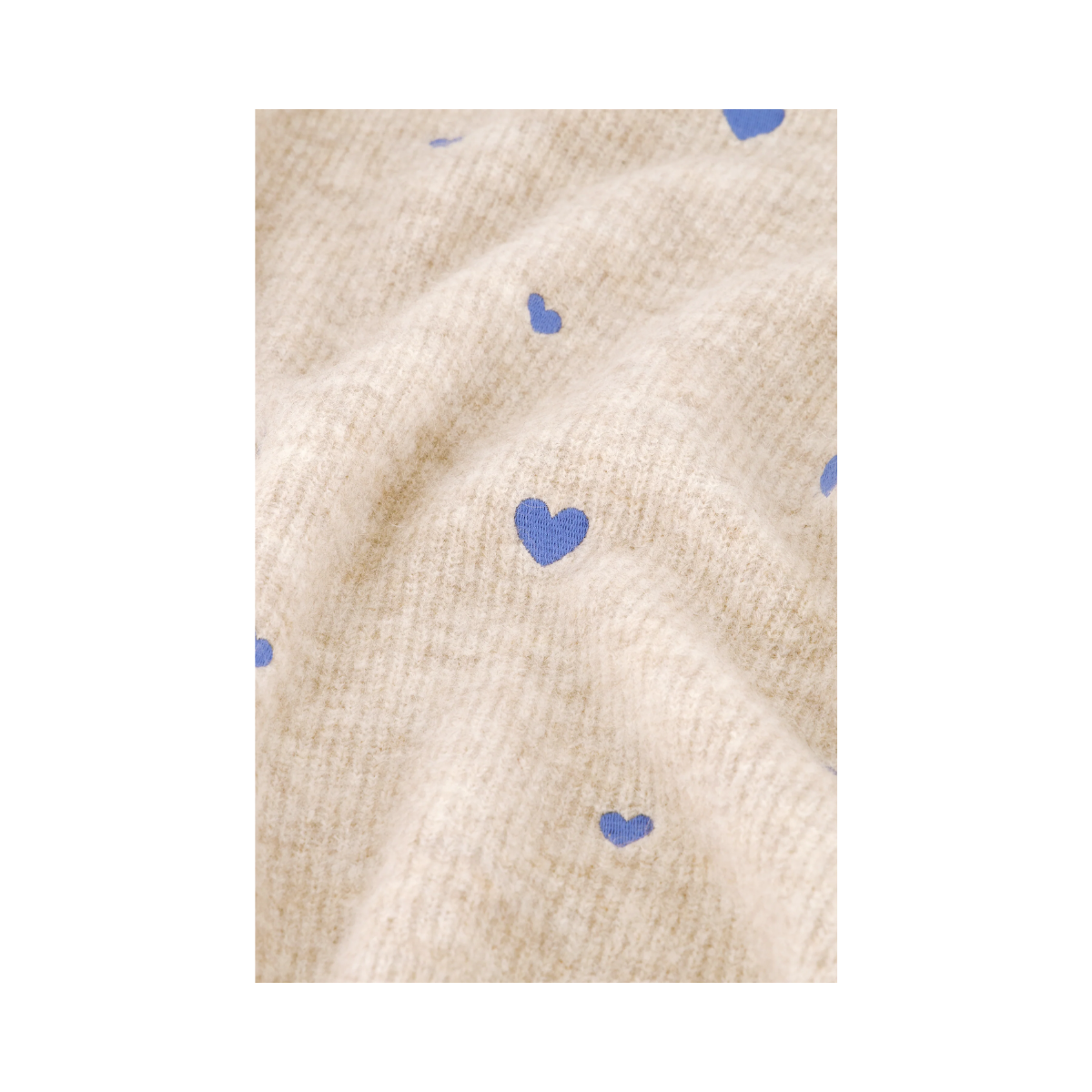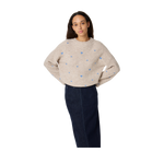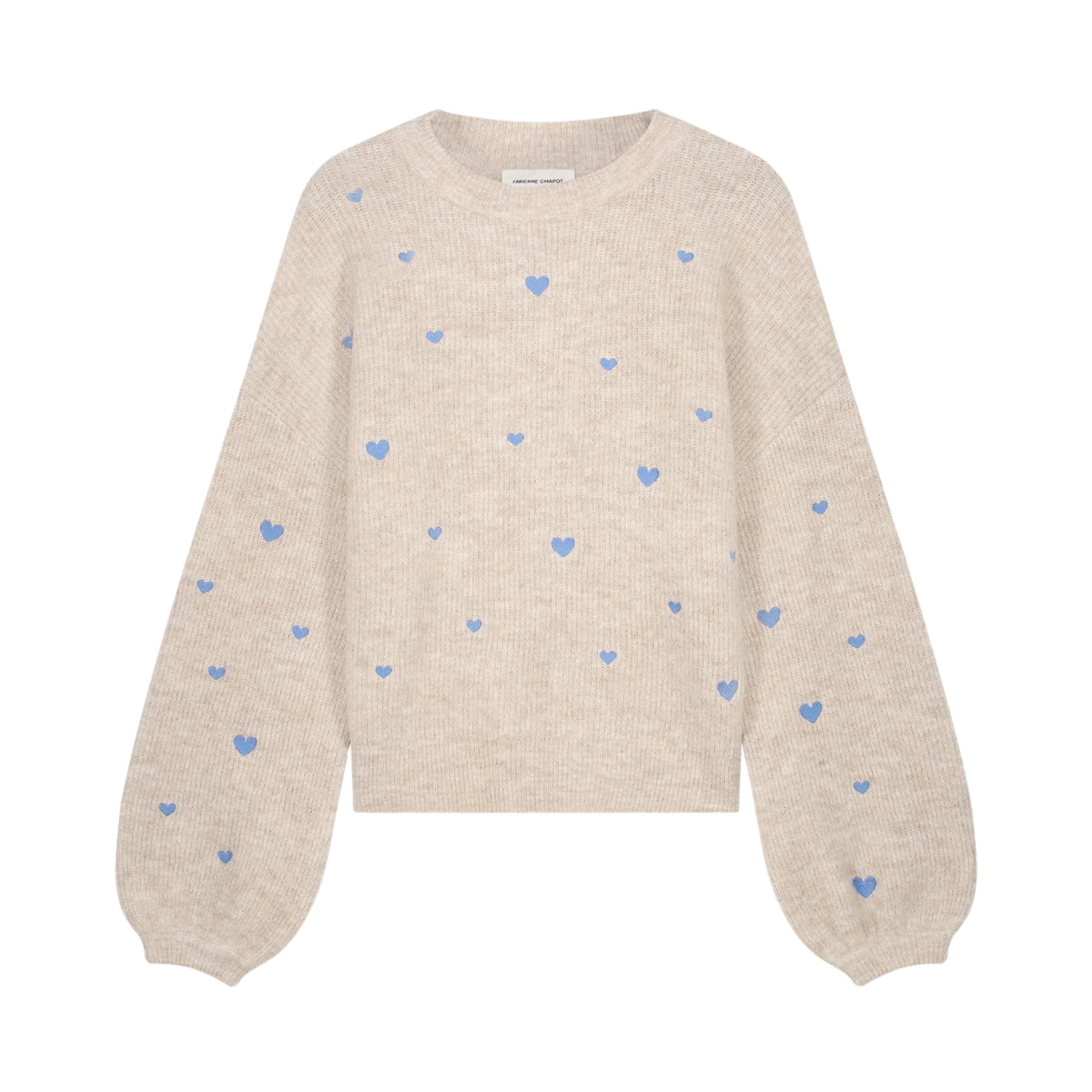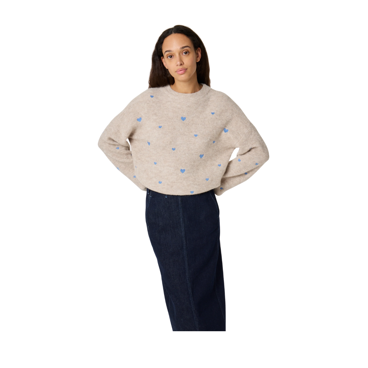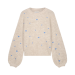 En havrebeige tröja med långa ärmar och broderade hjärtan, perfekt för alla avslappnade tillfällen. Tillverkad i en mjuk materialblandning som håller dig varm och bekväm. Matcha med dina favoritjeans eller en kjol för en komplett och stilfull look.