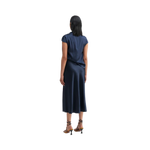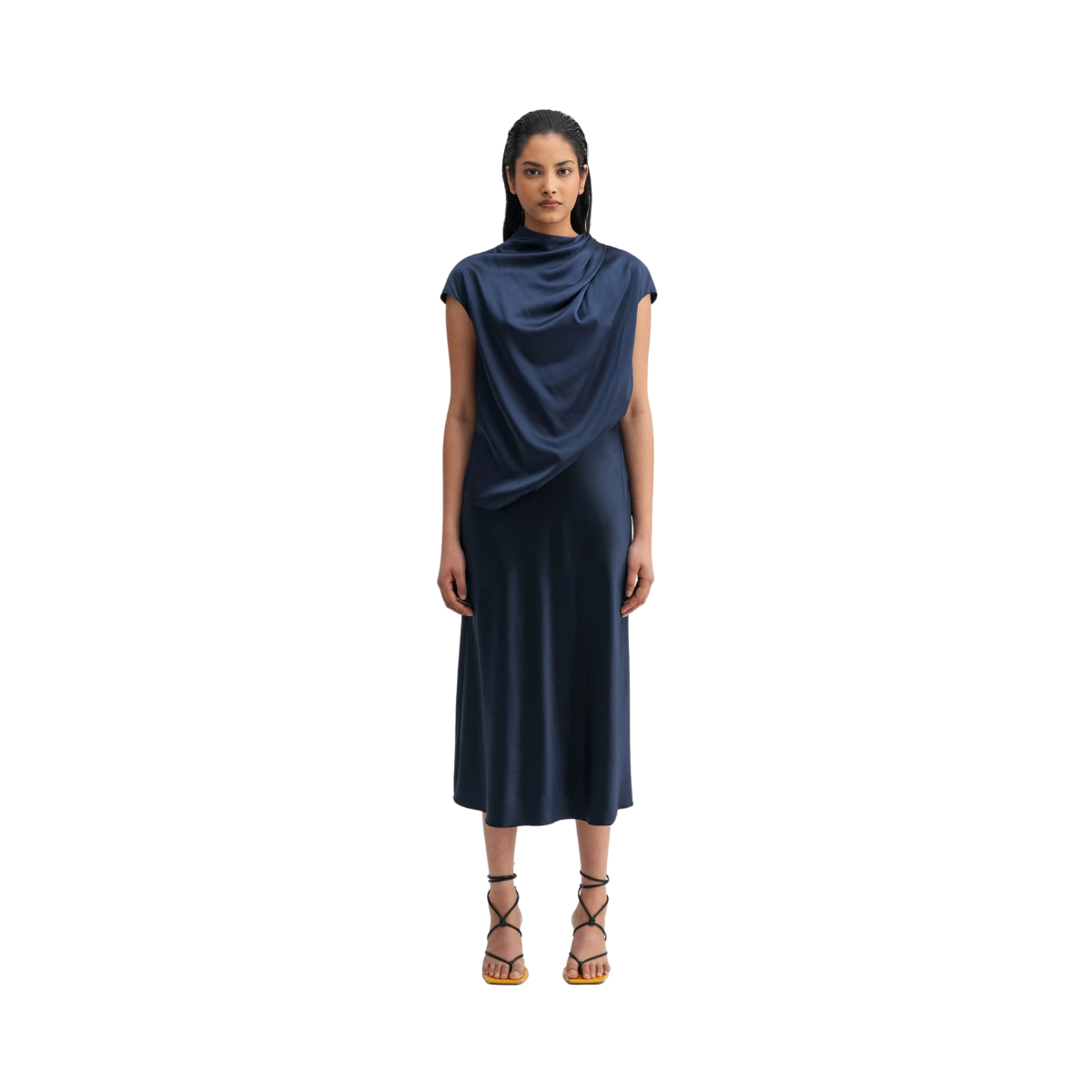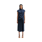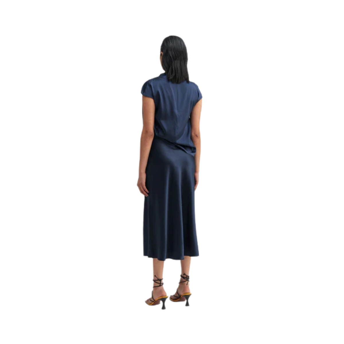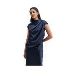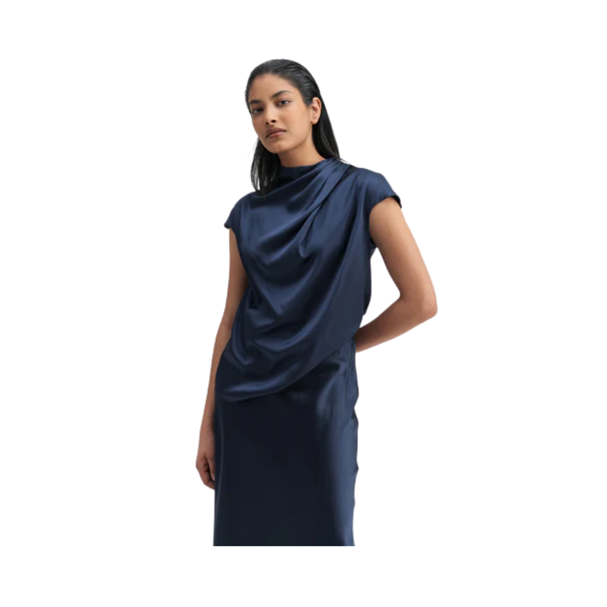 Topp är skuren av siden/stretch med satinyta. Den har asymmetriska veck för att drapera längs halsen, kepsärmar och en dold dragkedja i nacken bak.