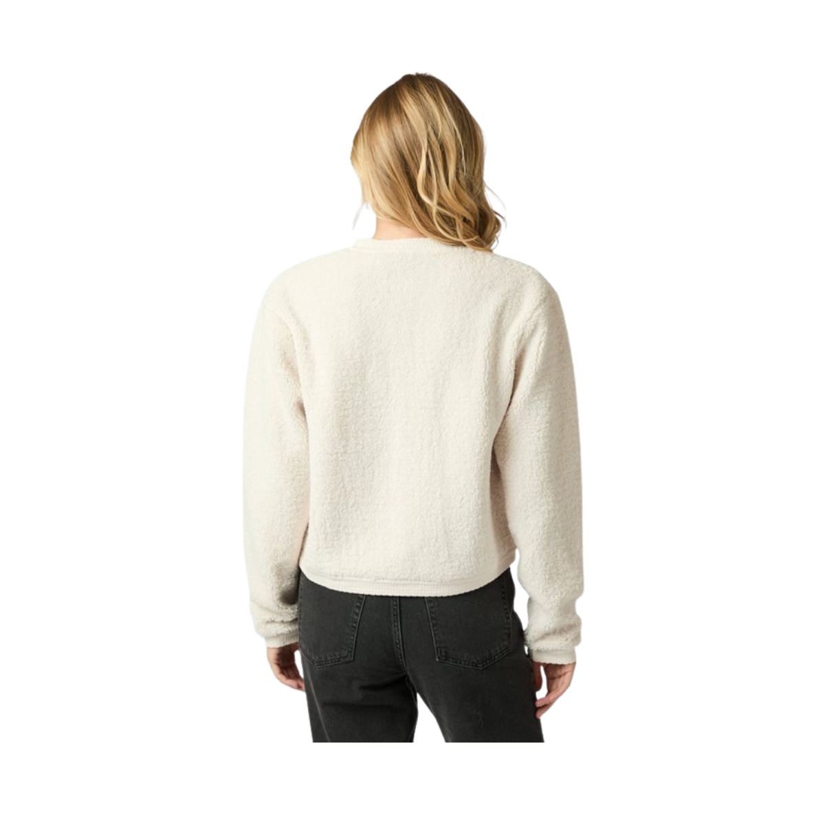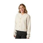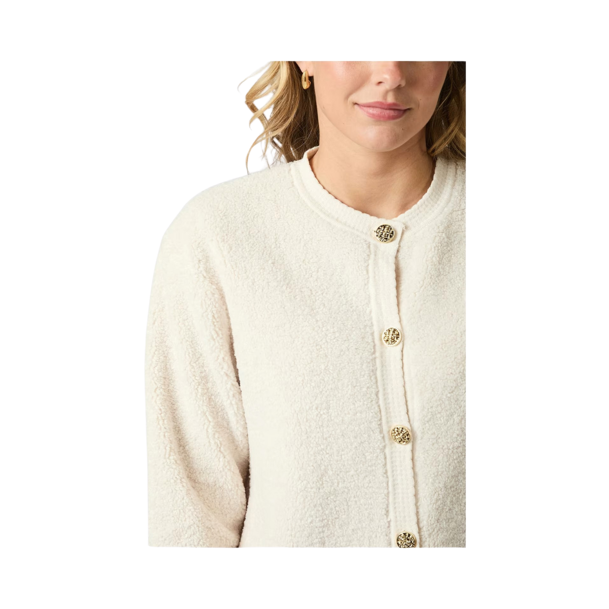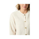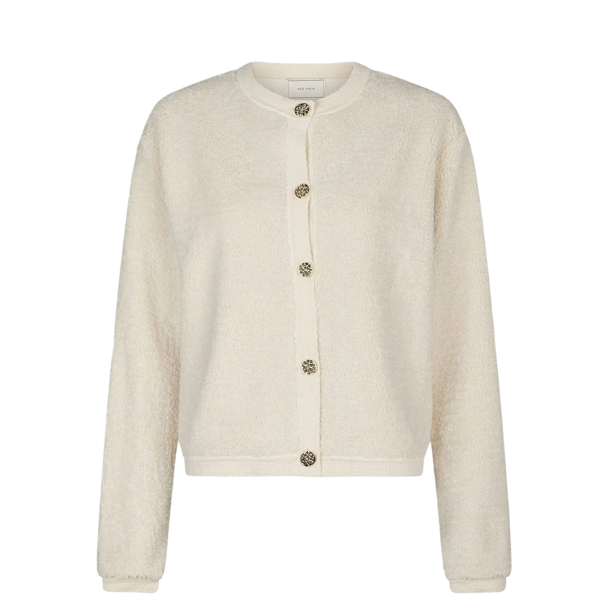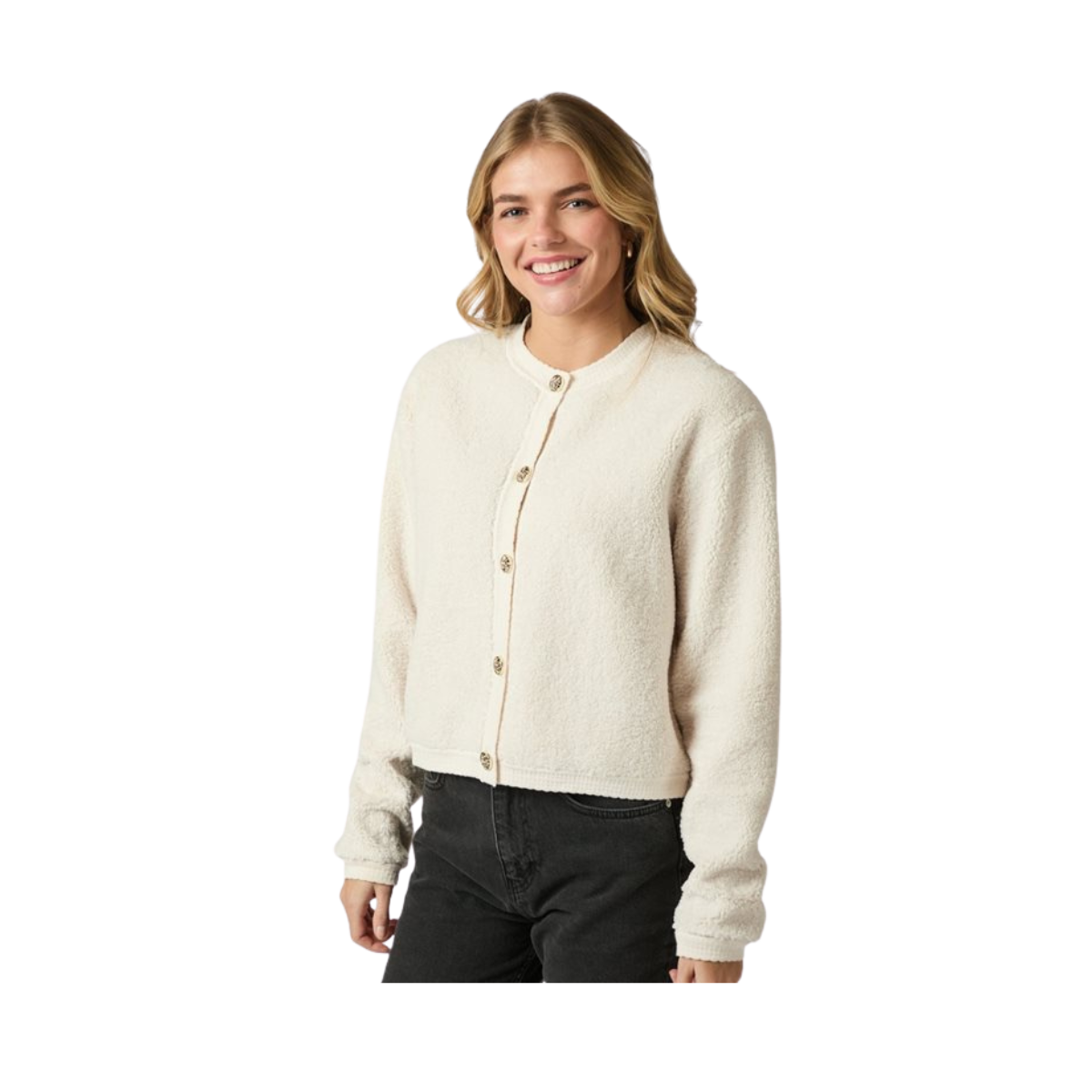 Kort kofta i mjukt teddymaterial. Koftan har långa ärmar med nedhasade axlar, rund halsringning, ribbade kanter samt dekorativa knappar framtill. Den är skuren till en normal passform. Modellen bär storlek 36.