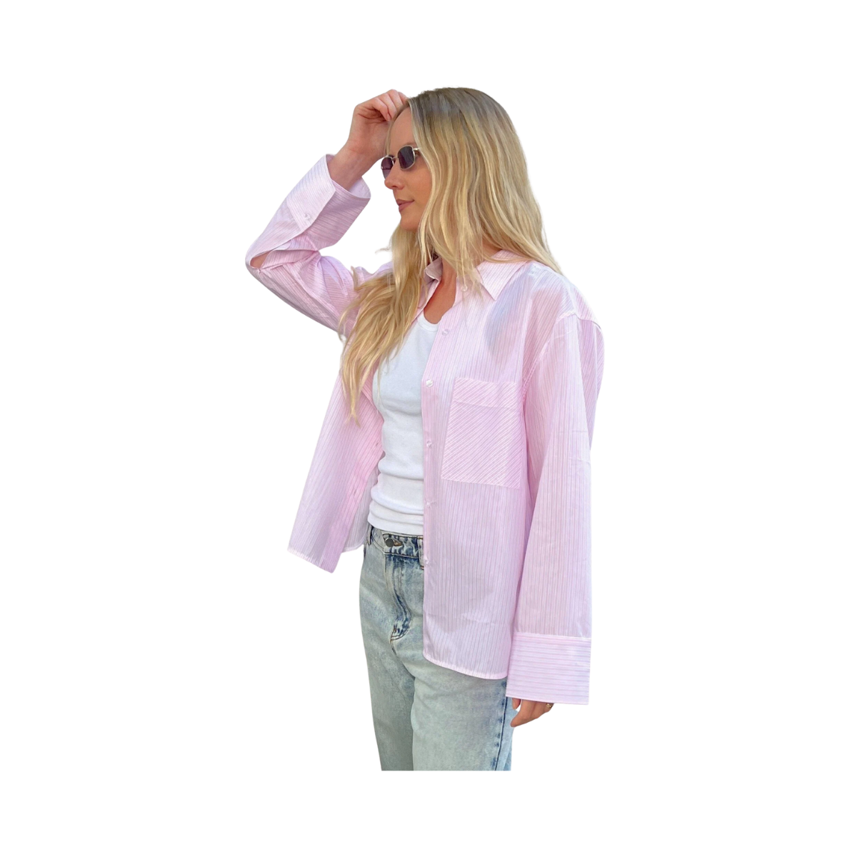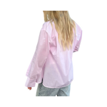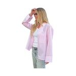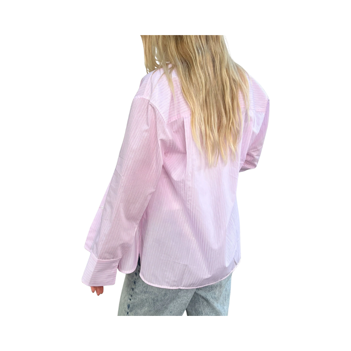 En ljusrosa-randig skjorta i en oversize passform. Denna skjorta med knappar har överdimensionerade manschetter, en ficka på bröstet och en rundad fåll.