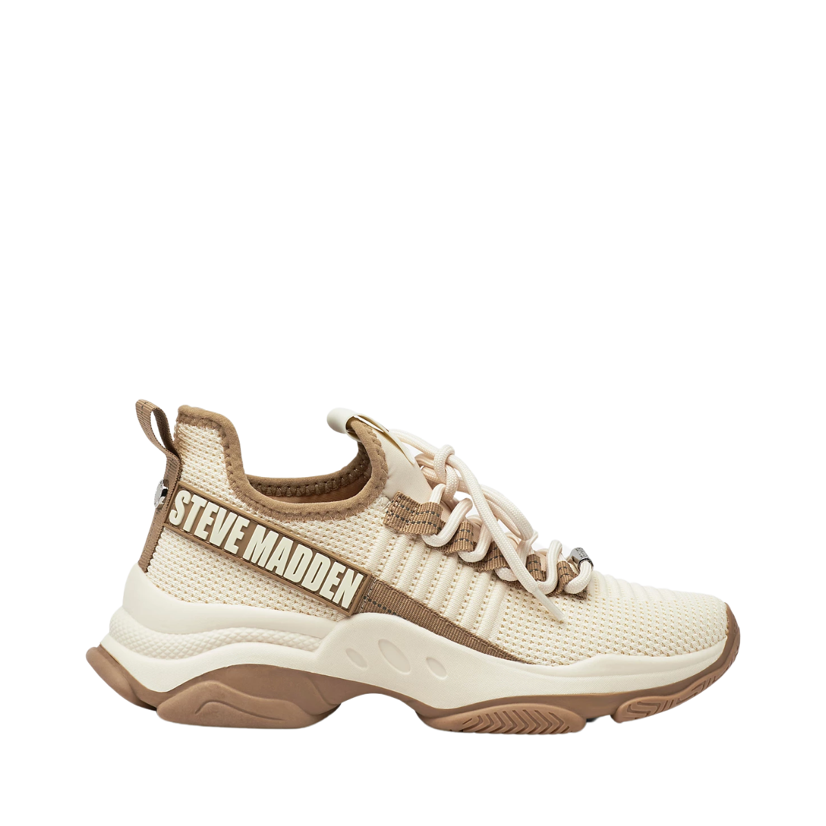 Mac-E sneakers från Steve Madden, är en modern sko som kombinerar stil och hållbarhet. Den har bred snörning och hög hälkappa med draghälla. Utrustad med en stor gummerad logotyp på ena sidan och en grov yttersula för extra grepp. Skon är tillverkad med återvunnet material för att minska avfall och spara resurser.