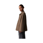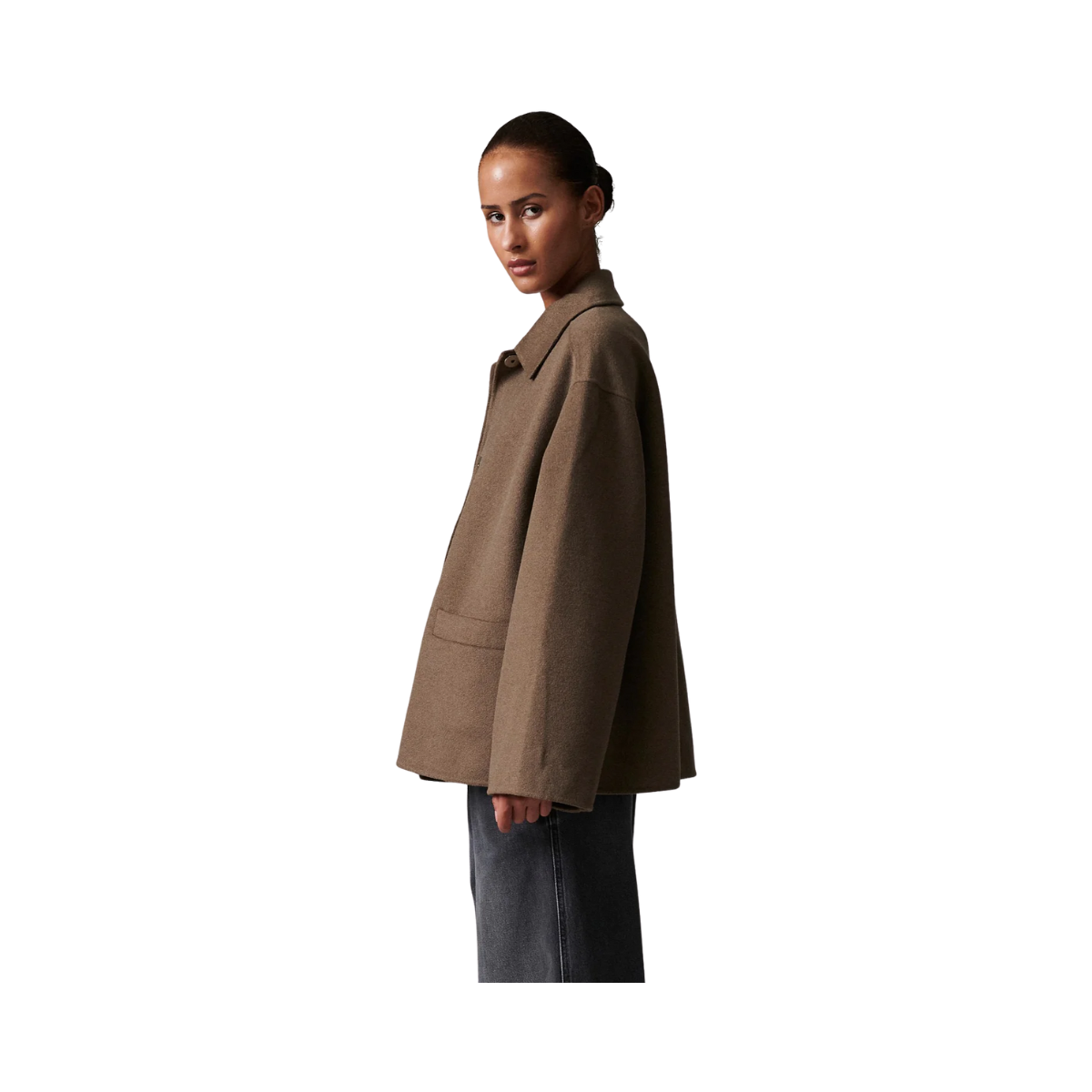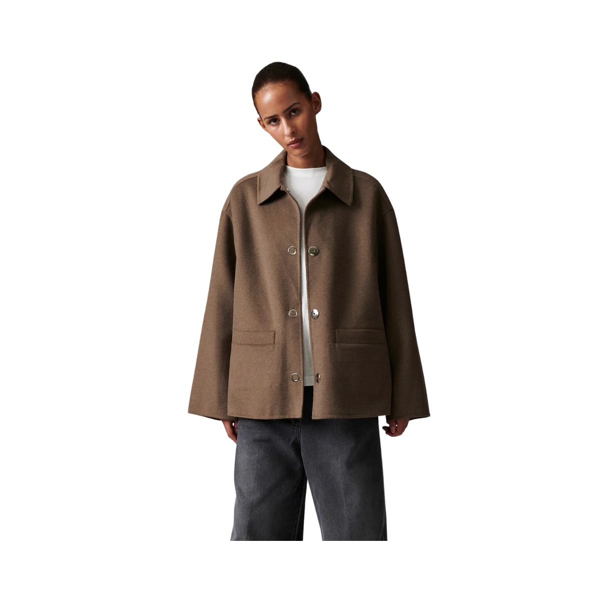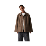 En stilren jacka i dubbelkvalitetsull med stora tryckknappar, framfickor och kort krage. Jackan är ofodrad och har en oversized passform som skapar en avslappnad och modern silhuett, perfekt att bära över både tröjor och skjortor.