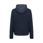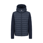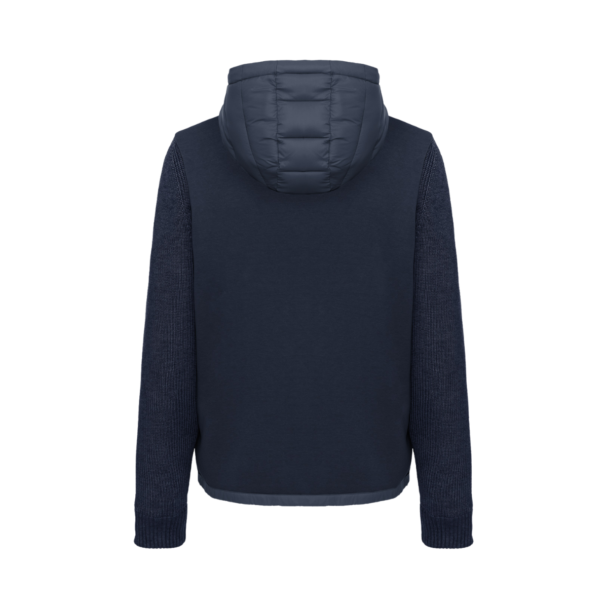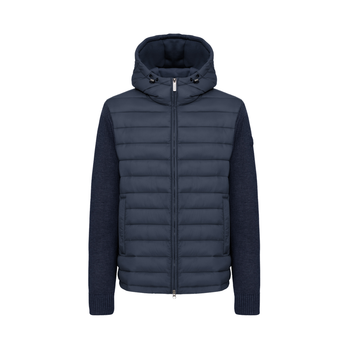 Sportig hybridjacka med vadderad, kviltad front kombinerat med stickade ärmar och fleeceparti bak. Den justerbara huvan, dragkedjefickorna och dragsko i nederkant ger en funktionell känsla, medan materialmixen framhäver en modern och avslappnad look.