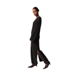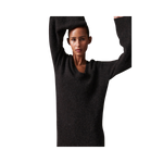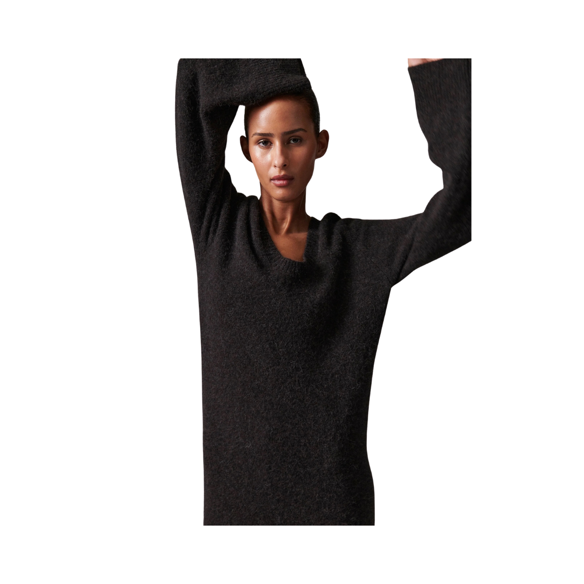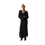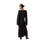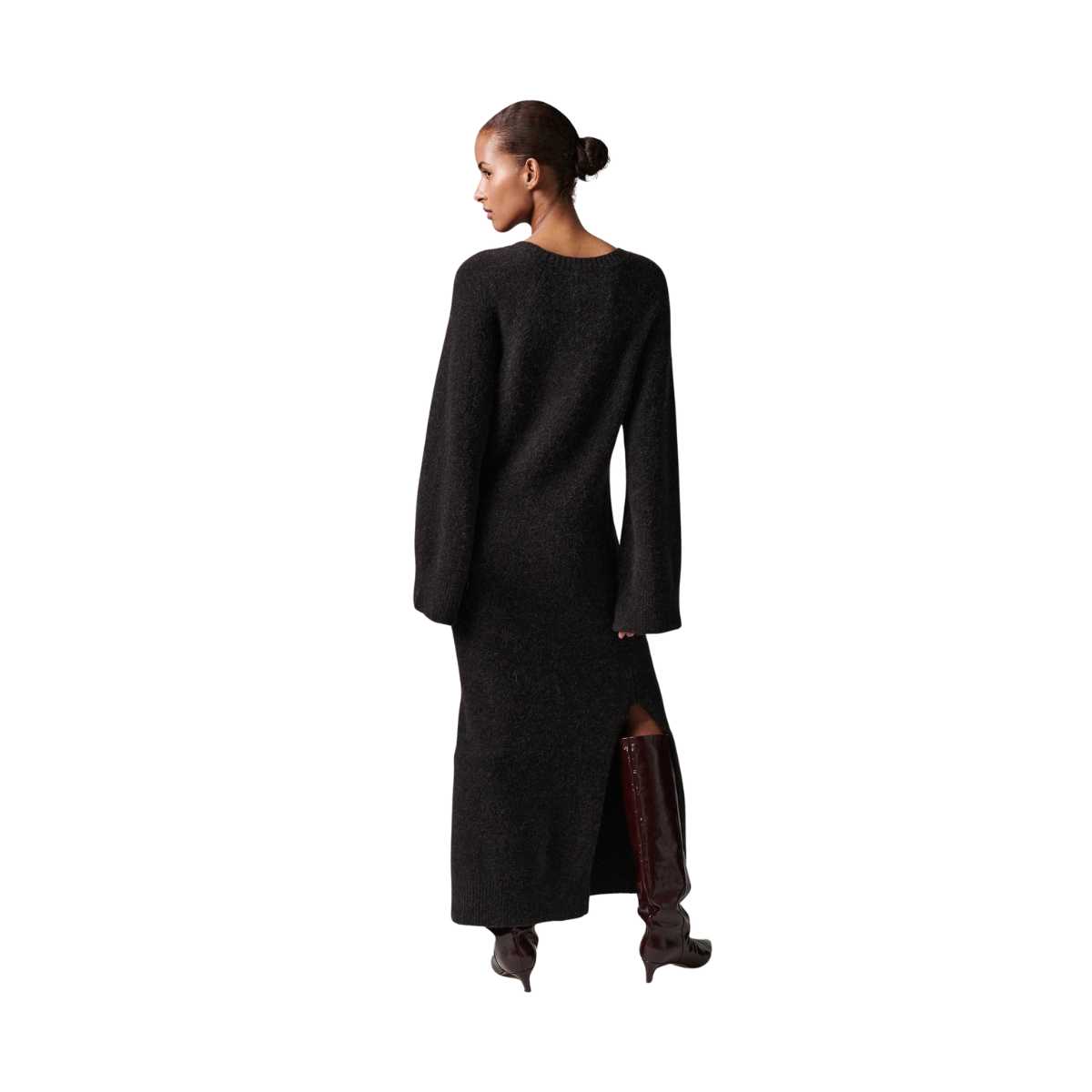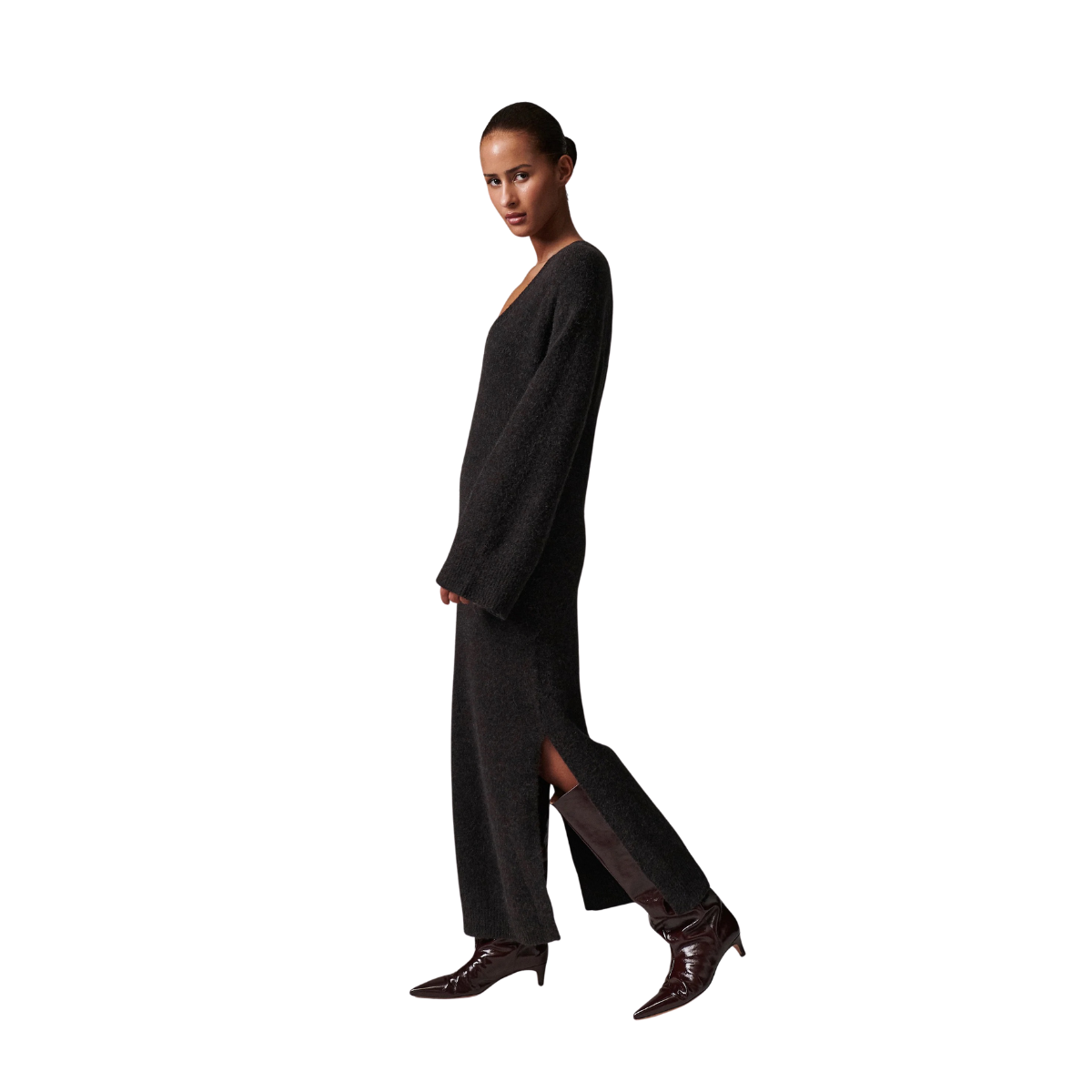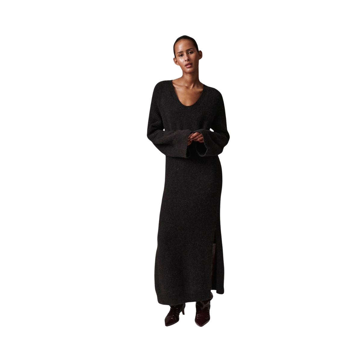 Denna stretchiga, ankellånga stickade klänning har en djup U-formad halsringning och slitsar i sidorna. Klänningen är figurnära.