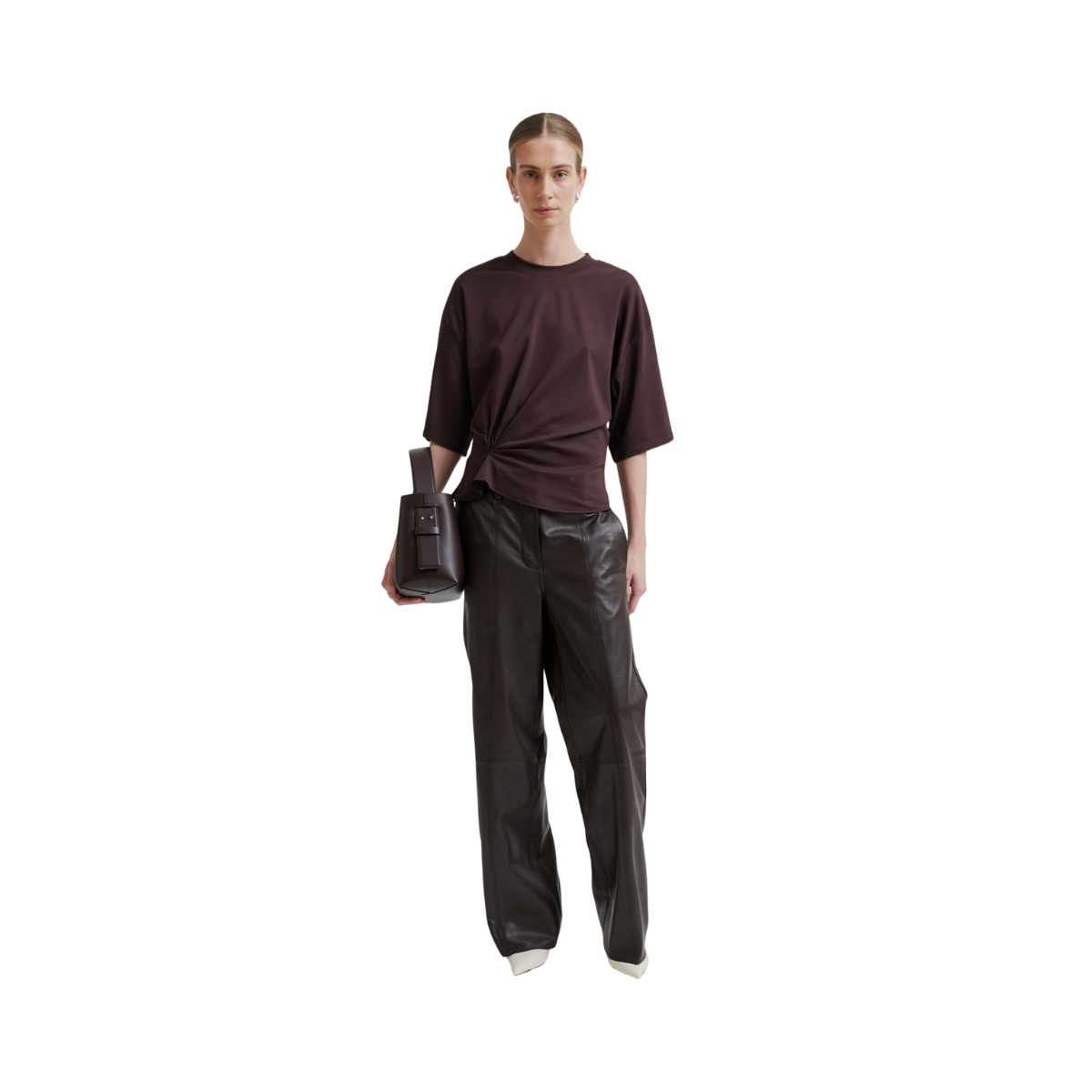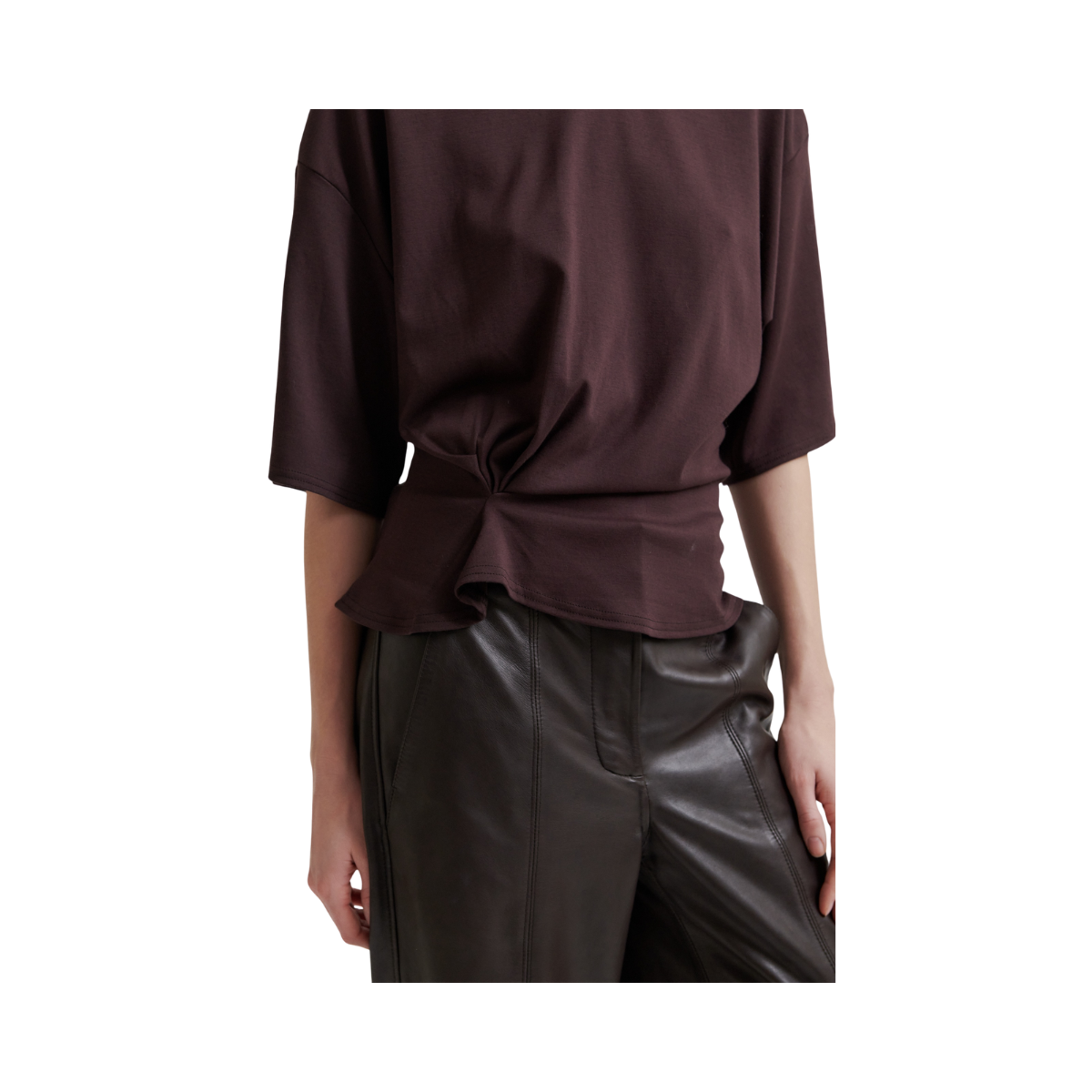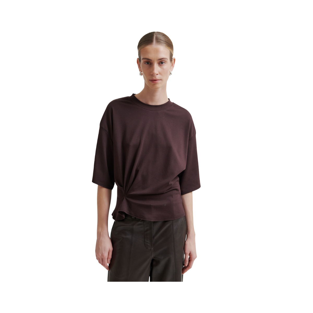 Kortärmad t-shirt med rynkning, tillverkad i en mjuk och stretchig tencel- och bomullsblandning. Den har rund halsringning och nedsänkta axlar med korta ärmar. Rynkade detaljer framtill som skapar en draperad effekt. Avslappnad passform upptill med mer åtsittande midja.