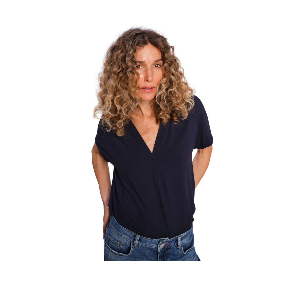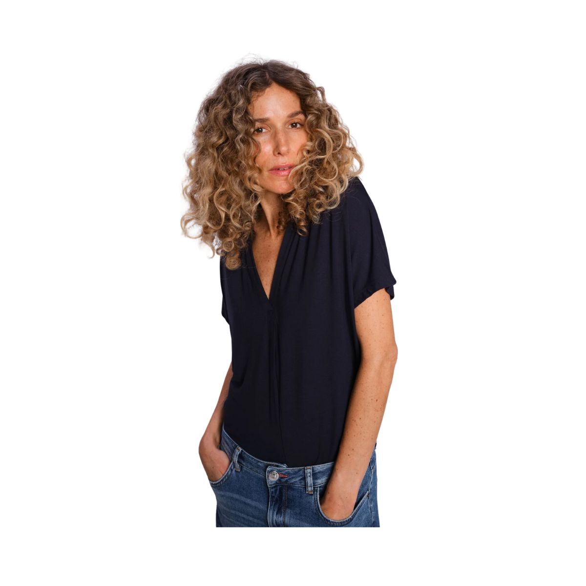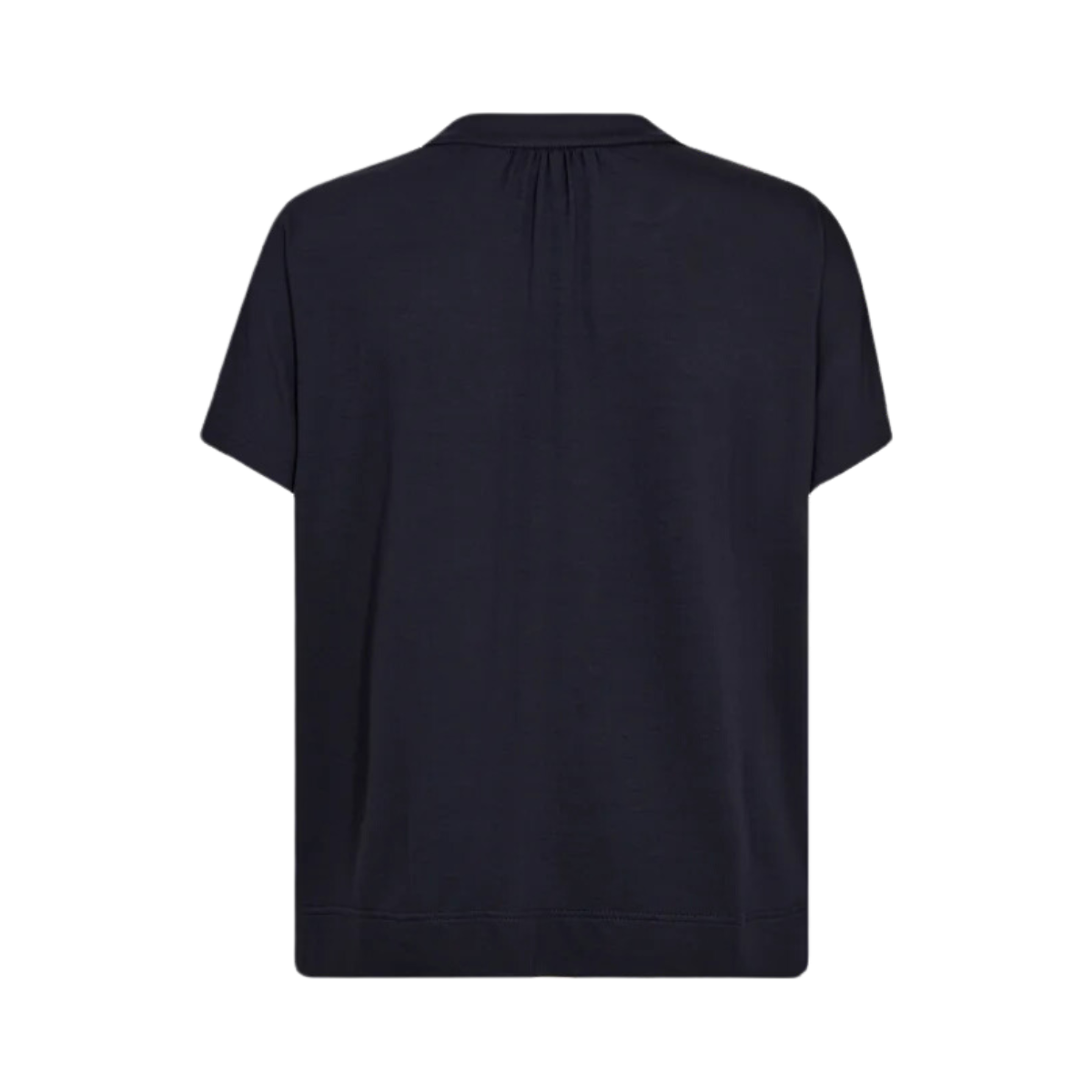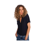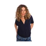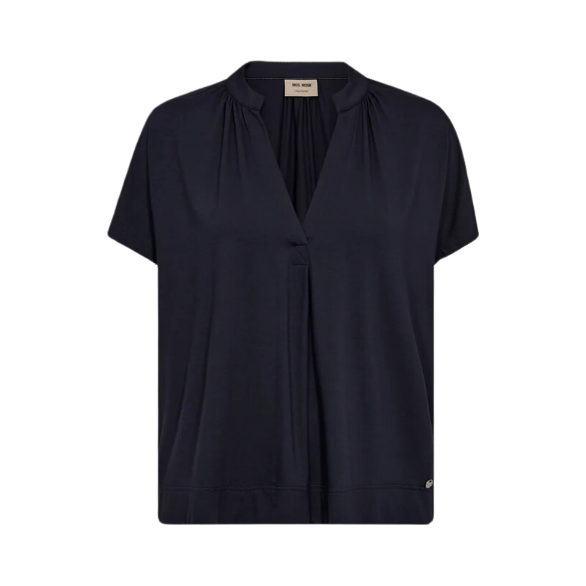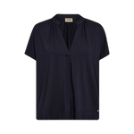 Styckpris / perMörkblå blus från Mos Mosh. Den kortärmade blusen har en lös passform med en smickrande V-ringning. Den är designas med veck framtill som skapar ett elegant fall. Modellen är 175 cm och bär storlek S.