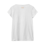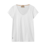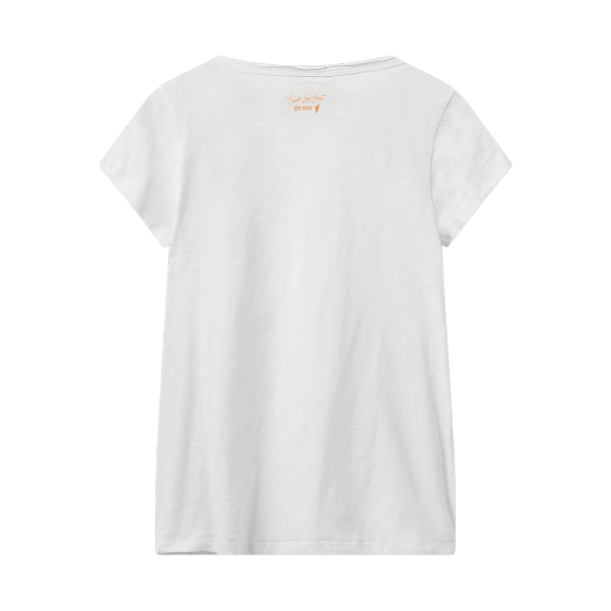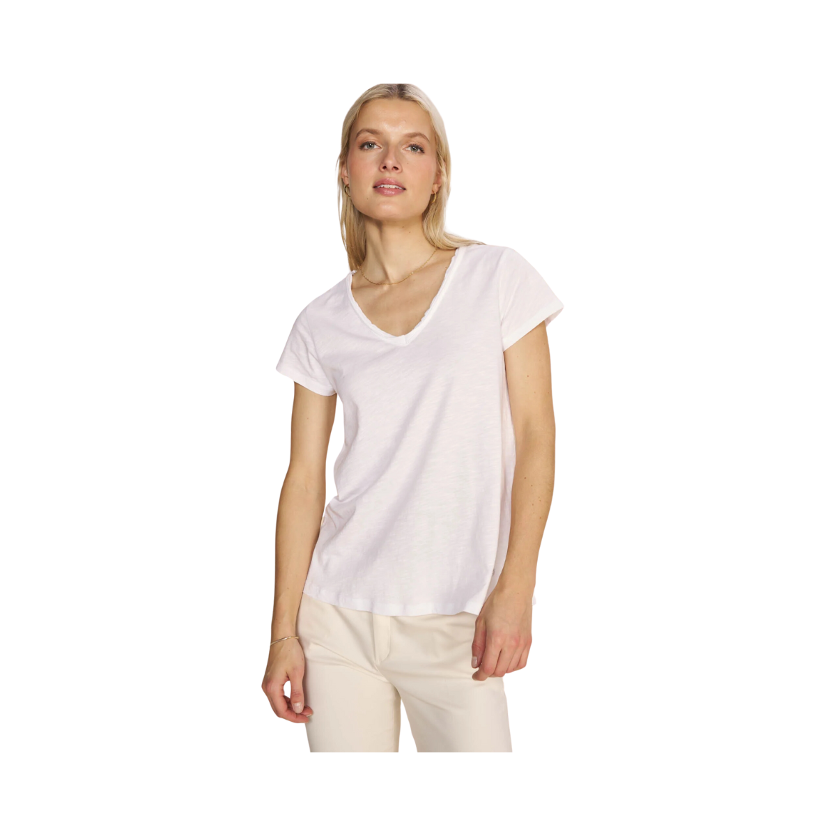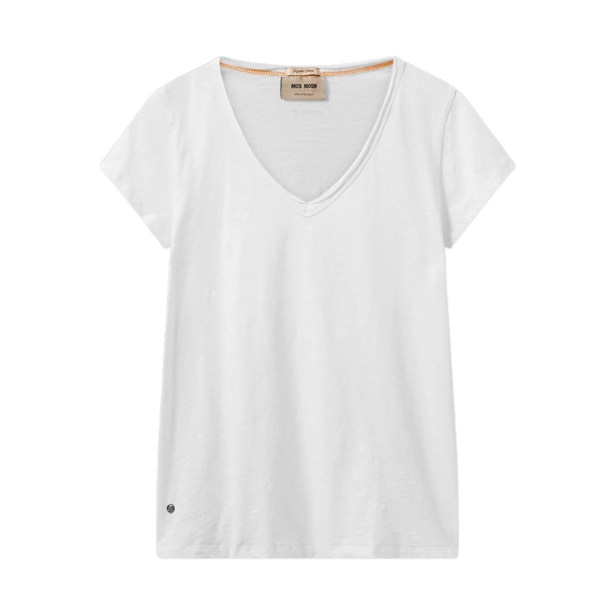 Styckpris / perVit kortärmad T-shirt från Mos Mosh. T-shirten har en avslappnad passform med en bred V-ringning med råa kanter. Den är tillverkad i ekologisk bomull som faller fint.