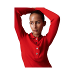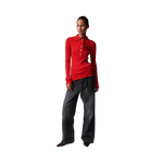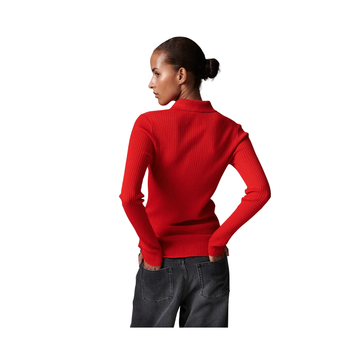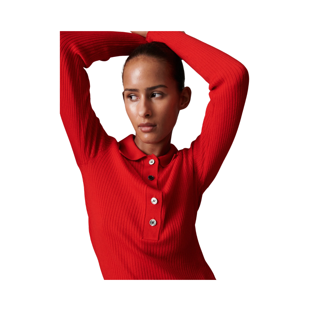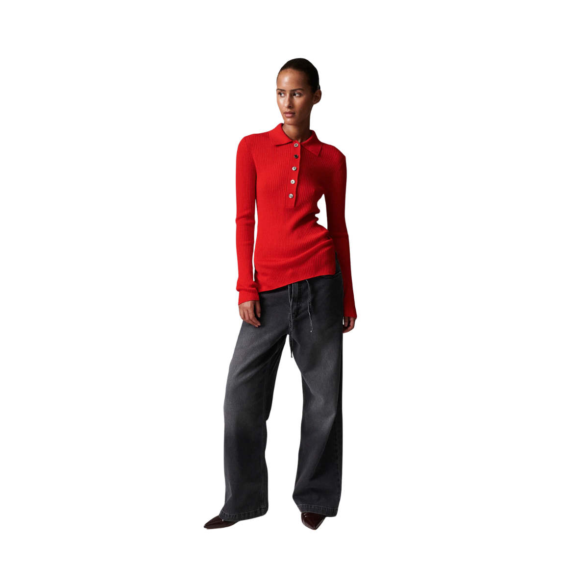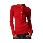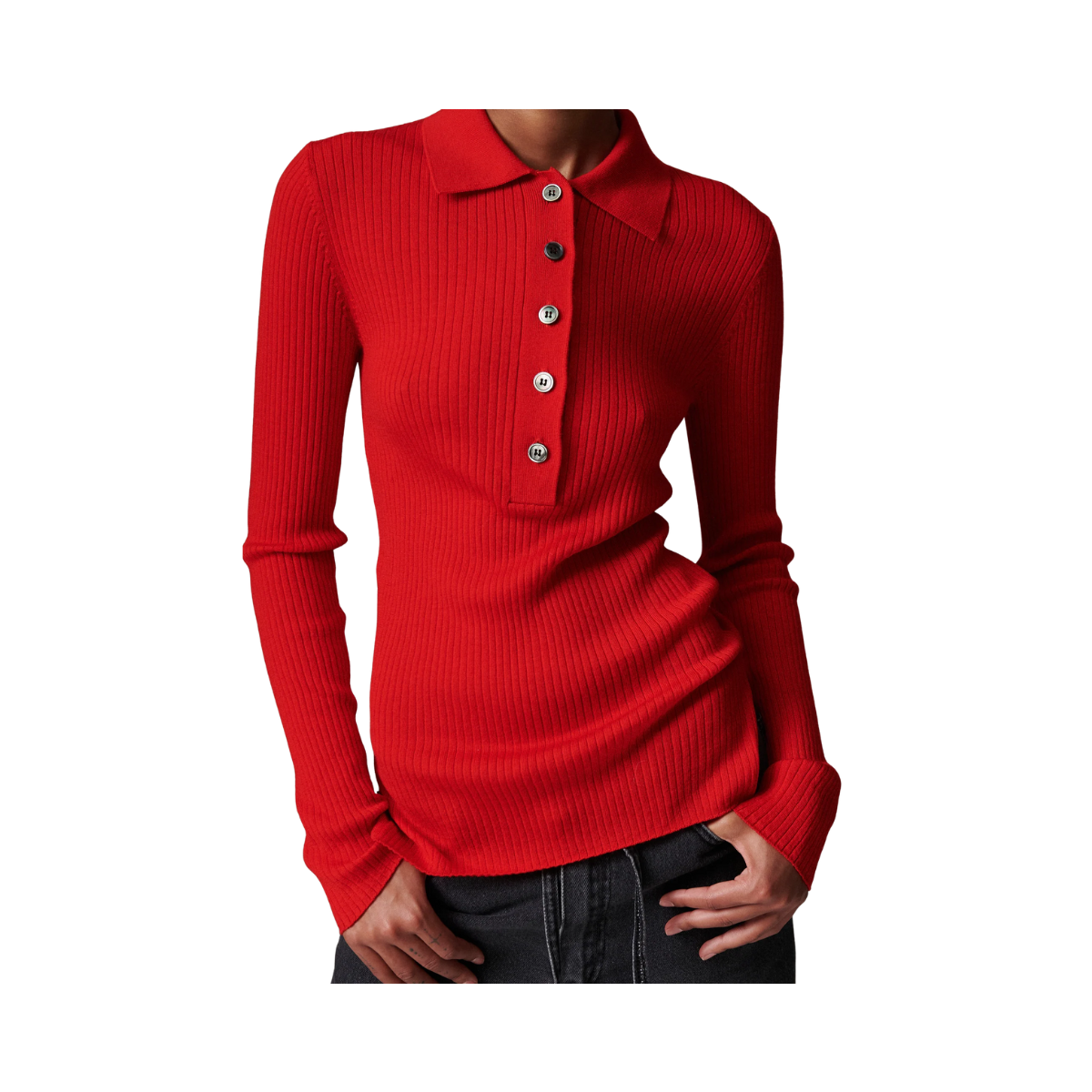 En tunn, ribbad topp med kort krage och knappar vid halsen som ger en stilren detalj. Toppen har en slim fit som framhäver silhuetten och passar perfekt både till vardag och mer uppklädda outfits. Det mjuka, stretchiga materialet gör den bekväm att bära hela dagen.