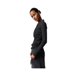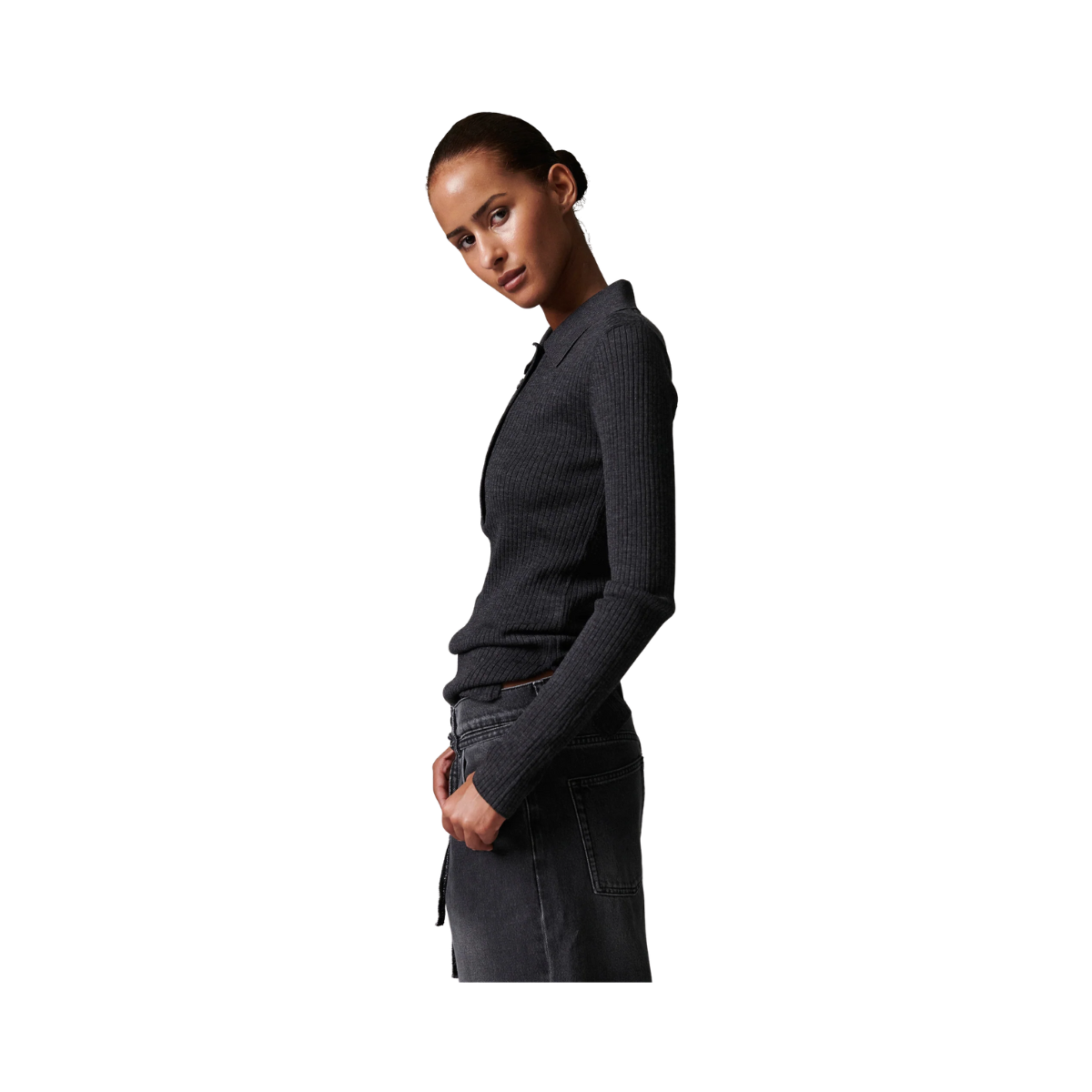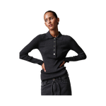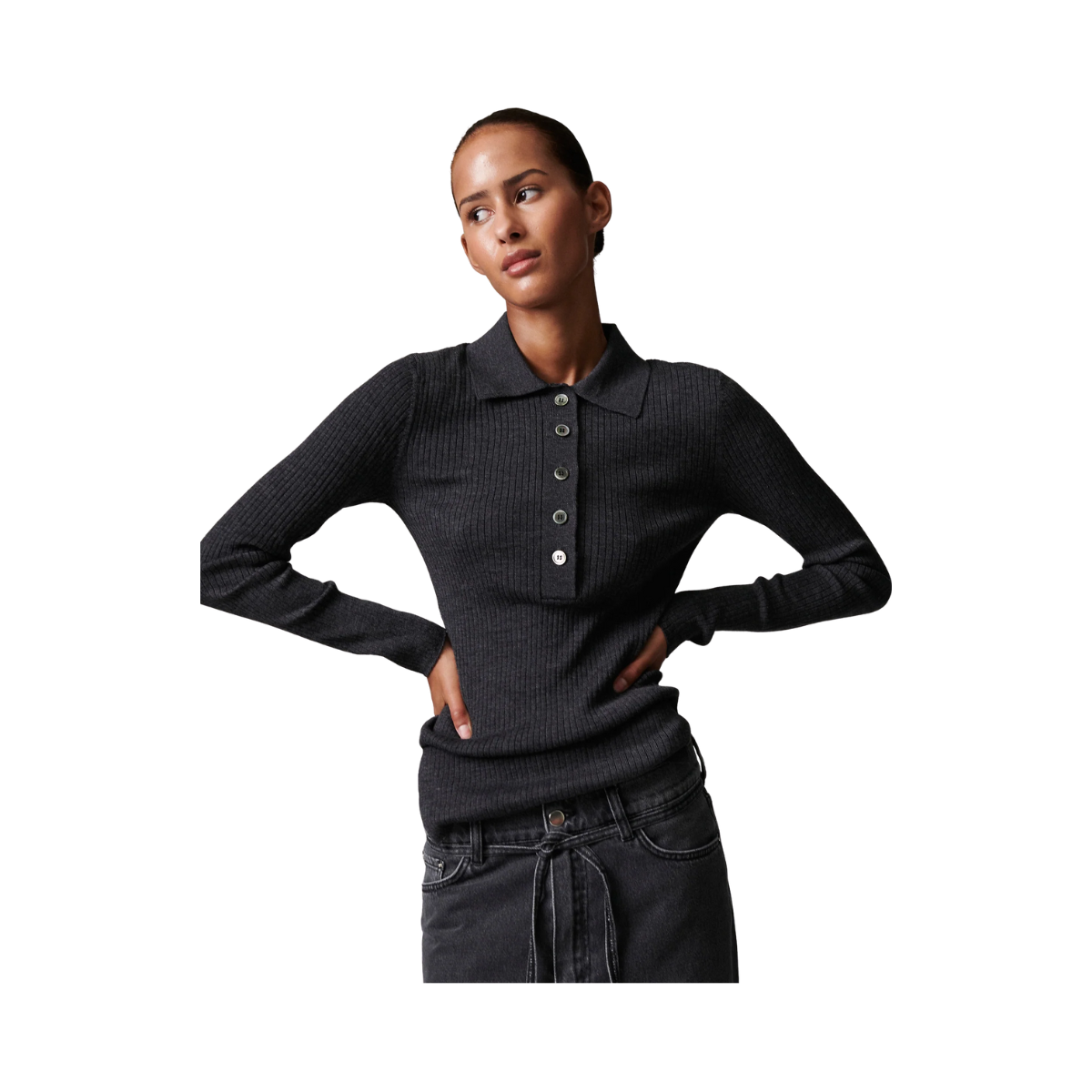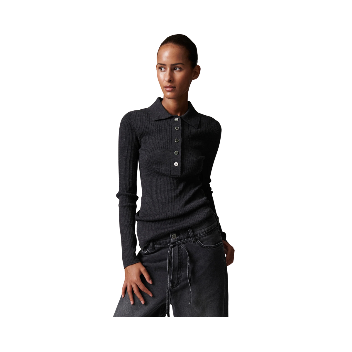 En tunn, ribbad topp med kort krage och knappar vid halsen som ger en stilren detalj. Toppen har en slim fit som framhäver silhuetten och passar perfekt både till vardag och mer uppklädda outfits. Det mjuka, stretchiga materialet gör den bekväm att bära hela dagen.