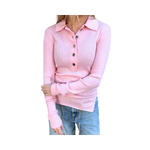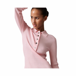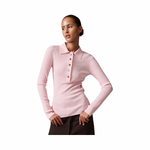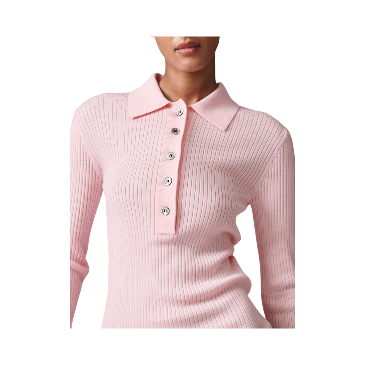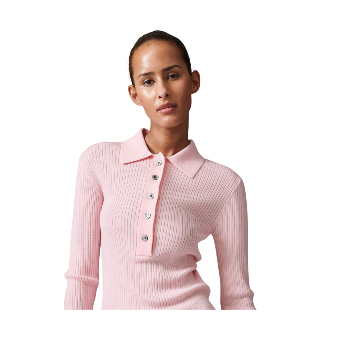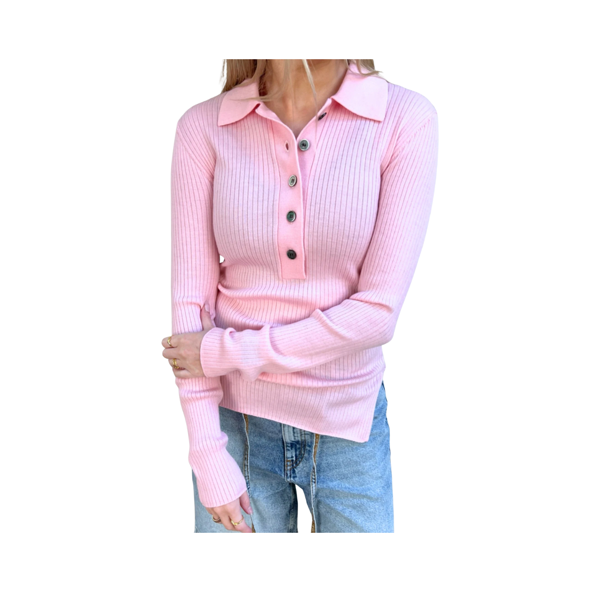 Ribbstickad långärmad tröja i en härlig ljusrosa nyans tillverkad i mjuk merinoull. Tröjan har en krage och 5 knappar framtill. Även detaljerad med små slitsar i sidorna. Ett härligt tillskott till din garderob.