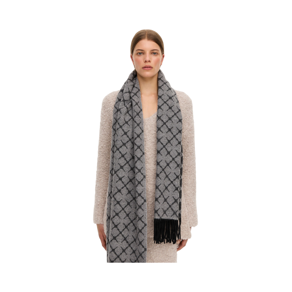 Styckpris / perGrå halsduk från By Malene Birger. Tillverkad i ull. Halsduken håller dig varm under kylliga dagar och har sitt blom signaturmönster överallt.