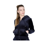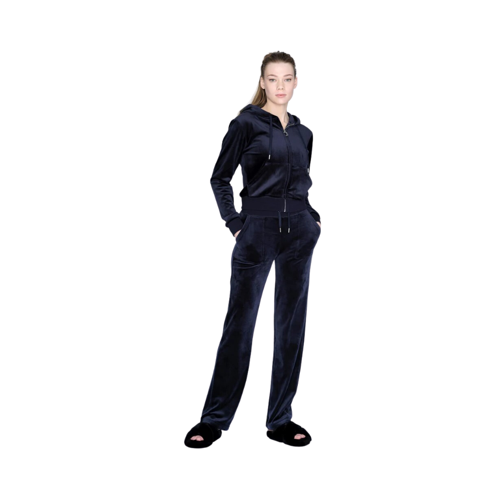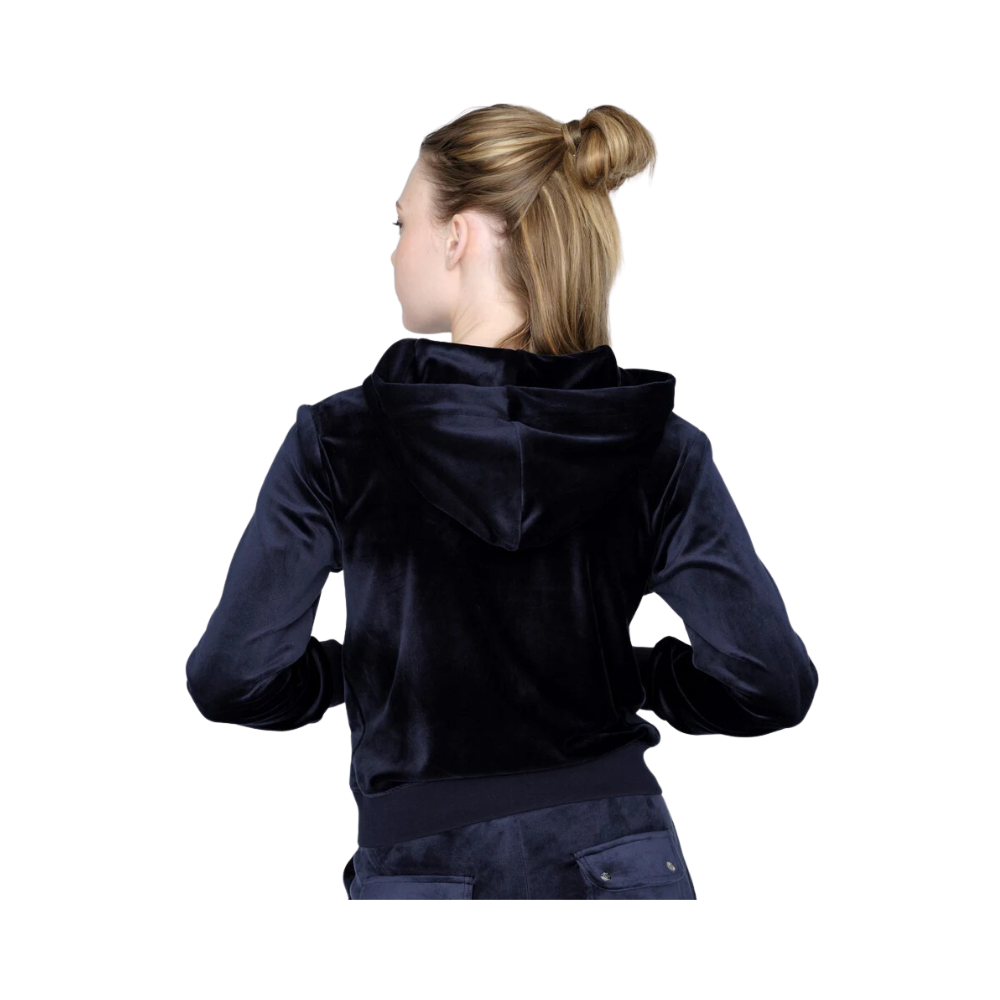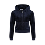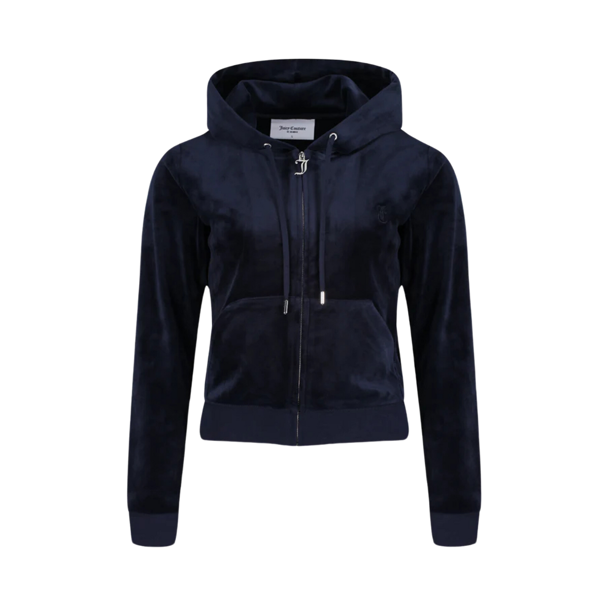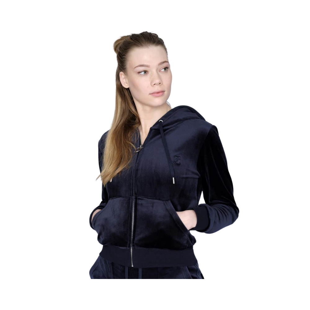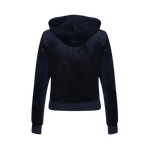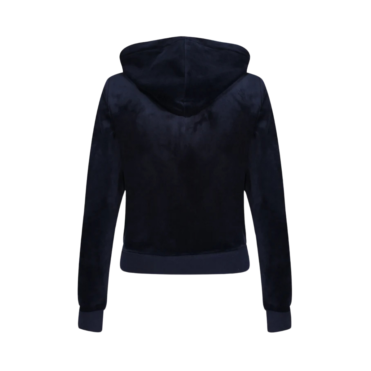 Styckpris / perMörkblå hoddie från Juicy Couture i klassisk velour. Designad i en smalare passform, dragkedja, kängrufickor och en fodrad luva. Dragkedjan är detaljerad med ett gotiskt J och avslutas med en broderad JC-logotyp på bröstet.