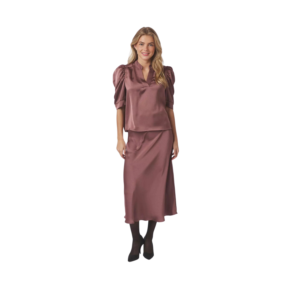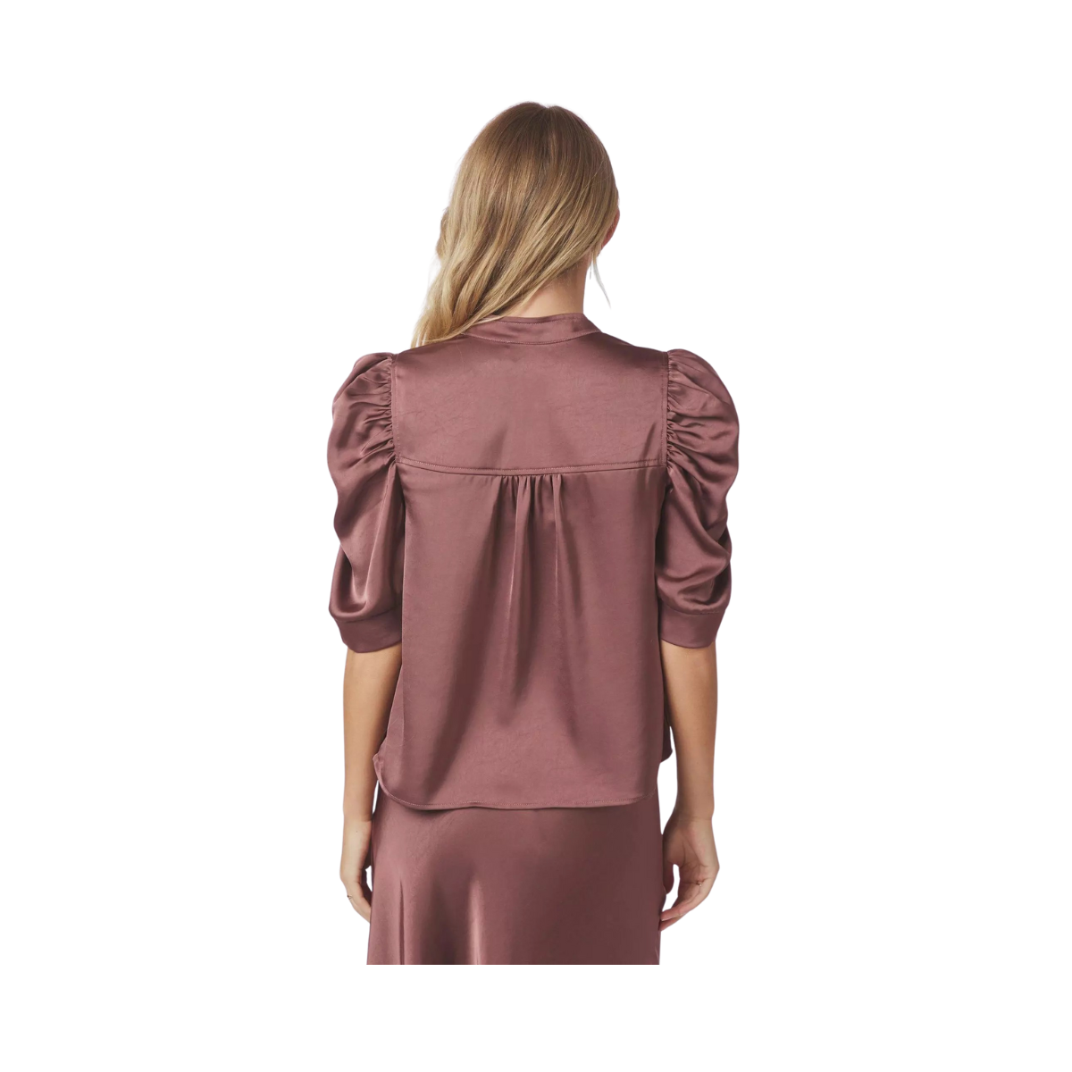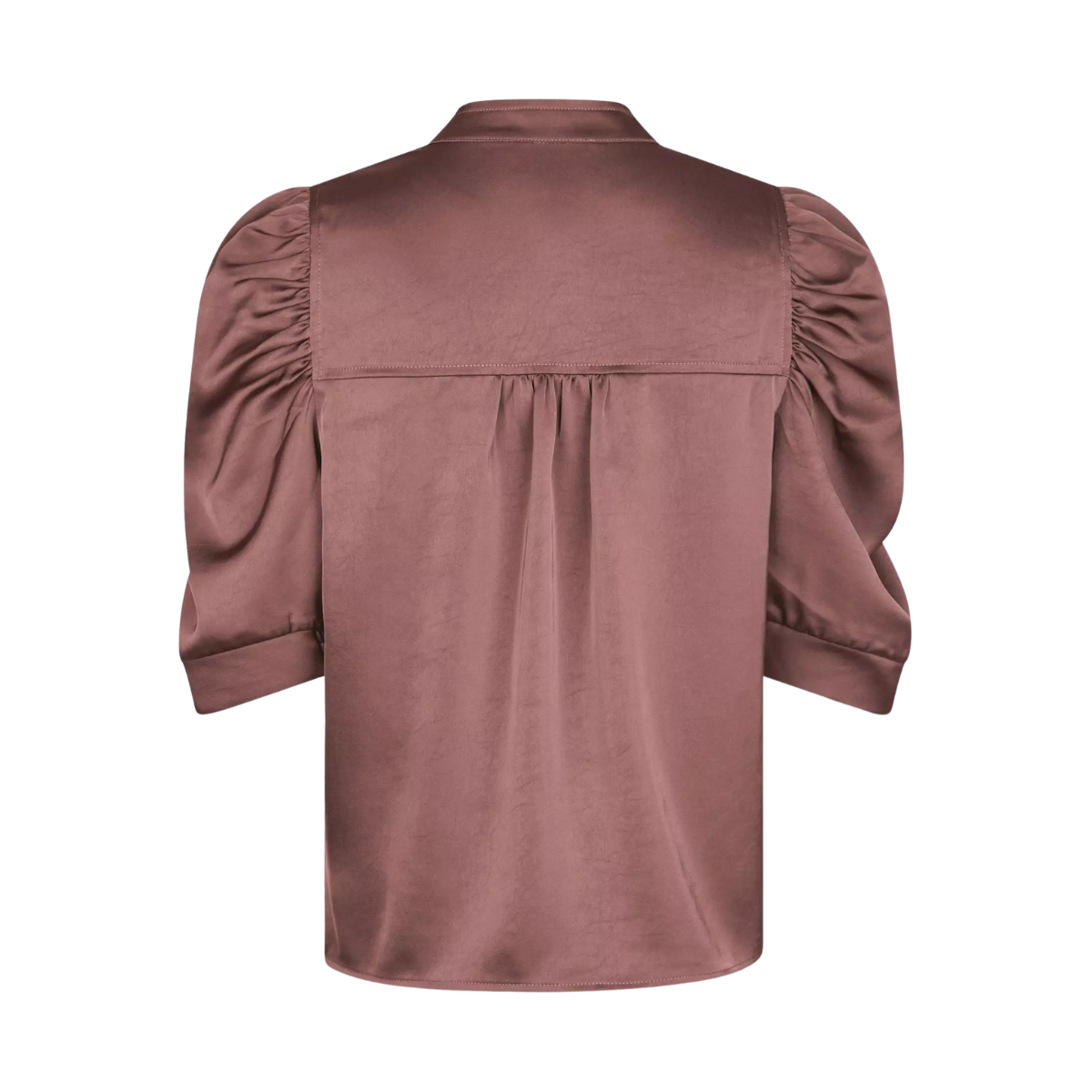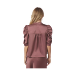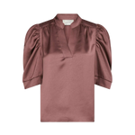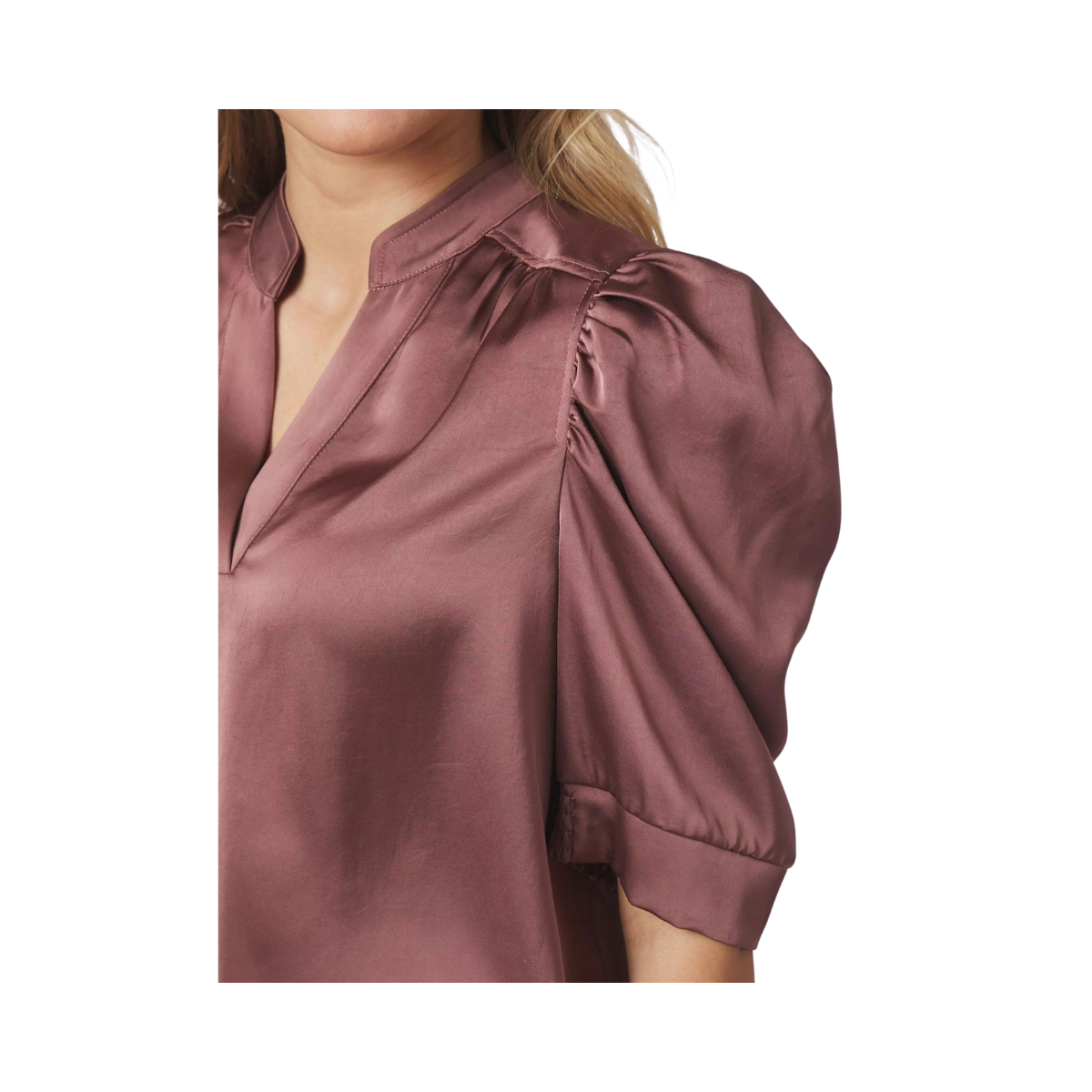 En stilsäker poplinblus med puffig ärm och vacker v-ringning framtill. Baksidan har en diskret rynkdetalj under oket, vilket ger extra rörelse och en fin fallande effekt. Ärmarna avslutas med breda manschetter.