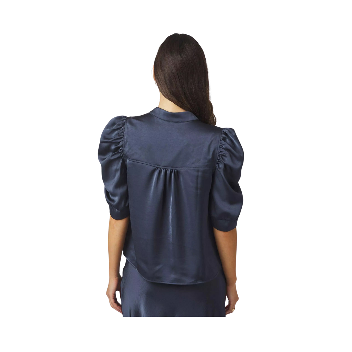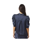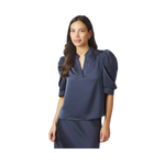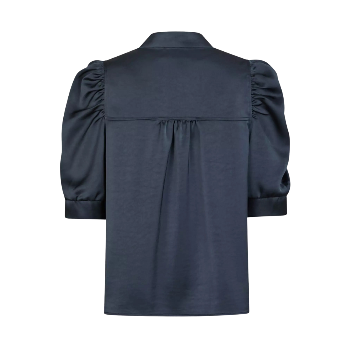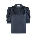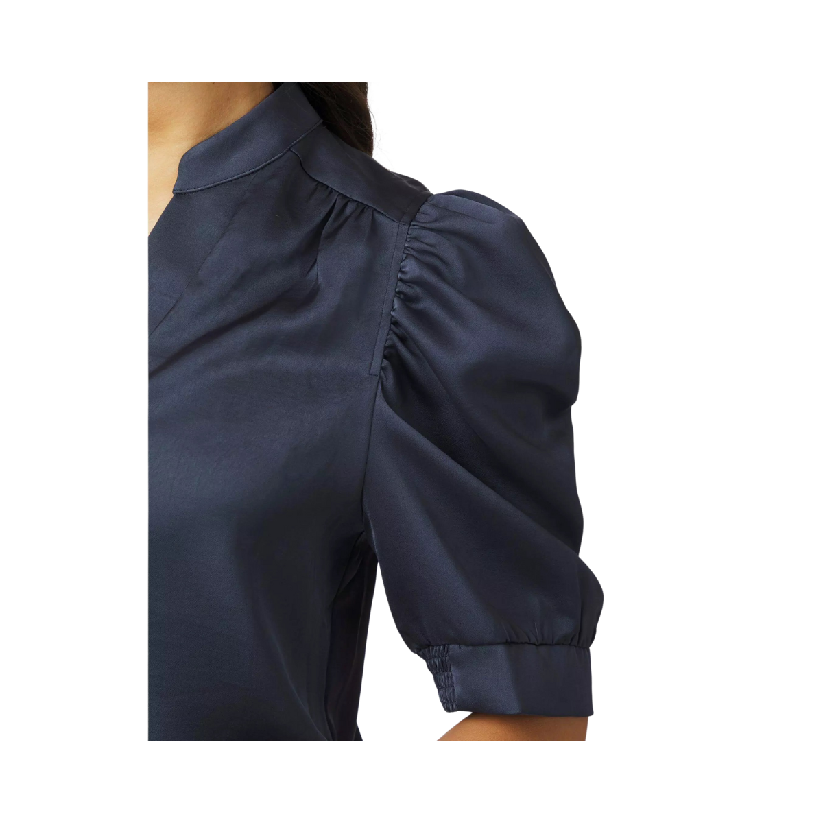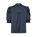 En stilsäker poplinblus med puffig ärm och vacker v-ringning framtill. Baksidan har en diskret rynkdetalj under oket, vilket ger extra rörelse och en fin fallande effekt. Ärmarna avslutas med breda manschetter.