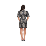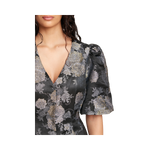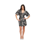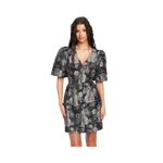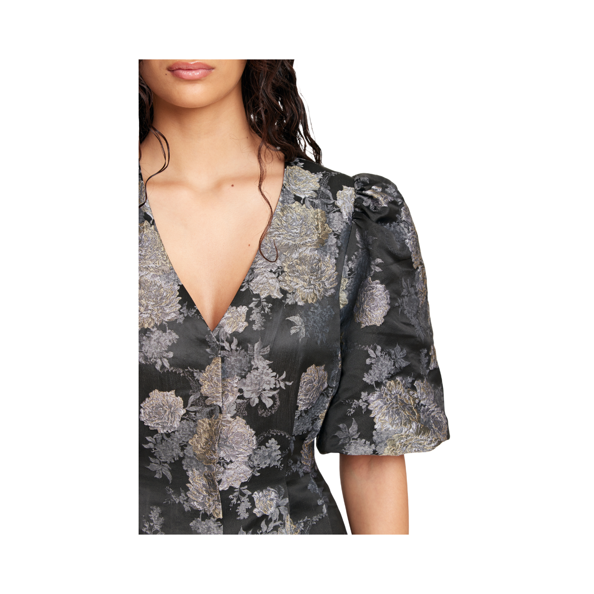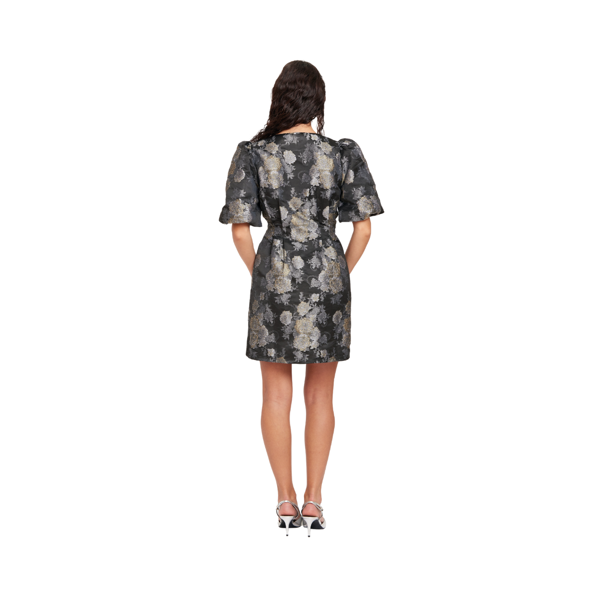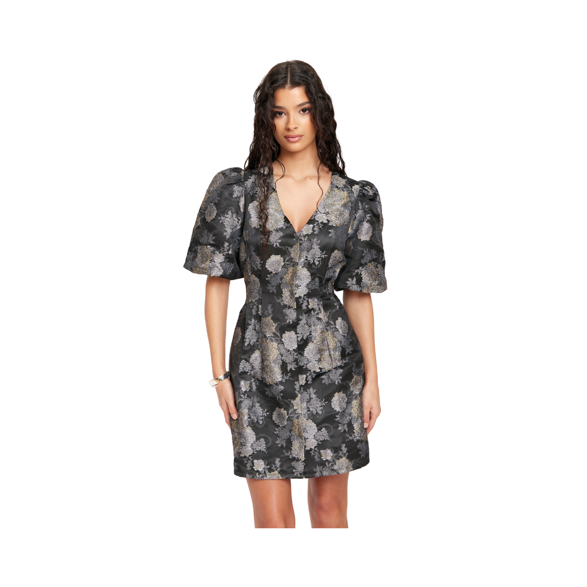 En glittrande klänning med en sofistikerad touch – perfekt för kvällens festligheter. Den korta modellen kombinerar feminin elegans med ett iögonfallande silverblommigt mönster. Klänningen har en smickrande passform med v-ringning, korta puffiga ärmar, markerad midja och knappstängning framtill.