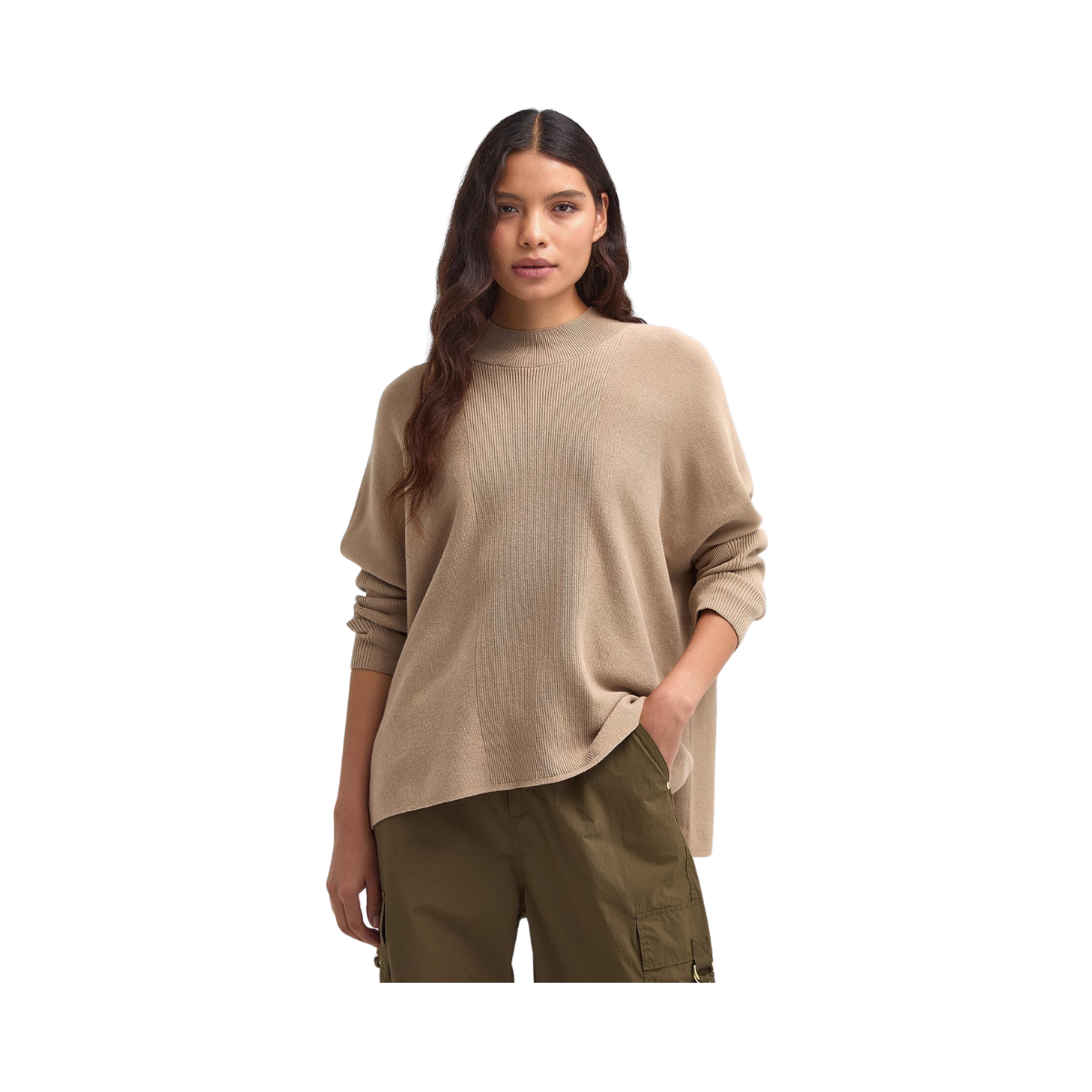Styckpris / perBeige stickad tröja från Barbour. Tröjan har en avslappnad, boxig passform och en långärmad design. Den har en hög elegant krage som värmer under kallare temperaturer. Tröjan har märkta knappar vid sidoslitsarnas överdel.