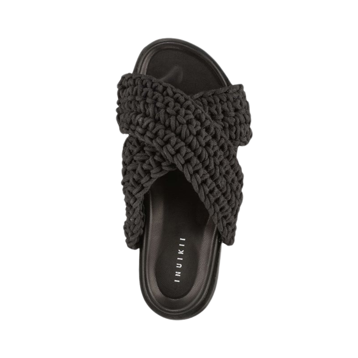Styckpris / perVirkade svarta sandaler från INUIKII. Knutar, vävningar och virkningar är vackra designdetaljer men det är också hållbara bindningar som bäddar in dina fötter säsong efter säsong! Perfekt för sommarklänningen eller till baggybyxor.